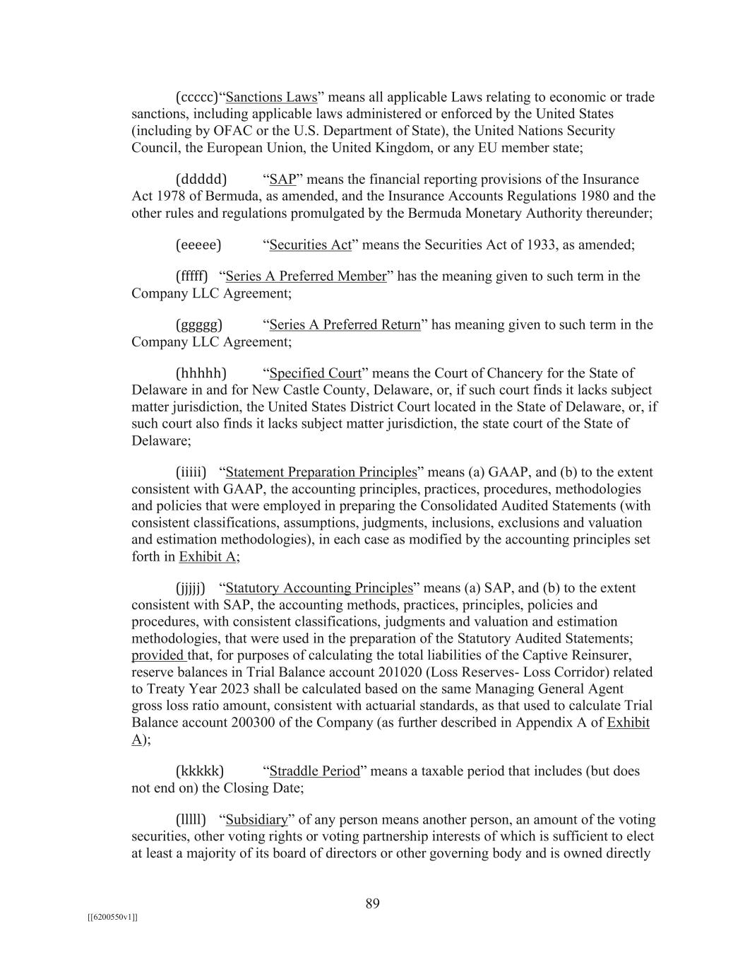 89 [[6200550v1]] “Sanctions Laws” means all applicable Laws relating to economic or trade sanctions, including applicable laws administered or enforced by the United States (including by OFAC or the U.S. Department of State), the United Nations Security Council, the European Union, the United Kingdom, or any EU member state; “SAP” means the financial reporting provisions of the Insurance Act 1978 of Bermuda, as amended, and the Insurance Accounts Regulations 1980 and the other rules and regulations promulgated by the Bermuda Monetary Authority thereunder; “Securities Act” means the Securities Act of 1933, as amended; “Series A Preferred Member” has the meaning given to such term in the Company LLC Agreement; “Series A Preferred Return” has meaning given to such term in the Company LLC Agreement; “Specified Court” means the Court of Chancery for the State of Delaware in and for New Castle County, Delaware, or, if such court finds it lacks subject matter jurisdiction, the United States District Court located in the State of Delaware, or, if such court also finds it lacks subject matter jurisdiction, the state court of the State of Delaware; “Statement Preparation Principles” means (a) GAAP, and (b) to the extent consistent with GAAP, the accounting principles, practices, procedures, methodologies and policies that were employed in preparing the Consolidated Audited Statements (with consistent classifications, assumptions, judgments, inclusions, exclusions and valuation and estimation methodologies), in each case as modified by the accounting principles set forth in Exhibit A; “Statutory Accounting Principles” means (a) SAP, and (b) to the extent consistent with SAP, the accounting methods, practices, principles, policies and procedures, with consistent classifications, judgments and valuation and estimation methodologies, that were used in the preparation of the Statutory Audited Statements; provided that, for purposes of calculating the total liabilities of the Captive Reinsurer, reserve balances in Trial Balance account 201020 (Loss Reserves- Loss Corridor) related to Treaty Year 2023 shall be calculated based on the same Managing General Agent gross loss ratio amount, consistent with actuarial standards, as that used to calculate Trial Balance account 200300 of the Company (as further described in Appendix A of Exhibit A); “Straddle Period” means a taxable period that includes (but does not end on) the Closing Date; “Subsidiary” of any person means another person, an amount of the voting securities, other voting rights or voting partnership interests of which is sufficient to elect at least a majority of its board of directors or other governing body and is owned directly