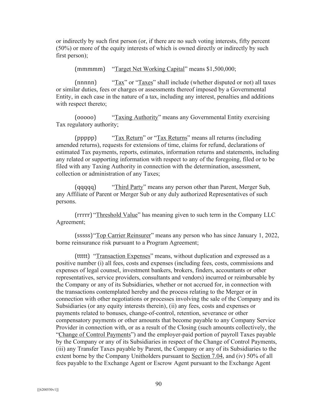 90 [[6200550v1]] or indirectly by such first person (or, if there are no such voting interests, fifty percent (50%) or more of the equity interests of which is owned directly or indirectly by such first person); “Target Net Working Capital” means $1,500,000; “Tax” or “Taxes” shall include (whether disputed or not) all taxes or similar duties, fees or charges or assessments thereof imposed by a Governmental Entity, in each case in the nature of a tax, including any interest, penalties and additions with respect thereto; “Taxing Authority” means any Governmental Entity exercising Tax regulatory authority; “Tax Return” or “Tax Returns” means all returns (including amended returns), requests for extensions of time, claims for refund, declarations of estimated Tax payments, reports, estimates, information returns and statements, including any related or supporting information with respect to any of the foregoing, filed or to be filed with any Taxing Authority in connection with the determination, assessment, collection or administration of any Taxes; “Third Party” means any person other than Parent, Merger Sub, any Affiliate of Parent or Merger Sub or any duly authorized Representatives of such persons. “Threshold Value” has meaning given to such term in the Company LLC Agreement; “Top Carrier Reinsurer” means any person who has since January 1, 2022, borne reinsurance risk pursuant to a Program Agreement; “Transaction Expenses” means, without duplication and expressed as a positive number (i) all fees, costs and expenses (including fees, costs, commissions and expenses of legal counsel, investment bankers, brokers, finders, accountants or other representatives, service providers, consultants and vendors) incurred or reimbursable by the Company or any of its Subsidiaries, whether or not accrued for, in connection with the transactions contemplated hereby and the process relating to the Merger or in connection with other negotiations or processes involving the sale of the Company and its Subsidiaries (or any equity interests therein), (ii) any fees, costs and expenses or payments related to bonuses, change-of-control, retention, severance or other compensatory payments or other amounts that become payable to any Company Service Provider in connection with, or as a result of the Closing (such amounts collectively, the “Change of Control Payments”) and the employer-paid portion of payroll Taxes payable by the Company or any of its Subsidiaries in respect of the Change of Control Payments, (iii) any Transfer Taxes payable by Parent, the Company or any of its Subsidiaries to the extent borne by the Company Unitholders pursuant to Section 7.04, and (iv) 50% of all fees payable to the Exchange Agent or Escrow Agent pursuant to the Exchange Agent