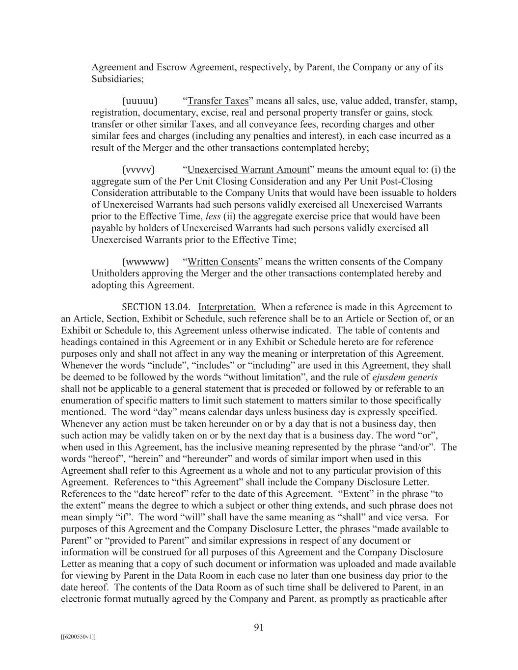 91 [[6200550v1]] Agreement and Escrow Agreement, respectively, by Parent, the Company or any of its Subsidiaries; “Transfer Taxes” means all sales, use, value added, transfer, stamp, registration, documentary, excise, real and personal property transfer or gains, stock transfer or other similar Taxes, and all conveyance fees, recording charges and other similar fees and charges (including any penalties and interest), in each case incurred as a result of the Merger and the other transactions contemplated hereby; “Unexercised Warrant Amount” means the amount equal to: (i) the aggregate sum of the Per Unit Closing Consideration and any Per Unit Post-Closing Consideration attributable to the Company Units that would have been issuable to holders of Unexercised Warrants had such persons validly exercised all Unexercised Warrants prior to the Effective Time, less (ii) the aggregate exercise price that would have been payable by holders of Unexercised Warrants had such persons validly exercised all Unexercised Warrants prior to the Effective Time; “Written Consents” means the written consents of the Company Unitholders approving the Merger and the other transactions contemplated hereby and adopting this Agreement. Interpretation. When a reference is made in this Agreement to an Article, Section, Exhibit or Schedule, such reference shall be to an Article or Section of, or an Exhibit or Schedule to, this Agreement unless otherwise indicated. The table of contents and headings contained in this Agreement or in any Exhibit or Schedule hereto are for reference purposes only and shall not affect in any way the meaning or interpretation of this Agreement. Whenever the words “include”, “includes” or “including” are used in this Agreement, they shall be deemed to be followed by the words “without limitation”, and the rule of ejusdem generis shall not be applicable to a general statement that is preceded or followed by or referable to an enumeration of specific matters to limit such statement to matters similar to those specifically mentioned. The word “day” means calendar days unless business day is expressly specified. Whenever any action must be taken hereunder on or by a day that is not a business day, then such action may be validly taken on or by the next day that is a business day. The word “or”, when used in this Agreement, has the inclusive meaning represented by the phrase “and/or”. The words “hereof”, “herein” and “hereunder” and words of similar import when used in this Agreement shall refer to this Agreement as a whole and not to any particular provision of this Agreement. References to “this Agreement” shall include the Company Disclosure Letter. References to the “date hereof” refer to the date of this Agreement. “Extent” in the phrase “to the extent” means the degree to which a subject or other thing extends, and such phrase does not mean simply “if”. The word “will” shall have the same meaning as “shall” and vice versa. For purposes of this Agreement and the Company Disclosure Letter, the phrases “made available to Parent” or “provided to Parent” and similar expressions in respect of any document or information will be construed for all purposes of this Agreement and the Company Disclosure Letter as meaning that a copy of such document or information was uploaded and made available for viewing by Parent in the Data Room in each case no later than one business day prior to the date hereof. The contents of the Data Room as of such time shall be delivered to Parent, in an electronic format mutually agreed by the Company and Parent, as promptly as practicable after