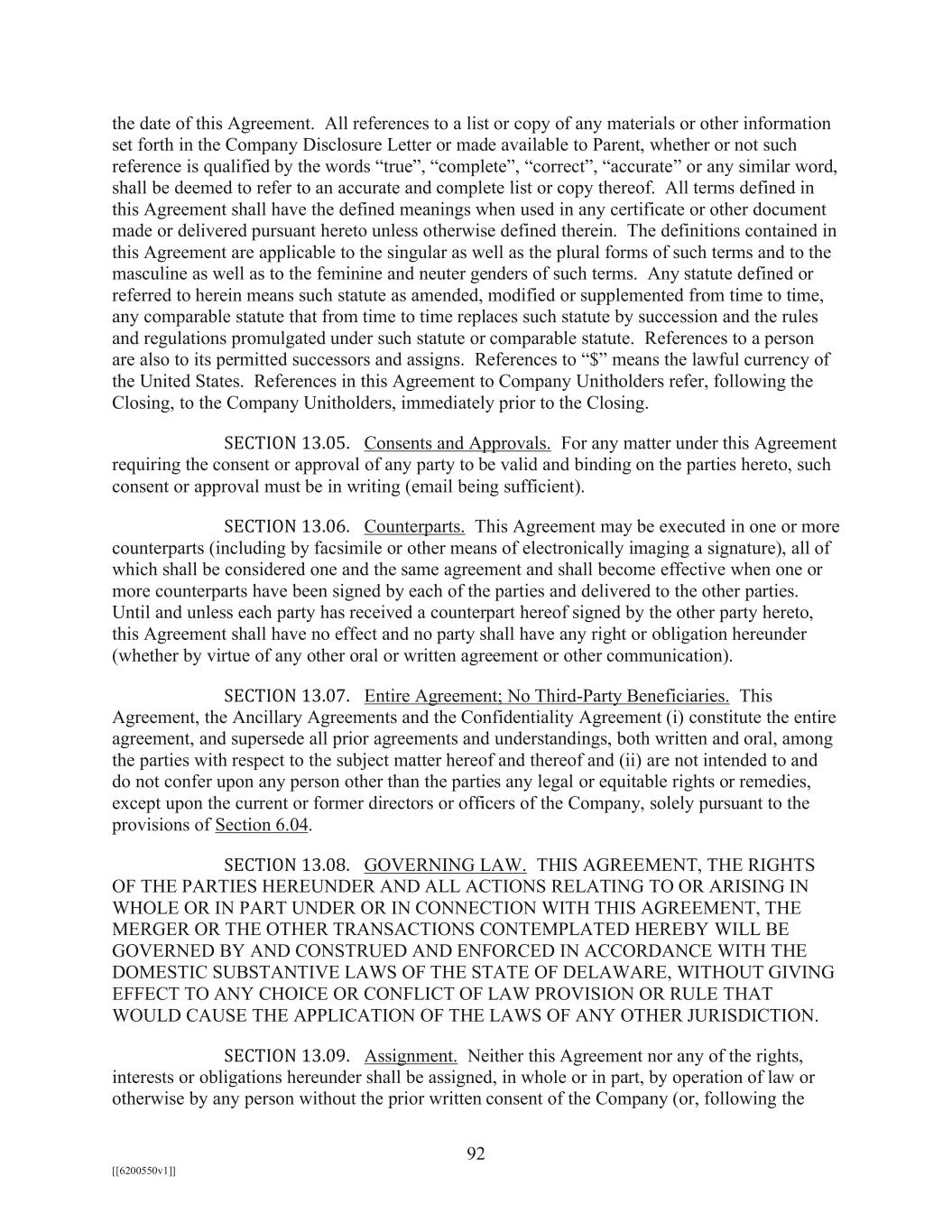 92 [[6200550v1]] the date of this Agreement. All references to a list or copy of any materials or other information set forth in the Company Disclosure Letter or made available to Parent, whether or not such reference is qualified by the words “true”, “complete”, “correct”, “accurate” or any similar word, shall be deemed to refer to an accurate and complete list or copy thereof. All terms defined in this Agreement shall have the defined meanings when used in any certificate or other document made or delivered pursuant hereto unless otherwise defined therein. The definitions contained in this Agreement are applicable to the singular as well as the plural forms of such terms and to the masculine as well as to the feminine and neuter genders of such terms. Any statute defined or referred to herein means such statute as amended, modified or supplemented from time to time, any comparable statute that from time to time replaces such statute by succession and the rules and regulations promulgated under such statute or comparable statute. References to a person are also to its permitted successors and assigns. References to “$” means the lawful currency of the United States. References in this Agreement to Company Unitholders refer, following the Closing, to the Company Unitholders, immediately prior to the Closing. Consents and Approvals. For any matter under this Agreement requiring the consent or approval of any party to be valid and binding on the parties hereto, such consent or approval must be in writing (email being sufficient). Counterparts. This Agreement may be executed in one or more counterparts (including by facsimile or other means of electronically imaging a signature), all of which shall be considered one and the same agreement and shall become effective when one or more counterparts have been signed by each of the parties and delivered to the other parties. Until and unless each party has received a counterpart hereof signed by the other party hereto, this Agreement shall have no effect and no party shall have any right or obligation hereunder (whether by virtue of any other oral or written agreement or other communication). Entire Agreement; No Third-Party Beneficiaries. This Agreement, the Ancillary Agreements and the Confidentiality Agreement (i) constitute the entire agreement, and supersede all prior agreements and understandings, both written and oral, among the parties with respect to the subject matter hereof and thereof and (ii) are not intended to and do not confer upon any person other than the parties any legal or equitable rights or remedies, except upon the current or former directors or officers of the Company, solely pursuant to the provisions of Section 6.04. GOVERNING LAW. THIS AGREEMENT, THE RIGHTS OF THE PARTIES HEREUNDER AND ALL ACTIONS RELATING TO OR ARISING IN WHOLE OR IN PART UNDER OR IN CONNECTION WITH THIS AGREEMENT, THE MERGER OR THE OTHER TRANSACTIONS CONTEMPLATED HEREBY WILL BE GOVERNED BY AND CONSTRUED AND ENFORCED IN ACCORDANCE WITH THE DOMESTIC SUBSTANTIVE LAWS OF THE STATE OF DELAWARE, WITHOUT GIVING EFFECT TO ANY CHOICE OR CONFLICT OF LAW PROVISION OR RULE THAT WOULD CAUSE THE APPLICATION OF THE LAWS OF ANY OTHER JURISDICTION. Assignment. Neither this Agreement nor any of the rights, interests or obligations hereunder shall be assigned, in whole or in part, by operation of law or otherwise by any person without the prior written consent of the Company (or, following the