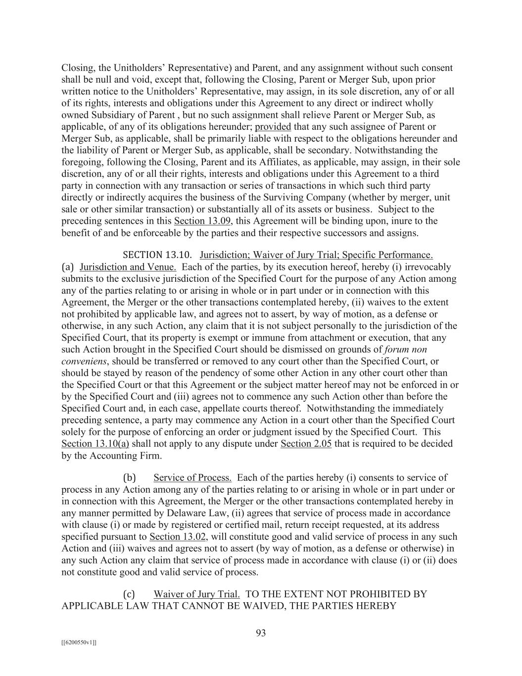 93 [[6200550v1]] Closing, the Unitholders’ Representative) and Parent, and any assignment without such consent shall be null and void, except that, following the Closing, Parent or Merger Sub, upon prior written notice to the Unitholders’ Representative, may assign, in its sole discretion, any of or all of its rights, interests and obligations under this Agreement to any direct or indirect wholly owned Subsidiary of Parent , but no such assignment shall relieve Parent or Merger Sub, as applicable, of any of its obligations hereunder; provided that any such assignee of Parent or Merger Sub, as applicable, shall be primarily liable with respect to the obligations hereunder and the liability of Parent or Merger Sub, as applicable, shall be secondary. Notwithstanding the foregoing, following the Closing, Parent and its Affiliates, as applicable, may assign, in their sole discretion, any of or all their rights, interests and obligations under this Agreement to a third party in connection with any transaction or series of transactions in which such third party directly or indirectly acquires the business of the Surviving Company (whether by merger, unit sale or other similar transaction) or substantially all of its assets or business. Subject to the preceding sentences in this Section 13.09, this Agreement will be binding upon, inure to the benefit of and be enforceable by the parties and their respective successors and assigns. Jurisdiction; Waiver of Jury Trial; Specific Performance. Jurisdiction and Venue. Each of the parties, by its execution hereof, hereby (i) irrevocably submits to the exclusive jurisdiction of the Specified Court for the purpose of any Action among any of the parties relating to or arising in whole or in part under or in connection with this Agreement, the Merger or the other transactions contemplated hereby, (ii) waives to the extent not prohibited by applicable law, and agrees not to assert, by way of motion, as a defense or otherwise, in any such Action, any claim that it is not subject personally to the jurisdiction of the Specified Court, that its property is exempt or immune from attachment or execution, that any such Action brought in the Specified Court should be dismissed on grounds of forum non conveniens, should be transferred or removed to any court other than the Specified Court, or should be stayed by reason of the pendency of some other Action in any other court other than the Specified Court or that this Agreement or the subject matter hereof may not be enforced in or by the Specified Court and (iii) agrees not to commence any such Action other than before the Specified Court and, in each case, appellate courts thereof. Notwithstanding the immediately preceding sentence, a party may commence any Action in a court other than the Specified Court solely for the purpose of enforcing an order or judgment issued by the Specified Court. This Section 13.10(a) shall not apply to any dispute under Section 2.05 that is required to be decided by the Accounting Firm. Service of Process. Each of the parties hereby (i) consents to service of process in any Action among any of the parties relating to or arising in whole or in part under or in connection with this Agreement, the Merger or the other transactions contemplated hereby in any manner permitted by Delaware Law, (ii) agrees that service of process made in accordance with clause (i) or made by registered or certified mail, return receipt requested, at its address specified pursuant to Section 13.02, will constitute good and valid service of process in any such Action and (iii) waives and agrees not to assert (by way of motion, as a defense or otherwise) in any such Action any claim that service of process made in accordance with clause (i) or (ii) does not constitute good and valid service of process. Waiver of Jury Trial. TO THE EXTENT NOT PROHIBITED BY APPLICABLE LAW THAT CANNOT BE WAIVED, THE PARTIES HEREBY