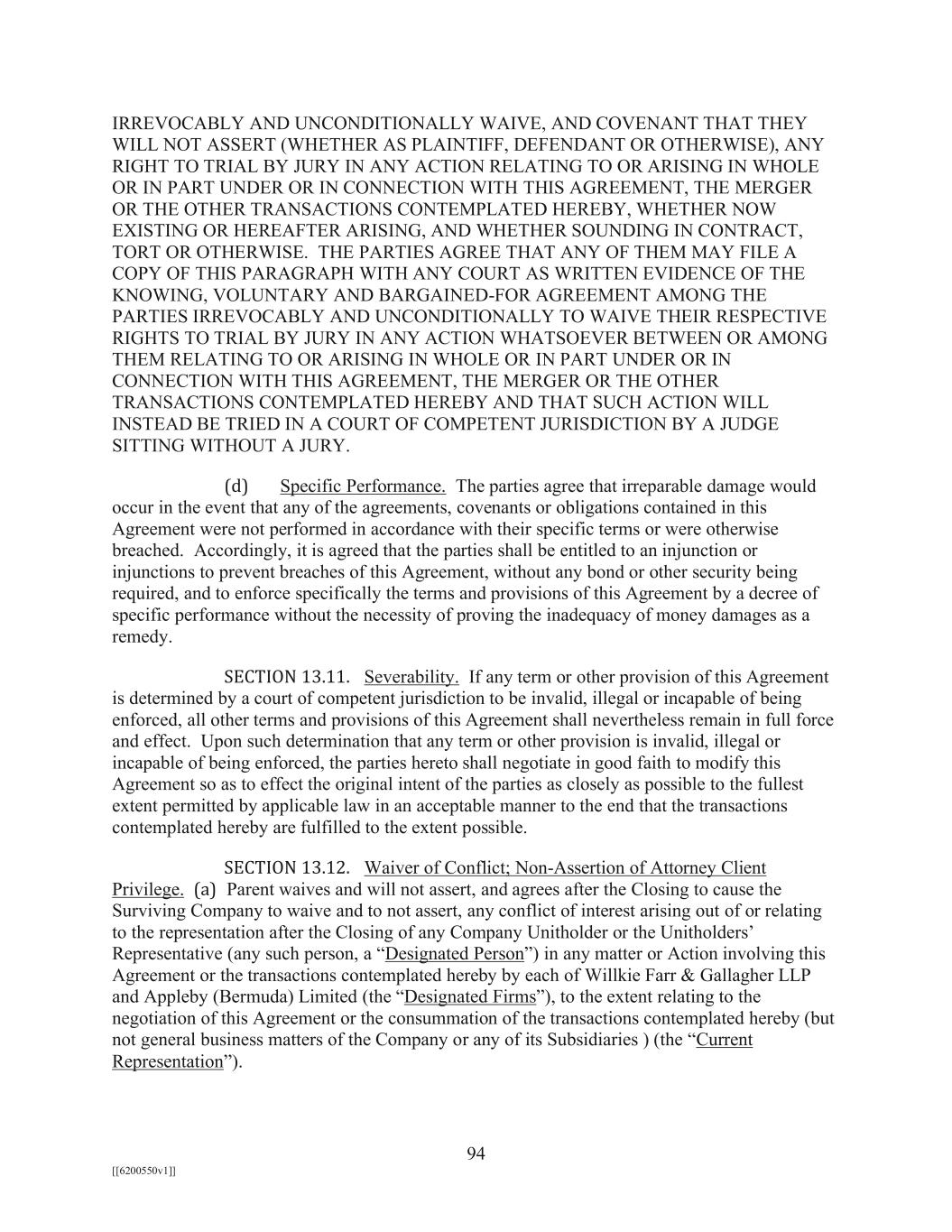 94 [[6200550v1]] IRREVOCABLY AND UNCONDITIONALLY WAIVE, AND COVENANT THAT THEY WILL NOT ASSERT (WHETHER AS PLAINTIFF, DEFENDANT OR OTHERWISE), ANY RIGHT TO TRIAL BY JURY IN ANY ACTION RELATING TO OR ARISING IN WHOLE OR IN PART UNDER OR IN CONNECTION WITH THIS AGREEMENT, THE MERGER OR THE OTHER TRANSACTIONS CONTEMPLATED HEREBY, WHETHER NOW EXISTING OR HEREAFTER ARISING, AND WHETHER SOUNDING IN CONTRACT, TORT OR OTHERWISE. THE PARTIES AGREE THAT ANY OF THEM MAY FILE A COPY OF THIS PARAGRAPH WITH ANY COURT AS WRITTEN EVIDENCE OF THE KNOWING, VOLUNTARY AND BARGAINED-FOR AGREEMENT AMONG THE PARTIES IRREVOCABLY AND UNCONDITIONALLY TO WAIVE THEIR RESPECTIVE RIGHTS TO TRIAL BY JURY IN ANY ACTION WHATSOEVER BETWEEN OR AMONG THEM RELATING TO OR ARISING IN WHOLE OR IN PART UNDER OR IN CONNECTION WITH THIS AGREEMENT, THE MERGER OR THE OTHER TRANSACTIONS CONTEMPLATED HEREBY AND THAT SUCH ACTION WILL INSTEAD BE TRIED IN A COURT OF COMPETENT JURISDICTION BY A JUDGE SITTING WITHOUT A JURY. Specific Performance. The parties agree that irreparable damage would occur in the event that any of the agreements, covenants or obligations contained in this Agreement were not performed in accordance with their specific terms or were otherwise breached. Accordingly, it is agreed that the parties shall be entitled to an injunction or injunctions to prevent breaches of this Agreement, without any bond or other security being required, and to enforce specifically the terms and provisions of this Agreement by a decree of specific performance without the necessity of proving the inadequacy of money damages as a remedy. Severability. If any term or other provision of this Agreement is determined by a court of competent jurisdiction to be invalid, illegal or incapable of being enforced, all other terms and provisions of this Agreement shall nevertheless remain in full force and effect. Upon such determination that any term or other provision is invalid, illegal or incapable of being enforced, the parties hereto shall negotiate in good faith to modify this Agreement so as to effect the original intent of the parties as closely as possible to the fullest extent permitted by applicable law in an acceptable manner to the end that the transactions contemplated hereby are fulfilled to the extent possible. Waiver of Conflict; Non-Assertion of Attorney Client Privilege. Parent waives and will not assert, and agrees after the Closing to cause the Surviving Company to waive and to not assert, any conflict of interest arising out of or relating to the representation after the Closing of any Company Unitholder or the Unitholders’ Representative (any such person, a “Designated Person”) in any matter or Action involving this Agreement or the transactions contemplated hereby by each of Willkie Farr & Gallagher LLP and Appleby (Bermuda) Limited (the “Designated Firms”), to the extent relating to the negotiation of this Agreement or the consummation of the transactions contemplated hereby (but not general business matters of the Company or any of its Subsidiaries ) (the “Current Representation”).