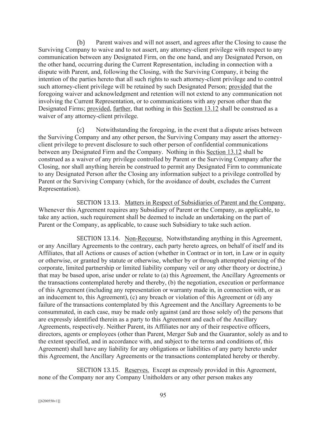95 [[6200550v1]] Parent waives and will not assert, and agrees after the Closing to cause the Surviving Company to waive and to not assert, any attorney-client privilege with respect to any communication between any Designated Firm, on the one hand, and any Designated Person, on the other hand, occurring during the Current Representation, including in connection with a dispute with Parent, and, following the Closing, with the Surviving Company, it being the intention of the parties hereto that all such rights to such attorney-client privilege and to control such attorney-client privilege will be retained by such Designated Person; provided that the foregoing waiver and acknowledgment and retention will not extend to any communication not involving the Current Representation, or to communications with any person other than the Designated Firms; provided, further, that nothing in this Section 13.12 shall be construed as a waiver of any attorney-client privilege. Notwithstanding the foregoing, in the event that a dispute arises between the Surviving Company and any other person, the Surviving Company may assert the attorney- client privilege to prevent disclosure to such other person of confidential communications between any Designated Firm and the Company. Nothing in this Section 13.12 shall be construed as a waiver of any privilege controlled by Parent or the Surviving Company after the Closing, nor shall anything herein be construed to permit any Designated Firm to communicate to any Designated Person after the Closing any information subject to a privilege controlled by Parent or the Surviving Company (which, for the avoidance of doubt, excludes the Current Representation). Matters in Respect of Subsidiaries of Parent and the Company. Whenever this Agreement requires any Subsidiary of Parent or the Company, as applicable, to take any action, such requirement shall be deemed to include an undertaking on the part of Parent or the Company, as applicable, to cause such Subsidiary to take such action. Non-Recourse. Notwithstanding anything in this Agreement, or any Ancillary Agreements to the contrary, each party hereto agrees, on behalf of itself and its Affiliates, that all Actions or causes of action (whether in Contract or in tort, in Law or in equity or otherwise, or granted by statute or otherwise, whether by or through attempted piercing of the corporate, limited partnership or limited liability company veil or any other theory or doctrine,) that may be based upon, arise under or relate to (a) this Agreement, the Ancillary Agreements or the transactions contemplated hereby and thereby, (b) the negotiation, execution or performance of this Agreement (including any representation or warranty made in, in connection with, or as an inducement to, this Agreement), (c) any breach or violation of this Agreement or (d) any failure of the transactions contemplated by this Agreement and the Ancillary Agreements to be consummated, in each case, may be made only against (and are those solely of) the persons that are expressly identified therein as a party to this Agreement and each of the Ancillary Agreements, respectively. Neither Parent, its Affiliates nor any of their respective officers, directors, agents or employees (other than Parent, Merger Sub and the Guarantor, solely as and to the extent specified, and in accordance with, and subject to the terms and conditions of, this Agreement) shall have any liability for any obligations or liabilities of any party hereto under this Agreement, the Ancillary Agreements or the transactions contemplated hereby or thereby. Reserves. Except as expressly provided in this Agreement, none of the Company nor any Company Unitholders or any other person makes any