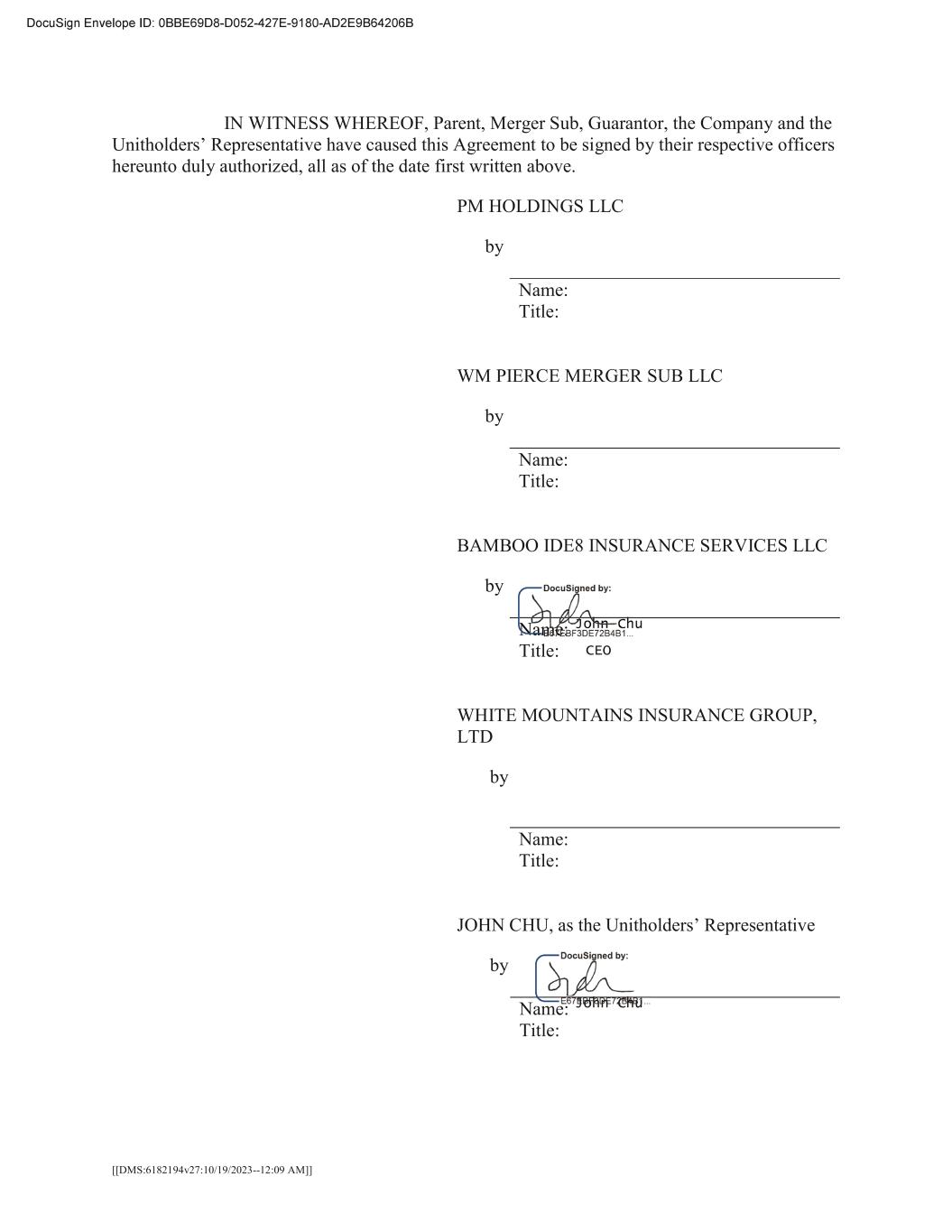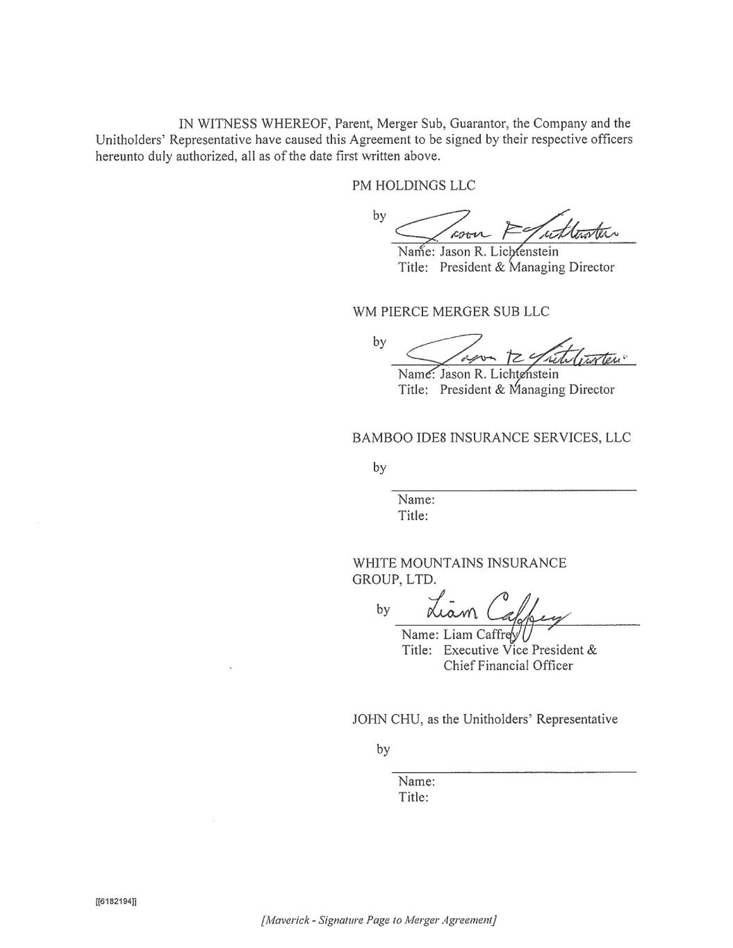 [[DMS:6182194v27:10/19/2023--12:09 AM]] IN WITNESS WHEREOF, Parent, Merger Sub, Guarantor, the Company and the Unitholders’ Representative have caused this Agreement to be signed by their respective officers hereunto duly authorized, all as of the date first written above. PM HOLDINGS LLC by Name: Title: WM PIERCE MERGER SUB LLC by Name: Title: BAMBOO IDE8 INSURANCE SERVICES LLC by Name: Title: WHITE MOUNTAINS INSURANCE GROUP, LTD by Name: Title: JOHN CHU, as the Unitholders’ Representative by Name: Title: