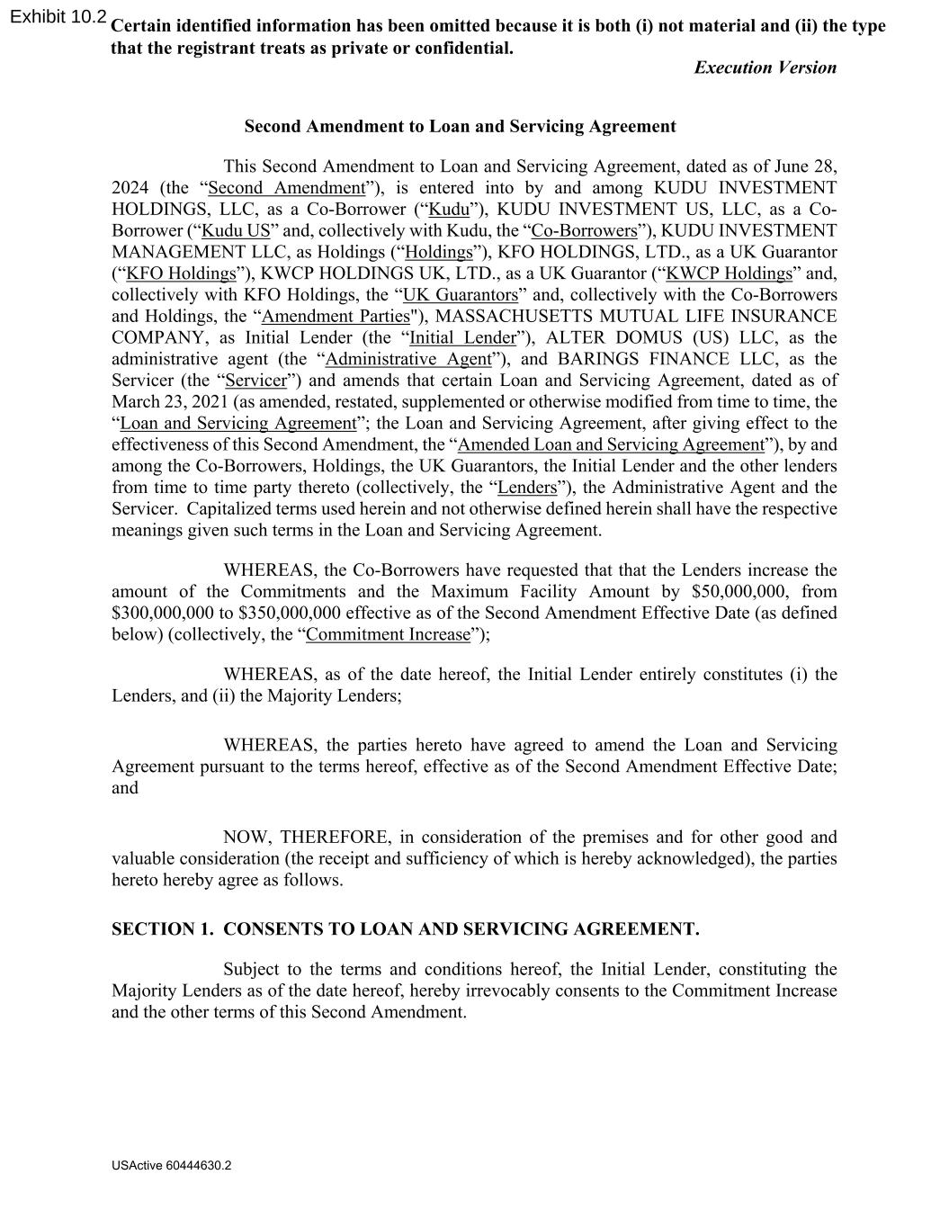 Execution Version USActive 60444630.2 Second Amendment to Loan and Servicing Agreement This Second Amendment to Loan and Servicing Agreement, dated as of June 28, 2024 (the “Second Amendment”), is entered into by and among KUDU INVESTMENT HOLDINGS, LLC, as a Co-Borrower (“Kudu”), KUDU INVESTMENT US, LLC, as a Co- Borrower (“Kudu US” and, collectively with Kudu, the “Co-Borrowers”), KUDU INVESTMENT MANAGEMENT LLC, as Holdings (“Holdings”), KFO HOLDINGS, LTD., as a UK Guarantor (“KFO Holdings”), KWCP HOLDINGS UK, LTD., as a UK Guarantor (“KWCP Holdings” and, collectively with KFO Holdings, the “UK Guarantors” and, collectively with the Co-Borrowers and Holdings, the “Amendment Parties"), MASSACHUSETTS MUTUAL LIFE INSURANCE COMPANY, as Initial Lender (the “Initial Lender”), ALTER DOMUS (US) LLC, as the administrative agent (the “Administrative Agent”), and BARINGS FINANCE LLC, as the Servicer (the “Servicer”) and amends that certain Loan and Servicing Agreement, dated as of March 23, 2021 (as amended, restated, supplemented or otherwise modified from time to time, the “Loan and Servicing Agreement”; the Loan and Servicing Agreement, after giving effect to the effectiveness of this Second Amendment, the “Amended Loan and Servicing Agreement”), by and among the Co-Borrowers, Holdings, the UK Guarantors, the Initial Lender and the other lenders from time to time party thereto (collectively, the “Lenders”), the Administrative Agent and the Servicer. Capitalized terms used herein and not otherwise defined herein shall have the respective meanings given such terms in the Loan and Servicing Agreement. WHEREAS, the Co-Borrowers have requested that that the Lenders increase the amount of the Commitments and the Maximum Facility Amount by $50,000,000, from $300,000,000 to $350,000,000 effective as of the Second Amendment Effective Date (as defined below) (collectively, the “Commitment Increase”); WHEREAS, as of the date hereof, the Initial Lender entirely constitutes (i) the Lenders, and (ii) the Majority Lenders; WHEREAS, the parties hereto have agreed to amend the Loan and Servicing Agreement pursuant to the terms hereof, effective as of the Second Amendment Effective Date; and NOW, THEREFORE, in consideration of the premises and for other good and valuable consideration (the receipt and sufficiency of which is hereby acknowledged), the parties hereto hereby agree as follows. SECTION 1. CONSENTS TO LOAN AND SERVICING AGREEMENT. Subject to the terms and conditions hereof, the Initial Lender, constituting the Majority Lenders as of the date hereof, hereby irrevocably consents to the Commitment Increase and the other terms of this Second Amendment. Certain identified information has been omitted because it is both (i) not material and (ii) the type that the registrant treats as private or confidential.