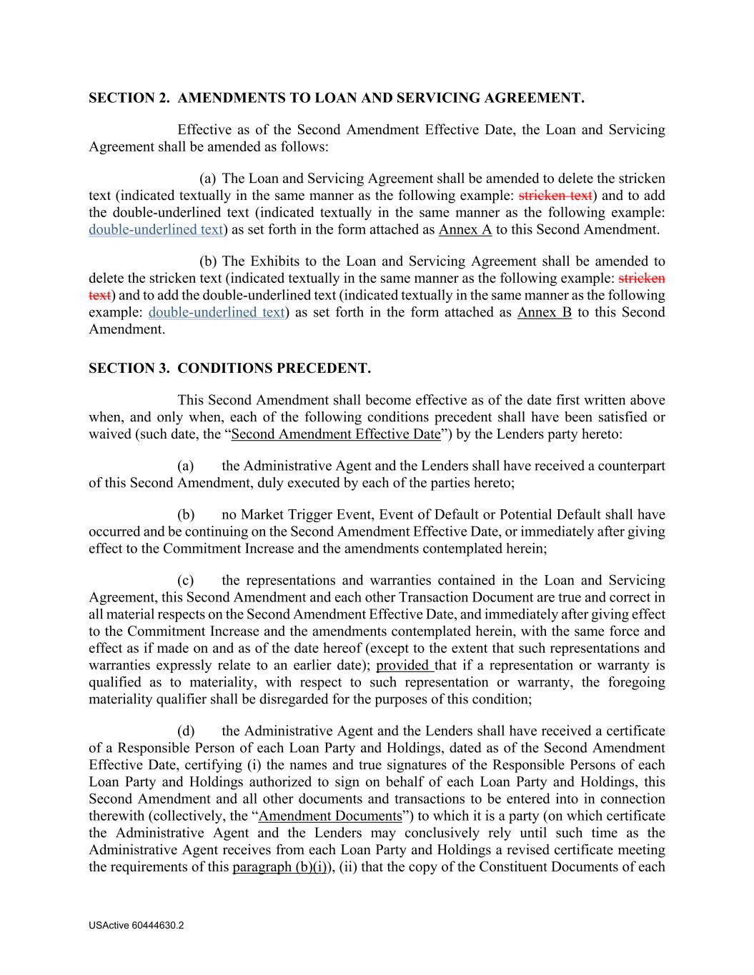 USActive 60444630.2 SECTION 2. AMENDMENTS TO LOAN AND SERVICING AGREEMENT. Effective as of the Second Amendment Effective Date, the Loan and Servicing Agreement shall be amended as follows: (a) The Loan and Servicing Agreement shall be amended to delete the stricken text (indicated textually in the same manner as the following example: stricken text) and to add the double‐underlined text (indicated textually in the same manner as the following example: double‐underlined text) as set forth in the form attached as Annex A to this Second Amendment. (b) The Exhibits to the Loan and Servicing Agreement shall be amended to delete the stricken text (indicated textually in the same manner as the following example: stricken text) and to add the double‐underlined text (indicated textually in the same manner as the following example: double‐underlined text) as set forth in the form attached as Annex B to this Second Amendment. SECTION 3. CONDITIONS PRECEDENT. This Second Amendment shall become effective as of the date first written above when, and only when, each of the following conditions precedent shall have been satisfied or waived (such date, the “Second Amendment Effective Date”) by the Lenders party hereto: (a) the Administrative Agent and the Lenders shall have received a counterpart of this Second Amendment, duly executed by each of the parties hereto; (b) no Market Trigger Event, Event of Default or Potential Default shall have occurred and be continuing on the Second Amendment Effective Date, or immediately after giving effect to the Commitment Increase and the amendments contemplated herein; (c) the representations and warranties contained in the Loan and Servicing Agreement, this Second Amendment and each other Transaction Document are true and correct in all material respects on the Second Amendment Effective Date, and immediately after giving effect to the Commitment Increase and the amendments contemplated herein, with the same force and effect as if made on and as of the date hereof (except to the extent that such representations and warranties expressly relate to an earlier date); provided that if a representation or warranty is qualified as to materiality, with respect to such representation or warranty, the foregoing materiality qualifier shall be disregarded for the purposes of this condition; (d) the Administrative Agent and the Lenders shall have received a certificate of a Responsible Person of each Loan Party and Holdings, dated as of the Second Amendment Effective Date, certifying (i) the names and true signatures of the Responsible Persons of each Loan Party and Holdings authorized to sign on behalf of each Loan Party and Holdings, this Second Amendment and all other documents and transactions to be entered into in connection therewith (collectively, the “Amendment Documents”) to which it is a party (on which certificate the Administrative Agent and the Lenders may conclusively rely until such time as the Administrative Agent receives from each Loan Party and Holdings a revised certificate meeting the requirements of this paragraph (b)(i)), (ii) that the copy of the Constituent Documents of each