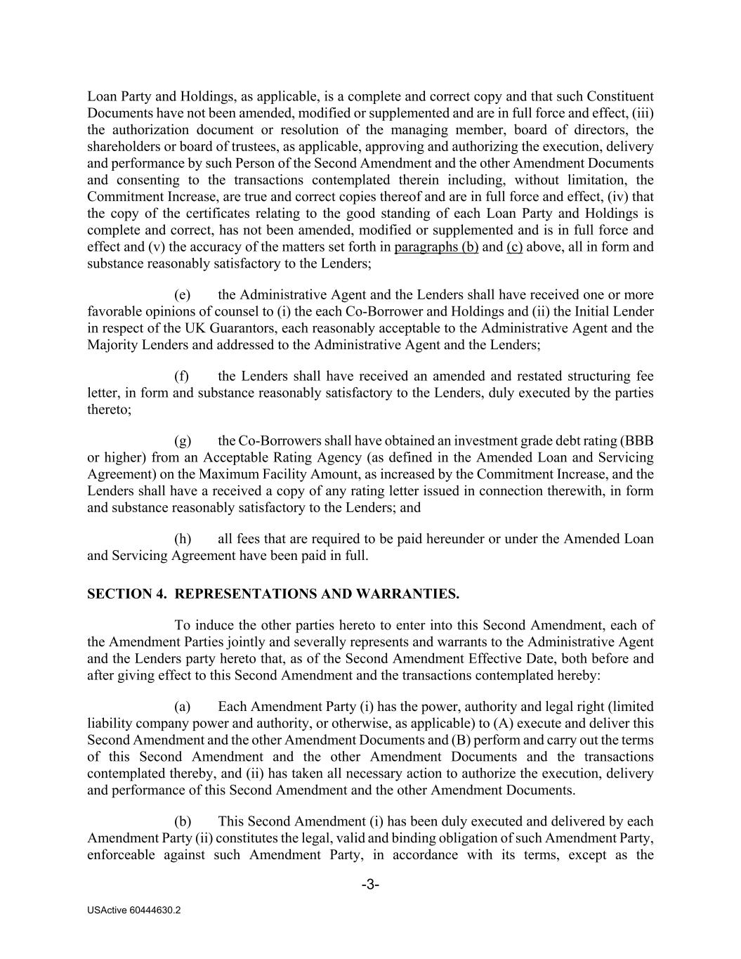 -3- USActive 60444630.2 Loan Party and Holdings, as applicable, is a complete and correct copy and that such Constituent Documents have not been amended, modified or supplemented and are in full force and effect, (iii) the authorization document or resolution of the managing member, board of directors, the shareholders or board of trustees, as applicable, approving and authorizing the execution, delivery and performance by such Person of the Second Amendment and the other Amendment Documents and consenting to the transactions contemplated therein including, without limitation, the Commitment Increase, are true and correct copies thereof and are in full force and effect, (iv) that the copy of the certificates relating to the good standing of each Loan Party and Holdings is complete and correct, has not been amended, modified or supplemented and is in full force and effect and (v) the accuracy of the matters set forth in paragraphs (b) and (c) above, all in form and substance reasonably satisfactory to the Lenders; (e) the Administrative Agent and the Lenders shall have received one or more favorable opinions of counsel to (i) the each Co‐Borrower and Holdings and (ii) the Initial Lender in respect of the UK Guarantors, each reasonably acceptable to the Administrative Agent and the Majority Lenders and addressed to the Administrative Agent and the Lenders; (f) the Lenders shall have received an amended and restated structuring fee letter, in form and substance reasonably satisfactory to the Lenders, duly executed by the parties thereto; (g) the Co-Borrowers shall have obtained an investment grade debt rating (BBB or higher) from an Acceptable Rating Agency (as defined in the Amended Loan and Servicing Agreement) on the Maximum Facility Amount, as increased by the Commitment Increase, and the Lenders shall have a received a copy of any rating letter issued in connection therewith, in form and substance reasonably satisfactory to the Lenders; and (h) all fees that are required to be paid hereunder or under the Amended Loan and Servicing Agreement have been paid in full. SECTION 4. REPRESENTATIONS AND WARRANTIES. To induce the other parties hereto to enter into this Second Amendment, each of the Amendment Parties jointly and severally represents and warrants to the Administrative Agent and the Lenders party hereto that, as of the Second Amendment Effective Date, both before and after giving effect to this Second Amendment and the transactions contemplated hereby: (a) Each Amendment Party (i) has the power, authority and legal right (limited liability company power and authority, or otherwise, as applicable) to (A) execute and deliver this Second Amendment and the other Amendment Documents and (B) perform and carry out the terms of this Second Amendment and the other Amendment Documents and the transactions contemplated thereby, and (ii) has taken all necessary action to authorize the execution, delivery and performance of this Second Amendment and the other Amendment Documents. (b) This Second Amendment (i) has been duly executed and delivered by each Amendment Party (ii) constitutes the legal, valid and binding obligation of such Amendment Party, enforceable against such Amendment Party, in accordance with its terms, except as the