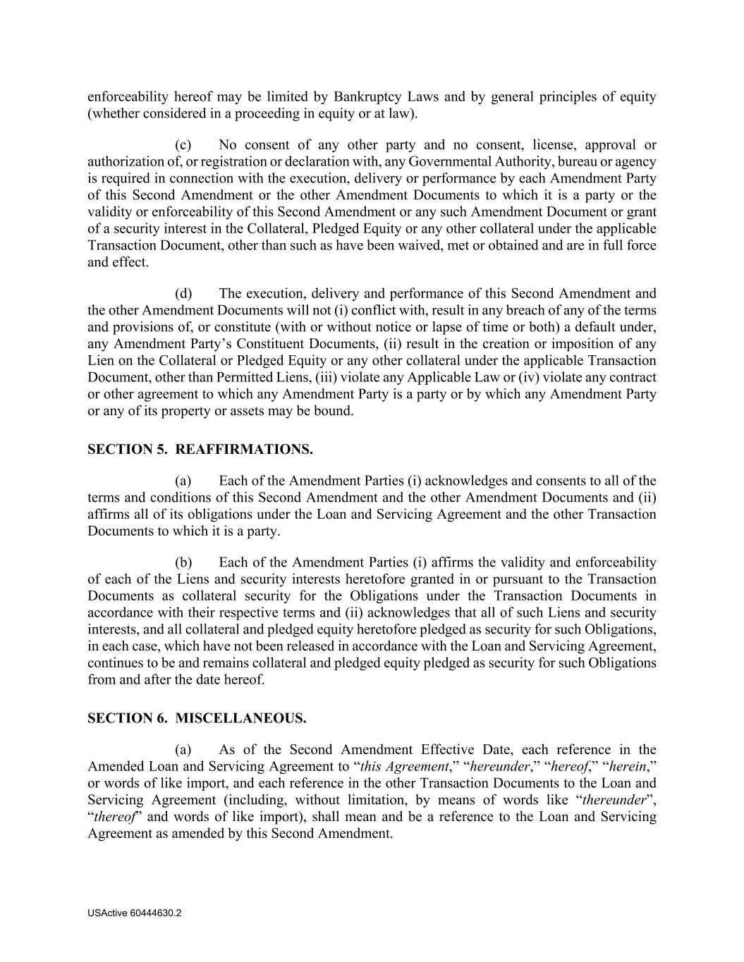 USActive 60444630.2 enforceability hereof may be limited by Bankruptcy Laws and by general principles of equity (whether considered in a proceeding in equity or at law). (c) No consent of any other party and no consent, license, approval or authorization of, or registration or declaration with, any Governmental Authority, bureau or agency is required in connection with the execution, delivery or performance by each Amendment Party of this Second Amendment or the other Amendment Documents to which it is a party or the validity or enforceability of this Second Amendment or any such Amendment Document or grant of a security interest in the Collateral, Pledged Equity or any other collateral under the applicable Transaction Document, other than such as have been waived, met or obtained and are in full force and effect. (d) The execution, delivery and performance of this Second Amendment and the other Amendment Documents will not (i) conflict with, result in any breach of any of the terms and provisions of, or constitute (with or without notice or lapse of time or both) a default under, any Amendment Party’s Constituent Documents, (ii) result in the creation or imposition of any Lien on the Collateral or Pledged Equity or any other collateral under the applicable Transaction Document, other than Permitted Liens, (iii) violate any Applicable Law or (iv) violate any contract or other agreement to which any Amendment Party is a party or by which any Amendment Party or any of its property or assets may be bound. SECTION 5. REAFFIRMATIONS. (a) Each of the Amendment Parties (i) acknowledges and consents to all of the terms and conditions of this Second Amendment and the other Amendment Documents and (ii) affirms all of its obligations under the Loan and Servicing Agreement and the other Transaction Documents to which it is a party. (b) Each of the Amendment Parties (i) affirms the validity and enforceability of each of the Liens and security interests heretofore granted in or pursuant to the Transaction Documents as collateral security for the Obligations under the Transaction Documents in accordance with their respective terms and (ii) acknowledges that all of such Liens and security interests, and all collateral and pledged equity heretofore pledged as security for such Obligations, in each case, which have not been released in accordance with the Loan and Servicing Agreement, continues to be and remains collateral and pledged equity pledged as security for such Obligations from and after the date hereof. SECTION 6. MISCELLANEOUS. (a) As of the Second Amendment Effective Date, each reference in the Amended Loan and Servicing Agreement to “this Agreement,” “hereunder,” “hereof,” “herein,” or words of like import, and each reference in the other Transaction Documents to the Loan and Servicing Agreement (including, without limitation, by means of words like “thereunder”, “thereof” and words of like import), shall mean and be a reference to the Loan and Servicing Agreement as amended by this Second Amendment.