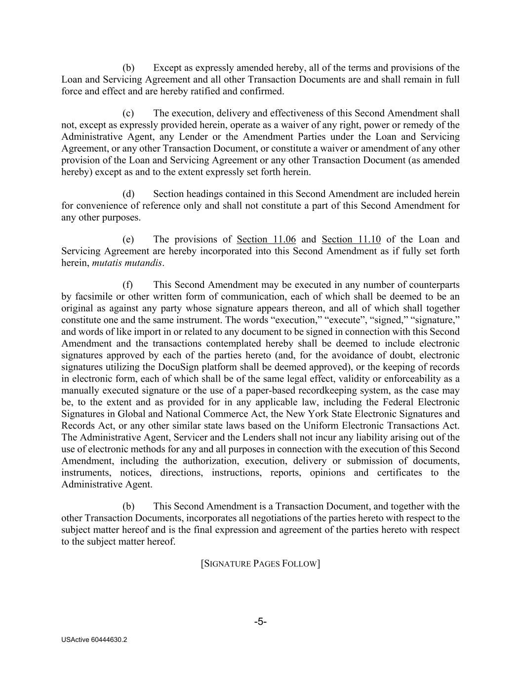 -5- USActive 60444630.2 (b) Except as expressly amended hereby, all of the terms and provisions of the Loan and Servicing Agreement and all other Transaction Documents are and shall remain in full force and effect and are hereby ratified and confirmed. (c) The execution, delivery and effectiveness of this Second Amendment shall not, except as expressly provided herein, operate as a waiver of any right, power or remedy of the Administrative Agent, any Lender or the Amendment Parties under the Loan and Servicing Agreement, or any other Transaction Document, or constitute a waiver or amendment of any other provision of the Loan and Servicing Agreement or any other Transaction Document (as amended hereby) except as and to the extent expressly set forth herein. (d) Section headings contained in this Second Amendment are included herein for convenience of reference only and shall not constitute a part of this Second Amendment for any other purposes. (e) The provisions of Section 11.06 and Section 11.10 of the Loan and Servicing Agreement are hereby incorporated into this Second Amendment as if fully set forth herein, mutatis mutandis. (f) This Second Amendment may be executed in any number of counterparts by facsimile or other written form of communication, each of which shall be deemed to be an original as against any party whose signature appears thereon, and all of which shall together constitute one and the same instrument. The words “execution,” “execute”, “signed,” “signature,” and words of like import in or related to any document to be signed in connection with this Second Amendment and the transactions contemplated hereby shall be deemed to include electronic signatures approved by each of the parties hereto (and, for the avoidance of doubt, electronic signatures utilizing the DocuSign platform shall be deemed approved), or the keeping of records in electronic form, each of which shall be of the same legal effect, validity or enforceability as a manually executed signature or the use of a paper-based recordkeeping system, as the case may be, to the extent and as provided for in any applicable law, including the Federal Electronic Signatures in Global and National Commerce Act, the New York State Electronic Signatures and Records Act, or any other similar state laws based on the Uniform Electronic Transactions Act. The Administrative Agent, Servicer and the Lenders shall not incur any liability arising out of the use of electronic methods for any and all purposes in connection with the execution of this Second Amendment, including the authorization, execution, delivery or submission of documents, instruments, notices, directions, instructions, reports, opinions and certificates to the Administrative Agent. (b) This Second Amendment is a Transaction Document, and together with the other Transaction Documents, incorporates all negotiations of the parties hereto with respect to the subject matter hereof and is the final expression and agreement of the parties hereto with respect to the subject matter hereof. [SIGNATURE PAGES FOLLOW]