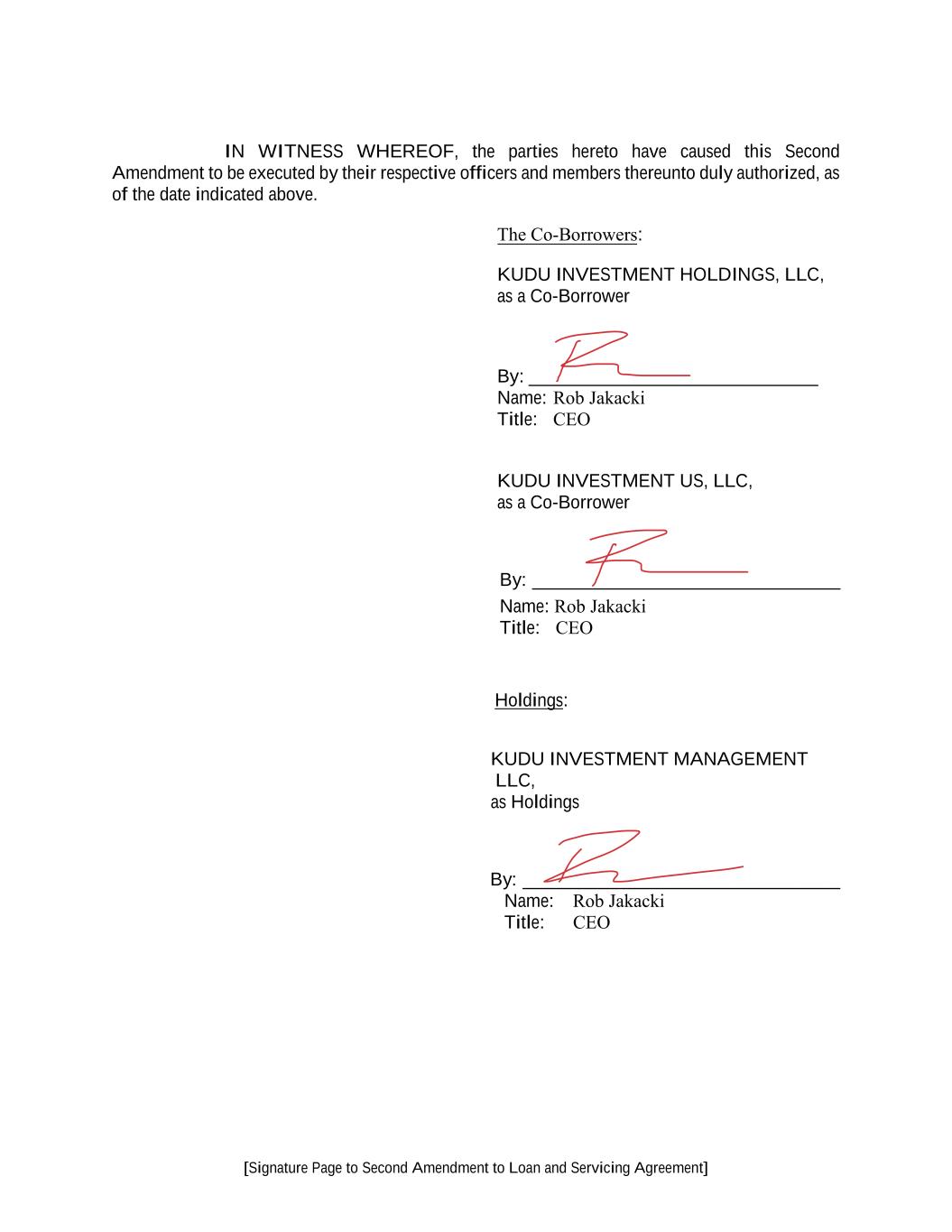 [Signature Page to Second Amendment to Loan and Servicing Agreement] IN WITNESS WHEREOF, the parties hereto have caused this Second Amendment to be executed by their respective officers and members thereunto duly authorized, as of the date indicated above. The Co‐Borrowers: KUDU INVESTMENT HOLDINGS, LLC, as a Co-Borrower By: _______________________________ Name: Rob Jakacki Title: CEO KUDU INVESTMENT US, LLC, as a Co-Borrower By: _________________________________ Name: Rob Jakacki Title: CEO Holdings: KUDU INVESTMENT MANAGEMENT LLC, as Holdings By: __________________________________ Name: Rob Jakacki Title: CEO