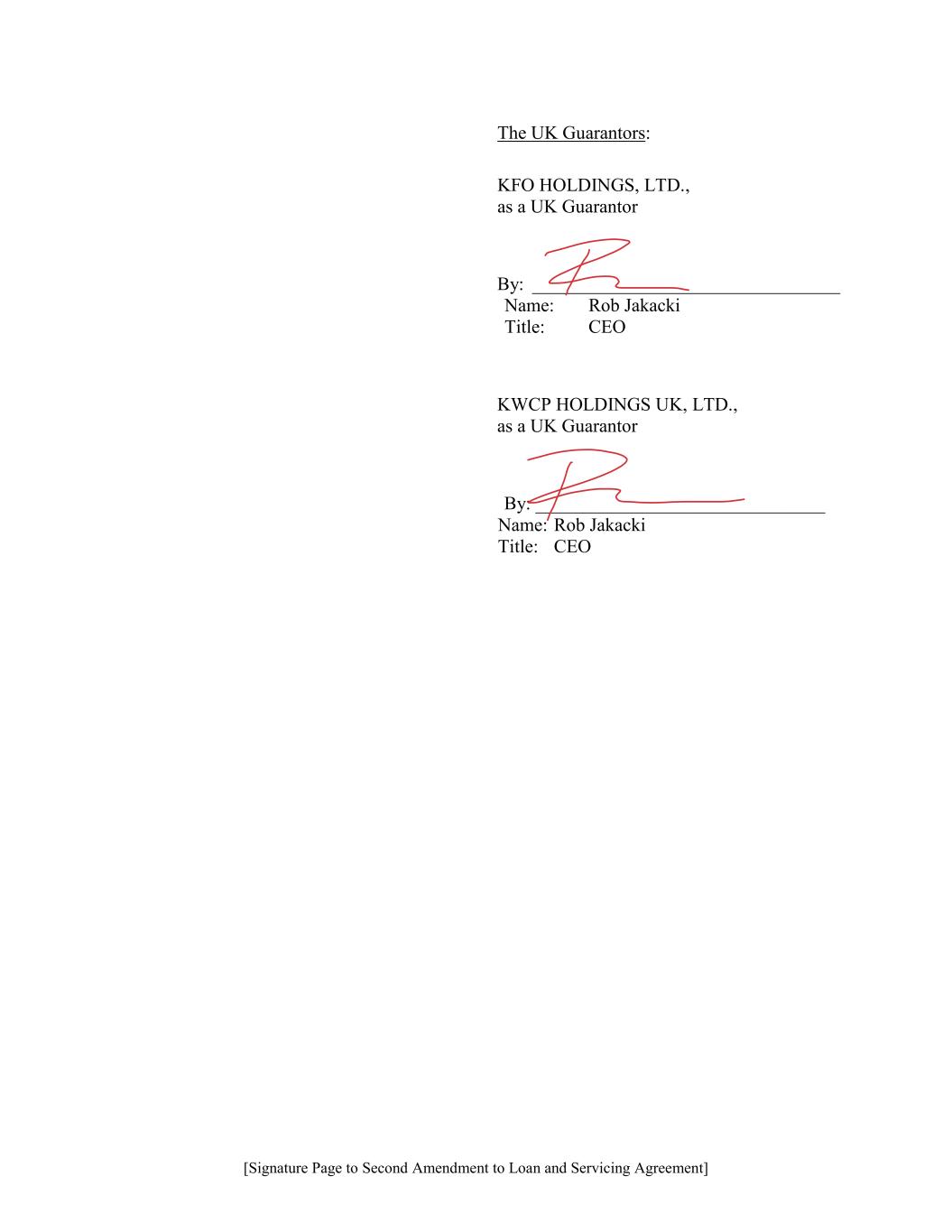 [Signature Page to Second Amendment to Loan and Servicing Agreement] The UK Guarantors: KFO HOLDINGS, LTD., as a UK Guarantor By: _________________________________ Name: Rob Jakacki Title: CEO KWCP HOLDINGS UK, LTD., as a UK Guarantor By: _______________________________ Name: Rob Jakacki Title: CEO