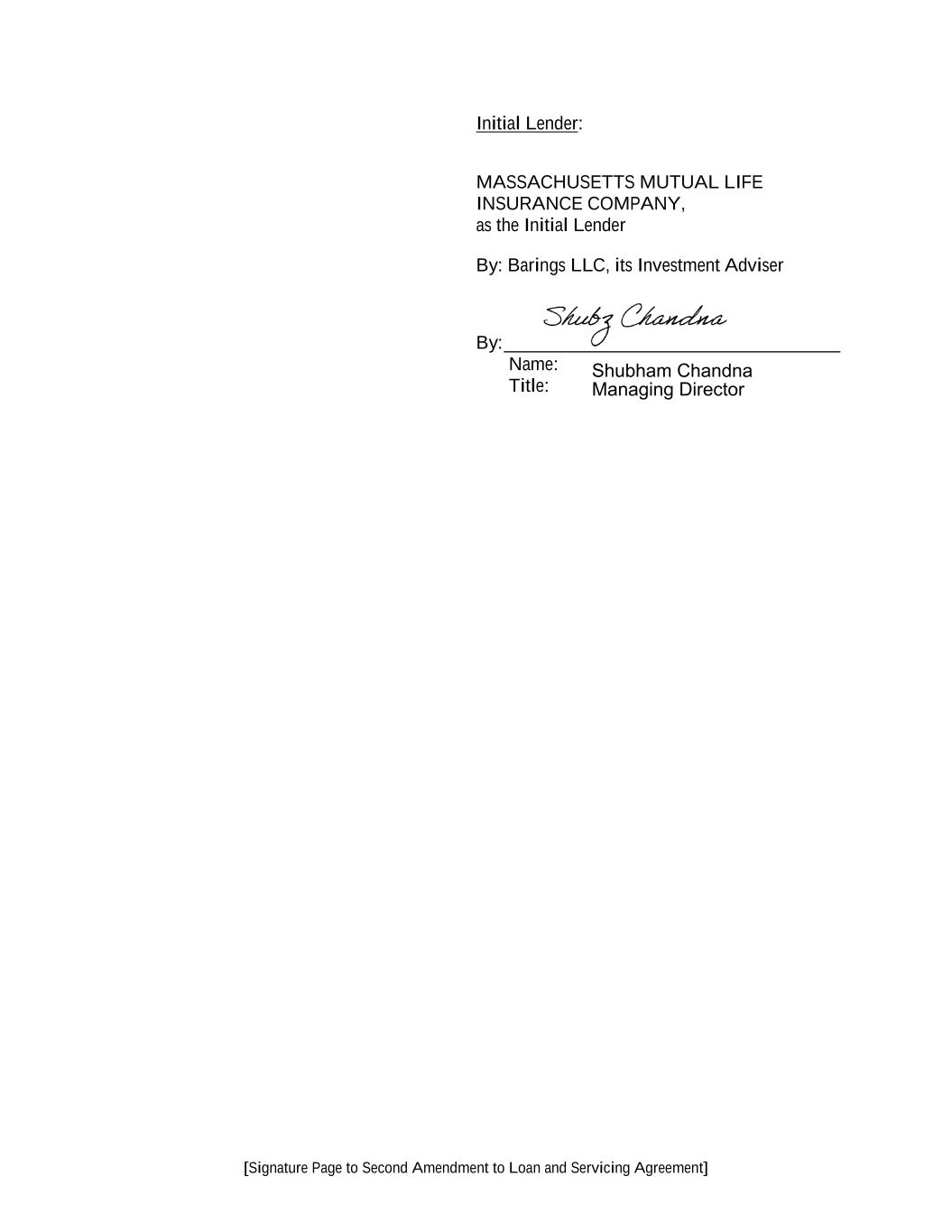 [Signature Page to Second Amendment to Loan and Servicing Agreement] Initial Lender: MASSACHUSETTS MUTUAL LIFE INSURANCE COMPANY, as the Initial Lender By: Barings LLC, its Investment Adviser By: ____________________________________ Name: Title: Shubham Chandna Managing Director
