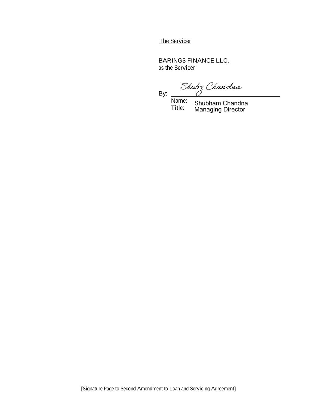 [Signature Page to Second Amendment to Loan and Servicing Agreement] The Servicer: BARINGS FINANCE LLC, as the Servicer By: ___________________________________ Name: Title: Shubham Chandna Managing Director