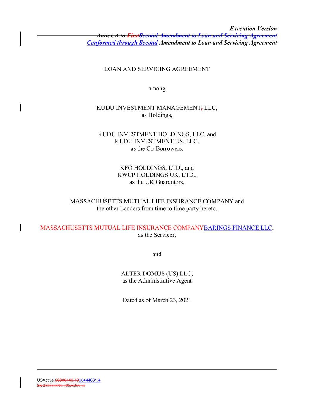 Execution Version Annex A to FirstSecond Amendment to Loan and Servicing Agreement Conformed through Second Amendment to Loan and Servicing Agreement LOAN AND SERVICING AGREEMENT among KUDU INVESTMENT MANAGEMENT, LLC, as Holdings, KUDU INVESTMENT HOLDINGS, LLC, and KUDU INVESTMENT US, LLC, as the Co‐Borrowers, KFO HOLDINGS, LTD., and KWCP HOLDINGS UK, LTD., as the UK Guarantors, MASSACHUSETTS MUTUAL LIFE INSURANCE COMPANY and the other Lenders from time to time party hereto, MASSACHUSETTS MUTUAL LIFE INSURANCE COMPANYBARINGS FINANCE LLC, as the Servicer, and ALTER DOMUS (US) LLC, as the Administrative Agent Dated as of March 23, 2021 USActive 58806140.1060444631.4 SK 28388 0001 10656366 v3