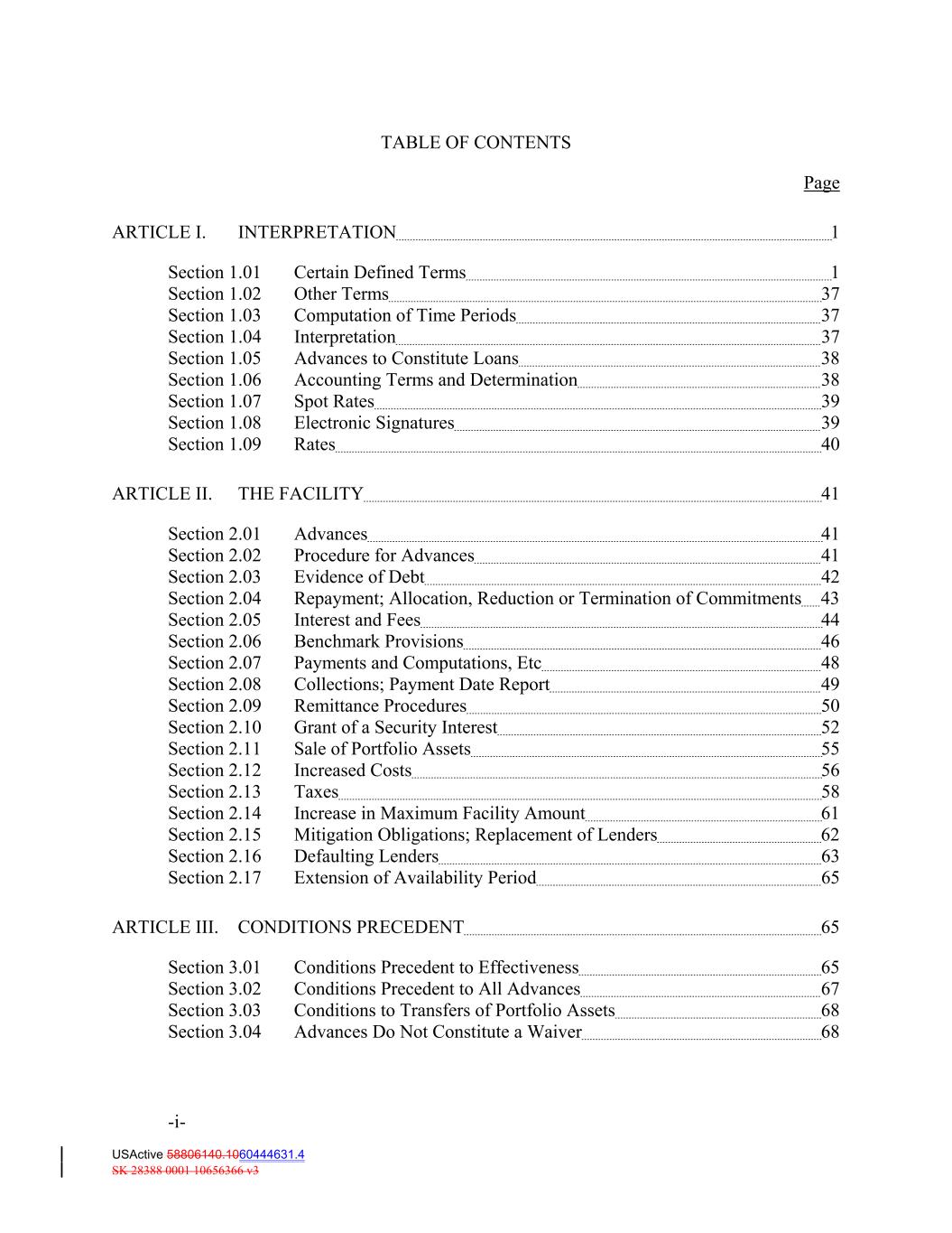 TABLE OF CONTENTS Page ARTICLE I. INTERPRETATION 1 Section 1.01 Certain Defined Terms 1 Section 1.02 Other Terms 37 Section 1.03 Computation of Time Periods 37 Section 1.04 Interpretation 37 Section 1.05 Advances to Constitute Loans 38 Section 1.06 Accounting Terms and Determination 38 Section 1.07 Spot Rates 39 Section 1.08 Electronic Signatures 39 Section 1.09 Rates 40 ARTICLE II. THE FACILITY 41 Section 2.01 Advances 41 Section 2.02 Procedure for Advances 41 Section 2.03 Evidence of Debt 42 Section 2.04 Repayment; Allocation, Reduction or Termination of Commitments 43 Section 2.05 Interest and Fees 44 Section 2.06 Benchmark Provisions 46 Section 2.07 Payments and Computations, Etc 48 Section 2.08 Collections; Payment Date Report 49 Section 2.09 Remittance Procedures 50 Section 2.10 Grant of a Security Interest 52 Section 2.11 Sale of Portfolio Assets 55 Section 2.12 Increased Costs 56 Section 2.13 Taxes 58 Section 2.14 Increase in Maximum Facility Amount 61 Section 2.15 Mitigation Obligations; Replacement of Lenders 62 Section 2.16 Defaulting Lenders 63 Section 2.17 Extension of Availability Period 65 ARTICLE III. CONDITIONS PRECEDENT 65 Section 3.01 Conditions Precedent to Effectiveness 65 Section 3.02 Conditions Precedent to All Advances 67 Section 3.03 Conditions to Transfers of Portfolio Assets 68 Section 3.04 Advances Do Not Constitute a Waiver 68 -i- USActive 58806140.1060444631.4 SK 28388 0001 10656366 v3