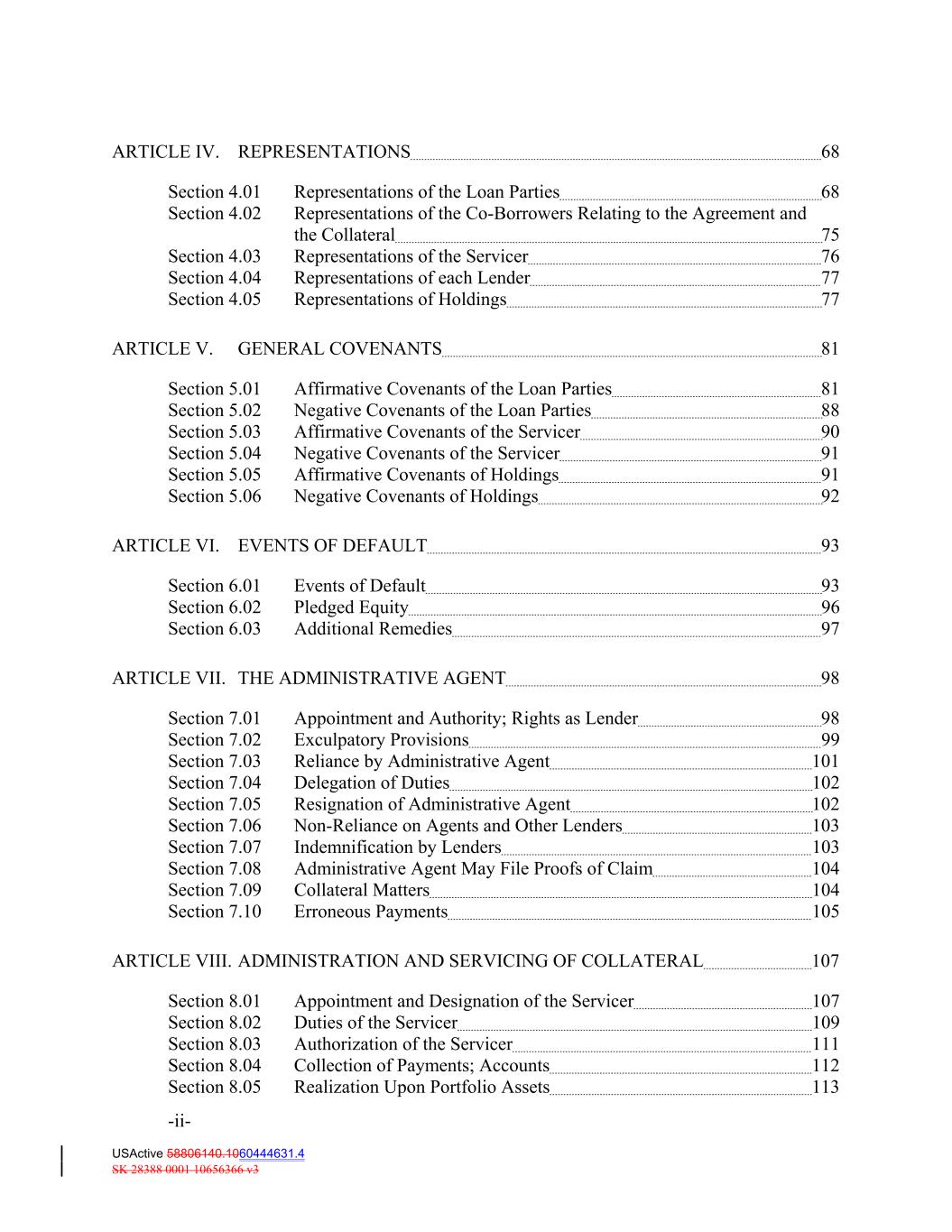 ARTICLE IV. REPRESENTATIONS 68 Section 4.01 Representations of the Loan Parties 68 Section 4.02 Representations of the Co‐Borrowers Relating to the Agreement and the Collateral 75 Section 4.03 Representations of the Servicer 76 Section 4.04 Representations of each Lender 77 Section 4.05 Representations of Holdings 77 ARTICLE V. GENERAL COVENANTS 81 Section 5.01 Affirmative Covenants of the Loan Parties 81 Section 5.02 Negative Covenants of the Loan Parties 88 Section 5.03 Affirmative Covenants of the Servicer 90 Section 5.04 Negative Covenants of the Servicer 91 Section 5.05 Affirmative Covenants of Holdings 91 Section 5.06 Negative Covenants of Holdings 92 ARTICLE VI. EVENTS OF DEFAULT 93 Section 6.01 Events of Default 93 Section 6.02 Pledged Equity 96 Section 6.03 Additional Remedies 97 ARTICLE VII. THE ADMINISTRATIVE AGENT 98 Section 7.01 Appointment and Authority; Rights as Lender 98 Section 7.02 Exculpatory Provisions 99 Section 7.03 Reliance by Administrative Agent 101 Section 7.04 Delegation of Duties 102 Section 7.05 Resignation of Administrative Agent 102 Section 7.06 Non‐Reliance on Agents and Other Lenders 103 Section 7.07 Indemnification by Lenders 103 Section 7.08 Administrative Agent May File Proofs of Claim 104 Section 7.09 Collateral Matters 104 Section 7.10 Erroneous Payments 105 ARTICLE VIII. ADMINISTRATION AND SERVICING OF COLLATERAL 107 Section 8.01 Appointment and Designation of the Servicer 107 Section 8.02 Duties of the Servicer 109 Section 8.03 Authorization of the Servicer 111 Section 8.04 Collection of Payments; Accounts 112 Section 8.05 Realization Upon Portfolio Assets 113 -ii- USActive 58806140.1060444631.4 SK 28388 0001 10656366 v3