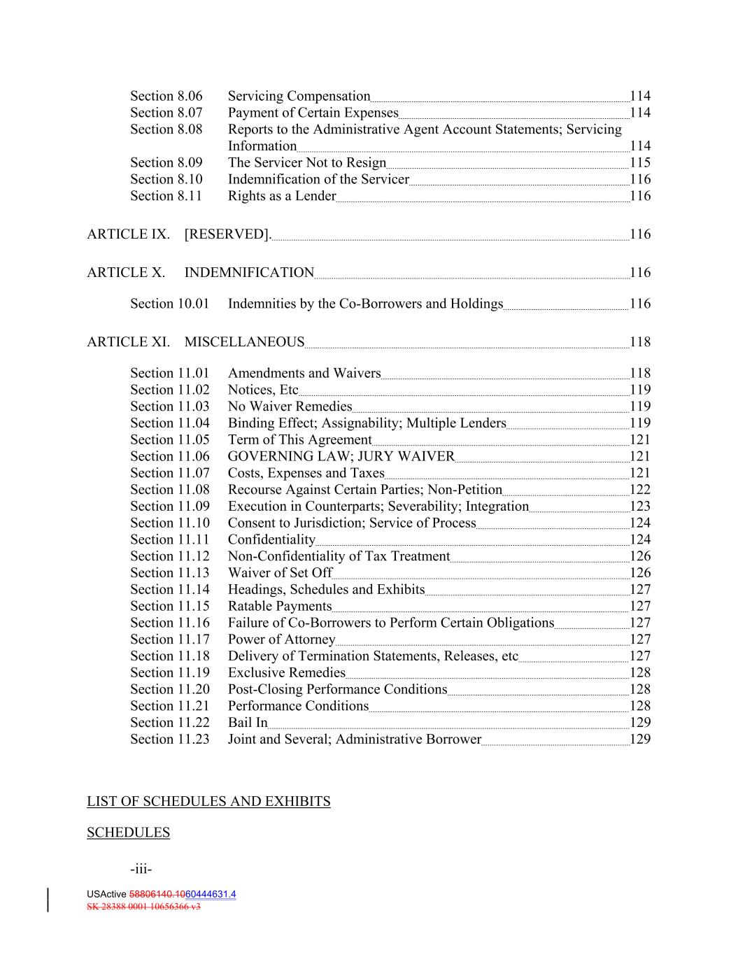 Section 8.06 Servicing Compensation 114 Section 8.07 Payment of Certain Expenses 114 Section 8.08 Reports to the Administrative Agent Account Statements; Servicing Information 114 Section 8.09 The Servicer Not to Resign 115 Section 8.10 Indemnification of the Servicer 116 Section 8.11 Rights as a Lender 116 ARTICLE IX. [RESERVED]. 116 ARTICLE X. INDEMNIFICATION 116 Section 10.01 Indemnities by the Co‐Borrowers and Holdings 116 ARTICLE XI. MISCELLANEOUS 118 Section 11.01 Amendments and Waivers 118 Section 11.02 Notices, Etc 119 Section 11.03 No Waiver Remedies 119 Section 11.04 Binding Effect; Assignability; Multiple Lenders 119 Section 11.05 Term of This Agreement 121 Section 11.06 GOVERNING LAW; JURY WAIVER 121 Section 11.07 Costs, Expenses and Taxes 121 Section 11.08 Recourse Against Certain Parties; Non‐Petition 122 Section 11.09 Execution in Counterparts; Severability; Integration 123 Section 11.10 Consent to Jurisdiction; Service of Process 124 Section 11.11 Confidentiality 124 Section 11.12 Non‐Confidentiality of Tax Treatment 126 Section 11.13 Waiver of Set Off 126 Section 11.14 Headings, Schedules and Exhibits 127 Section 11.15 Ratable Payments 127 Section 11.16 Failure of Co‐Borrowers to Perform Certain Obligations 127 Section 11.17 Power of Attorney 127 Section 11.18 Delivery of Termination Statements, Releases, etc 127 Section 11.19 Exclusive Remedies 128 Section 11.20 Post‐Closing Performance Conditions 128 Section 11.21 Performance Conditions 128 Section 11.22 Bail In 129 Section 11.23 Joint and Several; Administrative Borrower 129 LIST OF SCHEDULES AND EXHIBITS SCHEDULES -iii- USActive 58806140.1060444631.4 SK 28388 0001 10656366 v3