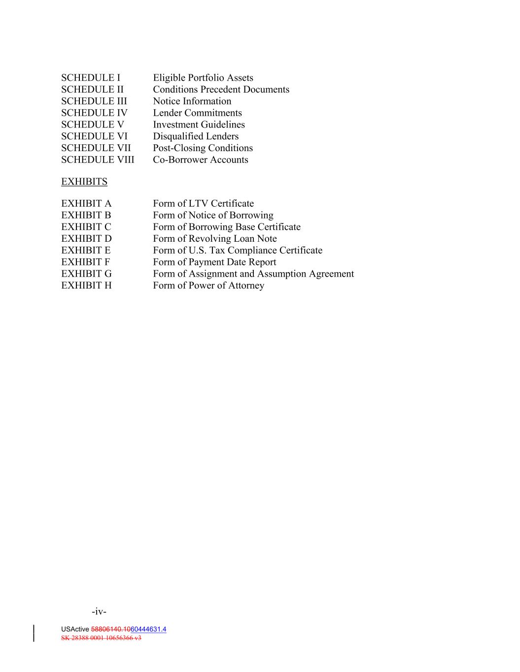 SCHEDULE I Eligible Portfolio Assets SCHEDULE II Conditions Precedent Documents SCHEDULE III Notice Information SCHEDULE IV Lender Commitments SCHEDULE V Investment Guidelines SCHEDULE VI Disqualified Lenders SCHEDULE VII Post‐Closing Conditions SCHEDULE VIII Co-Borrower Accounts EXHIBITS EXHIBIT A Form of LTV Certificate EXHIBIT B Form of Notice of Borrowing EXHIBIT C Form of Borrowing Base Certificate EXHIBIT D Form of Revolving Loan Note EXHIBIT E Form of U.S. Tax Compliance Certificate EXHIBIT F Form of Payment Date Report EXHIBIT G Form of Assignment and Assumption Agreement EXHIBIT H Form of Power of Attorney -iv- USActive 58806140.1060444631.4 SK 28388 0001 10656366 v3