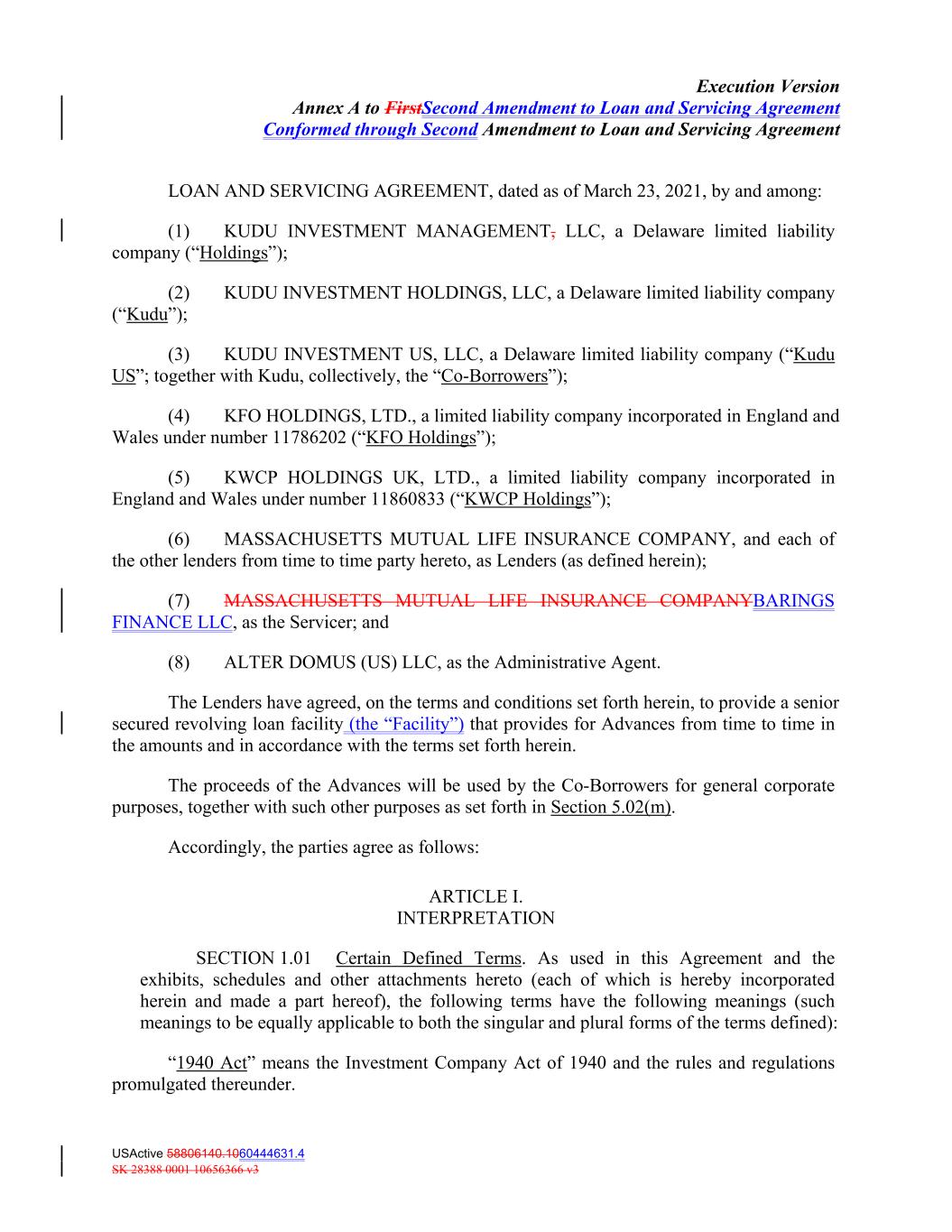 Execution Version Annex A to FirstSecond Amendment to Loan and Servicing Agreement Conformed through Second Amendment to Loan and Servicing Agreement LOAN AND SERVICING AGREEMENT, dated as of March 23, 2021, by and among: (1) KUDU INVESTMENT MANAGEMENT, LLC, a Delaware limited liability company (“Holdings”); (2) KUDU INVESTMENT HOLDINGS, LLC, a Delaware limited liability company (“Kudu”); (3) KUDU INVESTMENT US, LLC, a Delaware limited liability company (“Kudu US”; together with Kudu, collectively, the “Co-Borrowers”); (4) KFO HOLDINGS, LTD., a limited liability company incorporated in England and Wales under number 11786202 (“KFO Holdings”); (5) KWCP HOLDINGS UK, LTD., a limited liability company incorporated in England and Wales under number 11860833 (“KWCP Holdings”); (6) MASSACHUSETTS MUTUAL LIFE INSURANCE COMPANY, and each of the other lenders from time to time party hereto, as Lenders (as defined herein); (7) MASSACHUSETTS MUTUAL LIFE INSURANCE COMPANYBARINGS FINANCE LLC, as the Servicer; and (8) ALTER DOMUS (US) LLC, as the Administrative Agent. The Lenders have agreed, on the terms and conditions set forth herein, to provide a senior secured revolving loan facility (the “Facility”) that provides for Advances from time to time in the amounts and in accordance with the terms set forth herein. The proceeds of the Advances will be used by the Co‐Borrowers for general corporate purposes, together with such other purposes as set forth in Section 5.02(m). Accordingly, the parties agree as follows: ARTICLE I. INTERPRETATION SECTION 1.01 Certain Defined Terms. As used in this Agreement and the exhibits, schedules and other attachments hereto (each of which is hereby incorporated herein and made a part hereof), the following terms have the following meanings (such meanings to be equally applicable to both the singular and plural forms of the terms defined): “1940 Act” means the Investment Company Act of 1940 and the rules and regulations promulgated thereunder. USActive 58806140.1060444631.4 SK 28388 0001 10656366 v3