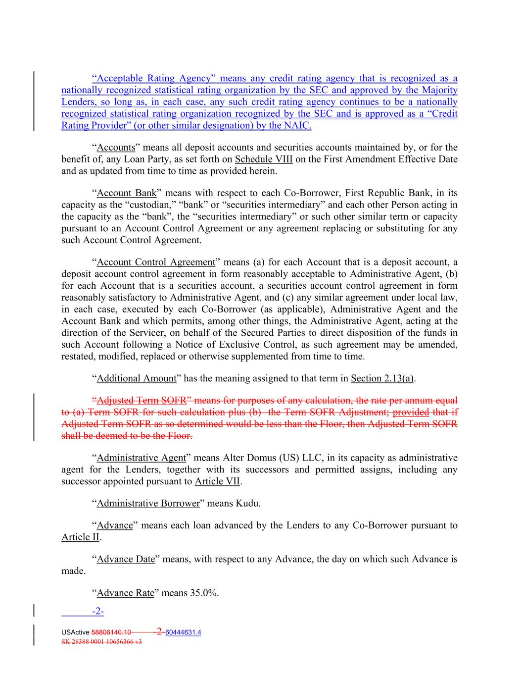 “Acceptable Rating Agency” means any credit rating agency that is recognized as a nationally recognized statistical rating organization by the SEC and approved by the Majority Lenders, so long as, in each case, any such credit rating agency continues to be a nationally recognized statistical rating organization recognized by the SEC and is approved as a “Credit Rating Provider” (or other similar designation) by the NAIC. “Accounts” means all deposit accounts and securities accounts maintained by, or for the benefit of, any Loan Party, as set forth on Schedule VIII on the First Amendment Effective Date and as updated from time to time as provided herein. “Account Bank” means with respect to each Co‐Borrower, First Republic Bank, in its capacity as the “custodian,” “bank” or “securities intermediary” and each other Person acting in the capacity as the “bank”, the “securities intermediary” or such other similar term or capacity pursuant to an Account Control Agreement or any agreement replacing or substituting for any such Account Control Agreement. “Account Control Agreement” means (a) for each Account that is a deposit account, a deposit account control agreement in form reasonably acceptable to Administrative Agent, (b) for each Account that is a securities account, a securities account control agreement in form reasonably satisfactory to Administrative Agent, and (c) any similar agreement under local law, in each case, executed by each Co‐Borrower (as applicable), Administrative Agent and the Account Bank and which permits, among other things, the Administrative Agent, acting at the direction of the Servicer, on behalf of the Secured Parties to direct disposition of the funds in such Account following a Notice of Exclusive Control, as such agreement may be amended, restated, modified, replaced or otherwise supplemented from time to time. “Additional Amount” has the meaning assigned to that term in Section 2.13(a). “Adjusted Term SOFR” means for purposes of any calculation, the rate per annum equal to (a) Term SOFR for such calculation plus (b) the Term SOFR Adjustment; provided that if Adjusted Term SOFR as so determined would be less than the Floor, then Adjusted Term SOFR shall be deemed to be the Floor. “Administrative Agent” means Alter Domus (US) LLC, in its capacity as administrative agent for the Lenders, together with its successors and permitted assigns, including any successor appointed pursuant to Article VII. “Administrative Borrower” means Kudu. “Advance” means each loan advanced by the Lenders to any Co‐Borrower pursuant to Article II. “Advance Date” means, with respect to any Advance, the day on which such Advance is made. “Advance Rate” means 35.0%. -2- USActive 58806140.10 -2-60444631.4 SK 28388 0001 10656366 v3