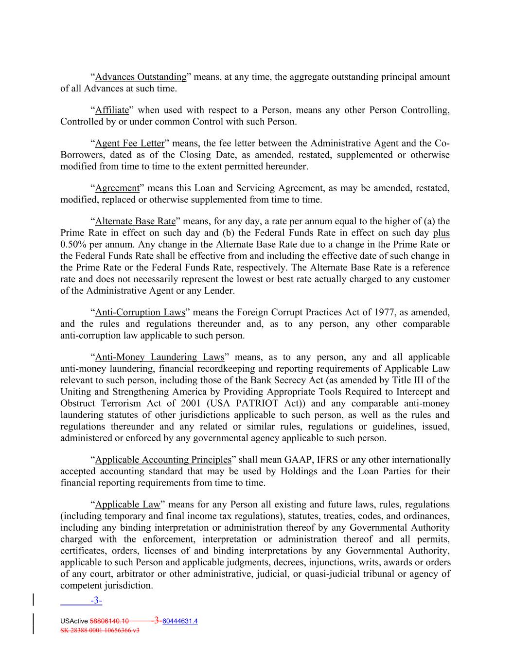 “Advances Outstanding” means, at any time, the aggregate outstanding principal amount of all Advances at such time. “Affiliate” when used with respect to a Person, means any other Person Controlling, Controlled by or under common Control with such Person. “Agent Fee Letter” means, the fee letter between the Administrative Agent and the Co‐ Borrowers, dated as of the Closing Date, as amended, restated, supplemented or otherwise modified from time to time to the extent permitted hereunder. “Agreement” means this Loan and Servicing Agreement, as may be amended, restated, modified, replaced or otherwise supplemented from time to time. “Alternate Base Rate” means, for any day, a rate per annum equal to the higher of (a) the Prime Rate in effect on such day and (b) the Federal Funds Rate in effect on such day plus 0.50% per annum. Any change in the Alternate Base Rate due to a change in the Prime Rate or the Federal Funds Rate shall be effective from and including the effective date of such change in the Prime Rate or the Federal Funds Rate, respectively. The Alternate Base Rate is a reference rate and does not necessarily represent the lowest or best rate actually charged to any customer of the Administrative Agent or any Lender. “Anti‐Corruption Laws” means the Foreign Corrupt Practices Act of 1977, as amended, and the rules and regulations thereunder and, as to any person, any other comparable anti‐corruption law applicable to such person. “Anti‐Money Laundering Laws” means, as to any person, any and all applicable anti‐money laundering, financial recordkeeping and reporting requirements of Applicable Law relevant to such person, including those of the Bank Secrecy Act (as amended by Title III of the Uniting and Strengthening America by Providing Appropriate Tools Required to Intercept and Obstruct Terrorism Act of 2001 (USA PATRIOT Act)) and any comparable anti‐money laundering statutes of other jurisdictions applicable to such person, as well as the rules and regulations thereunder and any related or similar rules, regulations or guidelines, issued, administered or enforced by any governmental agency applicable to such person. “Applicable Accounting Principles” shall mean GAAP, IFRS or any other internationally accepted accounting standard that may be used by Holdings and the Loan Parties for their financial reporting requirements from time to time. “Applicable Law” means for any Person all existing and future laws, rules, regulations (including temporary and final income tax regulations), statutes, treaties, codes, and ordinances, including any binding interpretation or administration thereof by any Governmental Authority charged with the enforcement, interpretation or administration thereof and all permits, certificates, orders, licenses of and binding interpretations by any Governmental Authority, applicable to such Person and applicable judgments, decrees, injunctions, writs, awards or orders of any court, arbitrator or other administrative, judicial, or quasi‐judicial tribunal or agency of competent jurisdiction. -3- USActive 58806140.10 -3-60444631.4 SK 28388 0001 10656366 v3
