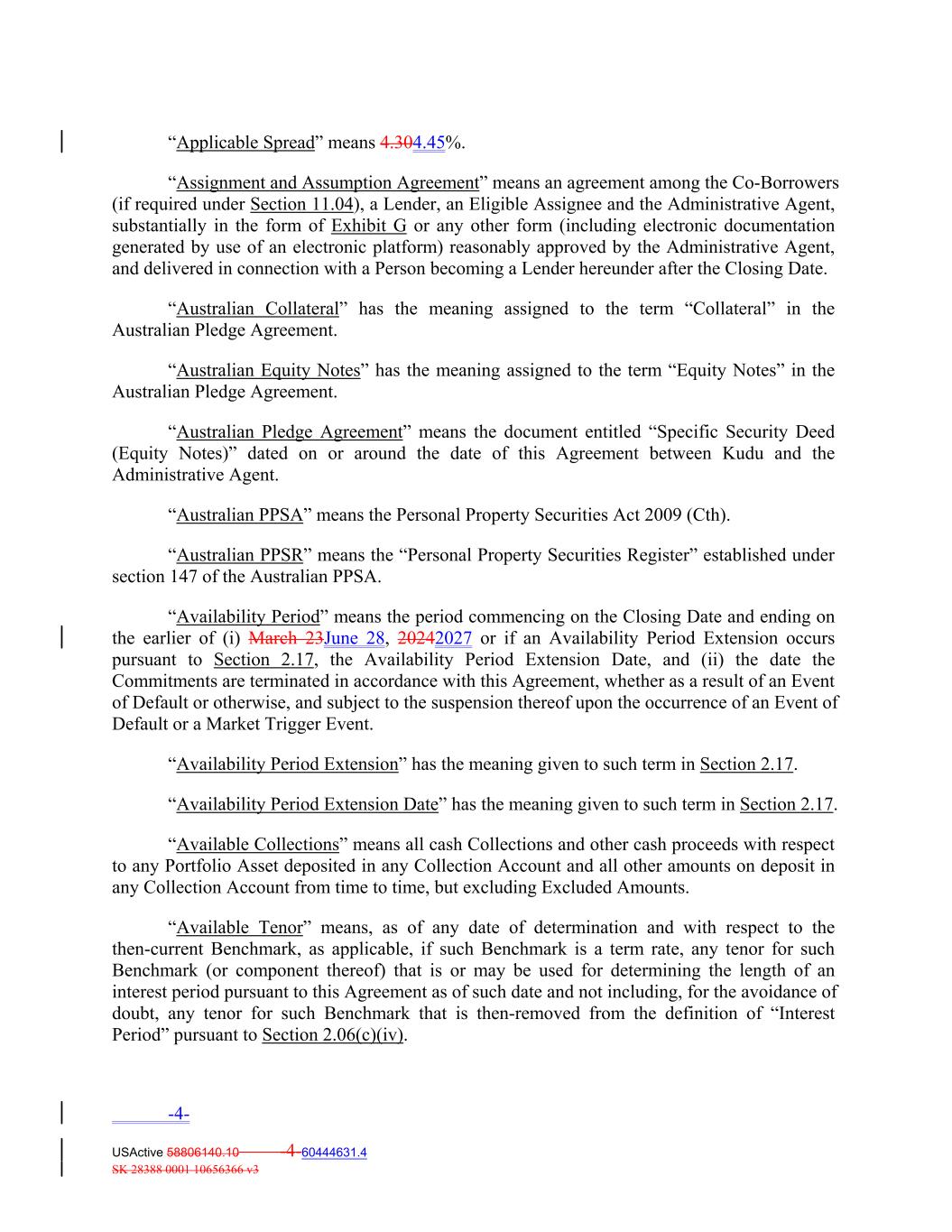 “Applicable Spread” means 4.304.45%. “Assignment and Assumption Agreement” means an agreement among the Co‐Borrowers (if required under Section 11.04), a Lender, an Eligible Assignee and the Administrative Agent, substantially in the form of Exhibit G or any other form (including electronic documentation generated by use of an electronic platform) reasonably approved by the Administrative Agent, and delivered in connection with a Person becoming a Lender hereunder after the Closing Date. “Australian Collateral” has the meaning assigned to the term “Collateral” in the Australian Pledge Agreement. “Australian Equity Notes” has the meaning assigned to the term “Equity Notes” in the Australian Pledge Agreement. “Australian Pledge Agreement” means the document entitled “Specific Security Deed (Equity Notes)” dated on or around the date of this Agreement between Kudu and the Administrative Agent. “Australian PPSA” means the Personal Property Securities Act 2009 (Cth). “Australian PPSR” means the “Personal Property Securities Register” established under section 147 of the Australian PPSA. “Availability Period” means the period commencing on the Closing Date and ending on the earlier of (i) March 23June 28, 20242027 or if an Availability Period Extension occurs pursuant to Section 2.17, the Availability Period Extension Date, and (ii) the date the Commitments are terminated in accordance with this Agreement, whether as a result of an Event of Default or otherwise, and subject to the suspension thereof upon the occurrence of an Event of Default or a Market Trigger Event. “Availability Period Extension” has the meaning given to such term in Section 2.17. “Availability Period Extension Date” has the meaning given to such term in Section 2.17. “Available Collections” means all cash Collections and other cash proceeds with respect to any Portfolio Asset deposited in any Collection Account and all other amounts on deposit in any Collection Account from time to time, but excluding Excluded Amounts. “Available Tenor” means, as of any date of determination and with respect to the then-current Benchmark, as applicable, if such Benchmark is a term rate, any tenor for such Benchmark (or component thereof) that is or may be used for determining the length of an interest period pursuant to this Agreement as of such date and not including, for the avoidance of doubt, any tenor for such Benchmark that is then-removed from the definition of “Interest Period” pursuant to Section 2.06(c)(iv). -4- USActive 58806140.10 -4-60444631.4 SK 28388 0001 10656366 v3