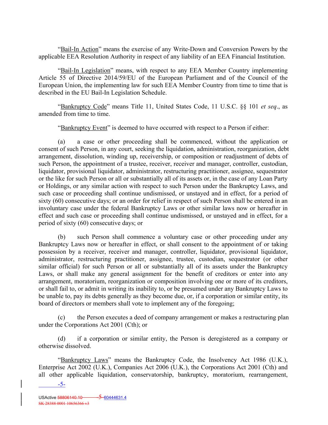 “Bail‐In Action” means the exercise of any Write‐Down and Conversion Powers by the applicable EEA Resolution Authority in respect of any liability of an EEA Financial Institution. “Bail‐In Legislation” means, with respect to any EEA Member Country implementing Article 55 of Directive 2014/59/EU of the European Parliament and of the Council of the European Union, the implementing law for such EEA Member Country from time to time that is described in the EU Bail‐In Legislation Schedule. “Bankruptcy Code” means Title 11, United States Code, 11 U.S.C. §§ 101 et seq., as amended from time to time. “Bankruptcy Event” is deemed to have occurred with respect to a Person if either: (a) a case or other proceeding shall be commenced, without the application or consent of such Person, in any court, seeking the liquidation, administration, reorganization, debt arrangement, dissolution, winding up, receivership, or composition or readjustment of debts of such Person, the appointment of a trustee, receiver, receiver and manager, controller, custodian, liquidator, provisional liquidator, administrator, restructuring practitioner, assignee, sequestrator or the like for such Person or all or substantially all of its assets or, in the case of any Loan Party or Holdings, or any similar action with respect to such Person under the Bankruptcy Laws, and such case or proceeding shall continue undismissed, or unstayed and in effect, for a period of sixty (60) consecutive days; or an order for relief in respect of such Person shall be entered in an involuntary case under the federal Bankruptcy Laws or other similar laws now or hereafter in effect and such case or proceeding shall continue undismissed, or unstayed and in effect, for a period of sixty (60) consecutive days; or (b) such Person shall commence a voluntary case or other proceeding under any Bankruptcy Laws now or hereafter in effect, or shall consent to the appointment of or taking possession by a receiver, receiver and manager, controller, liquidator, provisional liquidator, administrator, restructuring practitioner, assignee, trustee, custodian, sequestrator (or other similar official) for such Person or all or substantially all of its assets under the Bankruptcy Laws, or shall make any general assignment for the benefit of creditors or enter into any arrangement, moratorium, reorganization or composition involving one or more of its creditors, or shall fail to, or admit in writing its inability to, or be presumed under any Bankruptcy Laws to be unable to, pay its debts generally as they become due, or, if a corporation or similar entity, its board of directors or members shall vote to implement any of the foregoing; (c) the Person executes a deed of company arrangement or makes a restructuring plan under the Corporations Act 2001 (Cth); or (d) if a corporation or similar entity, the Person is deregistered as a company or otherwise dissolved. “Bankruptcy Laws” means the Bankruptcy Code, the Insolvency Act 1986 (U.K.), Enterprise Act 2002 (U.K.), Companies Act 2006 (U.K.), the Corporations Act 2001 (Cth) and all other applicable liquidation, conservatorship, bankruptcy, moratorium, rearrangement, -5- USActive 58806140.10 -5-60444631.4 SK 28388 0001 10656366 v3