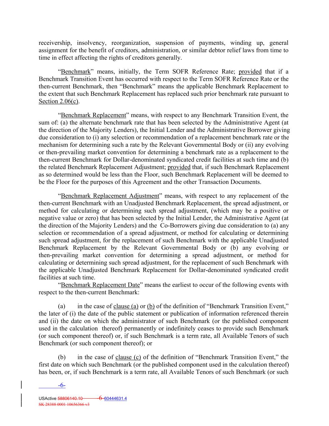 receivership, insolvency, reorganization, suspension of payments, winding up, general assignment for the benefit of creditors, administration, or similar debtor relief laws from time to time in effect affecting the rights of creditors generally. “Benchmark” means, initially, the Term SOFR Reference Rate; provided that if a Benchmark Transition Event has occurred with respect to the Term SOFR Reference Rate or the then-current Benchmark, then “Benchmark” means the applicable Benchmark Replacement to the extent that such Benchmark Replacement has replaced such prior benchmark rate pursuant to Section 2.06(c). “Benchmark Replacement” means, with respect to any Benchmark Transition Event, the sum of: (a) the alternate benchmark rate that has been selected by the Administrative Agent (at the direction of the Majority Lenders), the Initial Lender and the Administrative Borrower giving due consideration to (i) any selection or recommendation of a replacement benchmark rate or the mechanism for determining such a rate by the Relevant Governmental Body or (ii) any evolving or then-prevailing market convention for determining a benchmark rate as a replacement to the then-current Benchmark for Dollar-denominated syndicated credit facilities at such time and (b) the related Benchmark Replacement Adjustment; provided that, if such Benchmark Replacement as so determined would be less than the Floor, such Benchmark Replacement will be deemed to be the Floor for the purposes of this Agreement and the other Transaction Documents. “Benchmark Replacement Adjustment” means, with respect to any replacement of the then-current Benchmark with an Unadjusted Benchmark Replacement, the spread adjustment, or method for calculating or determining such spread adjustment, (which may be a positive or negative value or zero) that has been selected by the Initial Lender, the Administrative Agent (at the direction of the Majority Lenders) and the Co-Borrowers giving due consideration to (a) any selection or recommendation of a spread adjustment, or method for calculating or determining such spread adjustment, for the replacement of such Benchmark with the applicable Unadjusted Benchmark Replacement by the Relevant Governmental Body or (b) any evolving or then‐prevailing market convention for determining a spread adjustment, or method for calculating or determining such spread adjustment, for the replacement of such Benchmark with the applicable Unadjusted Benchmark Replacement for Dollar‐denominated syndicated credit facilities at such time. “Benchmark Replacement Date” means the earliest to occur of the following events with respect to the then-current Benchmark: (a) in the case of clause (a) or (b) of the definition of “Benchmark Transition Event,” the later of (i) the date of the public statement or publication of information referenced therein and (ii) the date on which the administrator of such Benchmark (or the published component used in the calculation thereof) permanently or indefinitely ceases to provide such Benchmark (or such component thereof) or, if such Benchmark is a term rate, all Available Tenors of such Benchmark (or such component thereof); or (b) in the case of clause (c) of the definition of “Benchmark Transition Event,” the first date on which such Benchmark (or the published component used in the calculation thereof) has been, or, if such Benchmark is a term rate, all Available Tenors of such Benchmark (or such -6- USActive 58806140.10 -6-60444631.4 SK 28388 0001 10656366 v3
