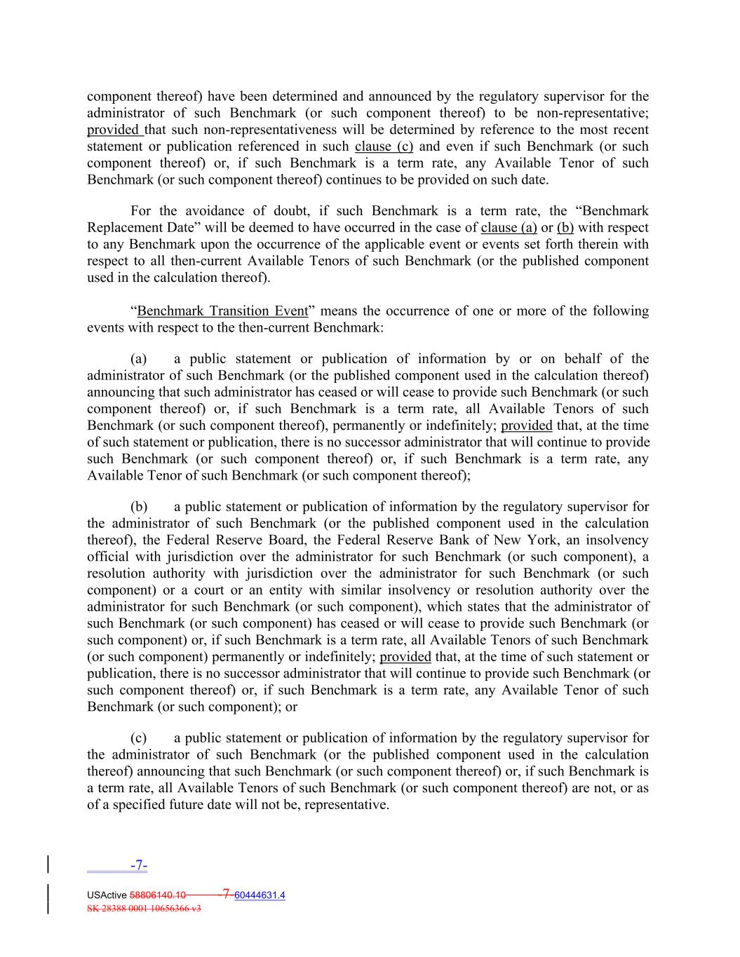 component thereof) have been determined and announced by the regulatory supervisor for the administrator of such Benchmark (or such component thereof) to be non-representative; provided that such non-representativeness will be determined by reference to the most recent statement or publication referenced in such clause (c) and even if such Benchmark (or such component thereof) or, if such Benchmark is a term rate, any Available Tenor of such Benchmark (or such component thereof) continues to be provided on such date. For the avoidance of doubt, if such Benchmark is a term rate, the “Benchmark Replacement Date” will be deemed to have occurred in the case of clause (a) or (b) with respect to any Benchmark upon the occurrence of the applicable event or events set forth therein with respect to all then-current Available Tenors of such Benchmark (or the published component used in the calculation thereof). “Benchmark Transition Event” means the occurrence of one or more of the following events with respect to the then-current Benchmark: (a) a public statement or publication of information by or on behalf of the administrator of such Benchmark (or the published component used in the calculation thereof) announcing that such administrator has ceased or will cease to provide such Benchmark (or such component thereof) or, if such Benchmark is a term rate, all Available Tenors of such Benchmark (or such component thereof), permanently or indefinitely; provided that, at the time of such statement or publication, there is no successor administrator that will continue to provide such Benchmark (or such component thereof) or, if such Benchmark is a term rate, any Available Tenor of such Benchmark (or such component thereof); (b) a public statement or publication of information by the regulatory supervisor for the administrator of such Benchmark (or the published component used in the calculation thereof), the Federal Reserve Board, the Federal Reserve Bank of New York, an insolvency official with jurisdiction over the administrator for such Benchmark (or such component), a resolution authority with jurisdiction over the administrator for such Benchmark (or such component) or a court or an entity with similar insolvency or resolution authority over the administrator for such Benchmark (or such component), which states that the administrator of such Benchmark (or such component) has ceased or will cease to provide such Benchmark (or such component) or, if such Benchmark is a term rate, all Available Tenors of such Benchmark (or such component) permanently or indefinitely; provided that, at the time of such statement or publication, there is no successor administrator that will continue to provide such Benchmark (or such component thereof) or, if such Benchmark is a term rate, any Available Tenor of such Benchmark (or such component); or (c) a public statement or publication of information by the regulatory supervisor for the administrator of such Benchmark (or the published component used in the calculation thereof) announcing that such Benchmark (or such component thereof) or, if such Benchmark is a term rate, all Available Tenors of such Benchmark (or such component thereof) are not, or as of a specified future date will not be, representative. -7- USActive 58806140.10 -7-60444631.4 SK 28388 0001 10656366 v3