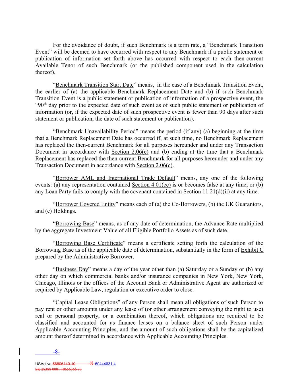 For the avoidance of doubt, if such Benchmark is a term rate, a “Benchmark Transition Event” will be deemed to have occurred with respect to any Benchmark if a public statement or publication of information set forth above has occurred with respect to each then-current Available Tenor of such Benchmark (or the published component used in the calculation thereof). “Benchmark Transition Start Date” means, in the case of a Benchmark Transition Event, the earlier of (a) the applicable Benchmark Replacement Date and (b) if such Benchmark Transition Event is a public statement or publication of information of a prospective event, the “90th day prior to the expected date of such event as of such public statement or publication of information (or, if the expected date of such prospective event is fewer than 90 days after such statement or publication, the date of such statement or publication). “Benchmark Unavailability Period” means the period (if any) (a) beginning at the time that a Benchmark Replacement Date has occurred if, at such time, no Benchmark Replacement has replaced the then-current Benchmark for all purposes hereunder and under any Transaction Document in accordance with Section 2.06(c) and (b) ending at the time that a Benchmark Replacement has replaced the then-current Benchmark for all purposes hereunder and under any Transaction Document in accordance with Section 2.06(c). “Borrower AML and International Trade Default” means, any one of the following events: (a) any representation contained Section 4.01(cc) is or becomes false at any time; or (b) any Loan Party fails to comply with the covenant contained in Section 11.21(d)(ii) at any time. “Borrower Covered Entity” means each of (a) the Co‐Borrowers, (b) the UK Guarantors, and (c) Holdings. “Borrowing Base” means, as of any date of determination, the Advance Rate multiplied by the aggregate Investment Value of all Eligible Portfolio Assets as of such date. “Borrowing Base Certificate” means a certificate setting forth the calculation of the Borrowing Base as of the applicable date of determination, substantially in the form of Exhibit C prepared by the Administrative Borrower. “Business Day” means a day of the year other than (a) Saturday or a Sunday or (b) any other day on which commercial banks and/or insurance companies in New York, New York, Chicago, Illinois or the offices of the Account Bank or Administrative Agent are authorized or required by Applicable Law, regulation or executive order to close. “Capital Lease Obligations” of any Person shall mean all obligations of such Person to pay rent or other amounts under any lease of (or other arrangement conveying the right to use) real or personal property, or a combination thereof, which obligations are required to be classified and accounted for as finance leases on a balance sheet of such Person under Applicable Accounting Principles, and the amount of such obligations shall be the capitalized amount thereof determined in accordance with Applicable Accounting Principles. -8- USActive 58806140.10 -8-60444631.4 SK 28388 0001 10656366 v3