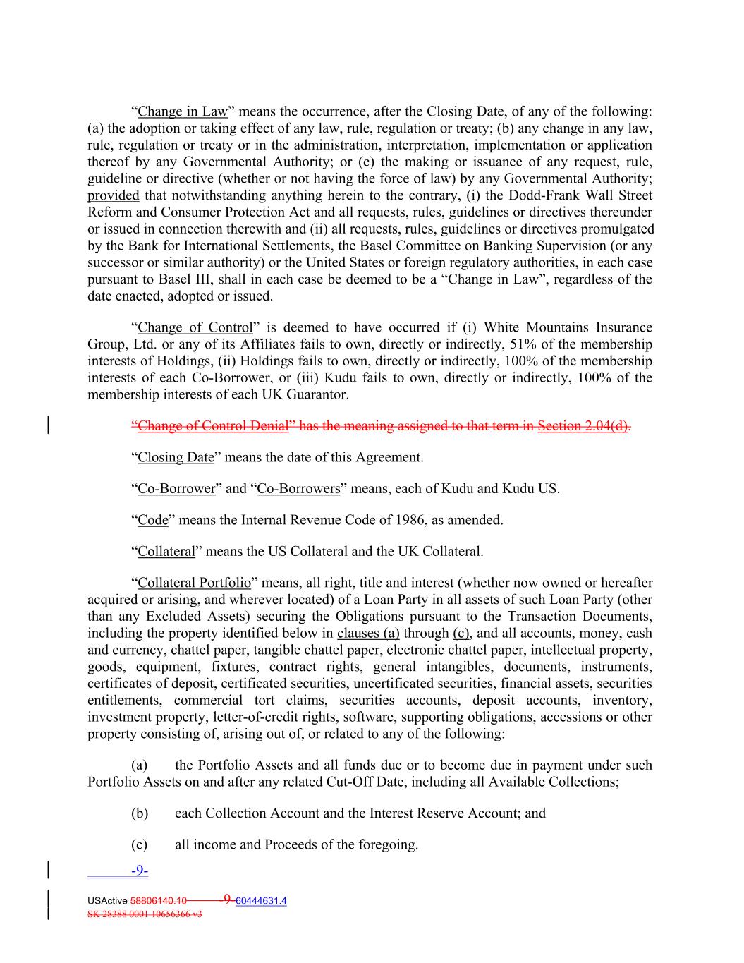 “Change in Law” means the occurrence, after the Closing Date, of any of the following: (a) the adoption or taking effect of any law, rule, regulation or treaty; (b) any change in any law, rule, regulation or treaty or in the administration, interpretation, implementation or application thereof by any Governmental Authority; or (c) the making or issuance of any request, rule, guideline or directive (whether or not having the force of law) by any Governmental Authority; provided that notwithstanding anything herein to the contrary, (i) the Dodd‐Frank Wall Street Reform and Consumer Protection Act and all requests, rules, guidelines or directives thereunder or issued in connection therewith and (ii) all requests, rules, guidelines or directives promulgated by the Bank for International Settlements, the Basel Committee on Banking Supervision (or any successor or similar authority) or the United States or foreign regulatory authorities, in each case pursuant to Basel III, shall in each case be deemed to be a “Change in Law”, regardless of the date enacted, adopted or issued. “Change of Control” is deemed to have occurred if (i) White Mountains Insurance Group, Ltd. or any of its Affiliates fails to own, directly or indirectly, 51% of the membership interests of Holdings, (ii) Holdings fails to own, directly or indirectly, 100% of the membership interests of each Co‐Borrower, or (iii) Kudu fails to own, directly or indirectly, 100% of the membership interests of each UK Guarantor. “Change of Control Denial” has the meaning assigned to that term in Section 2.04(d). “Closing Date” means the date of this Agreement. “Co‐Borrower” and “Co‐Borrowers” means, each of Kudu and Kudu US. “Code” means the Internal Revenue Code of 1986, as amended. “Collateral” means the US Collateral and the UK Collateral. “Collateral Portfolio” means, all right, title and interest (whether now owned or hereafter acquired or arising, and wherever located) of a Loan Party in all assets of such Loan Party (other than any Excluded Assets) securing the Obligations pursuant to the Transaction Documents, including the property identified below in clauses (a) through (c), and all accounts, money, cash and currency, chattel paper, tangible chattel paper, electronic chattel paper, intellectual property, goods, equipment, fixtures, contract rights, general intangibles, documents, instruments, certificates of deposit, certificated securities, uncertificated securities, financial assets, securities entitlements, commercial tort claims, securities accounts, deposit accounts, inventory, investment property, letter‐of‐credit rights, software, supporting obligations, accessions or other property consisting of, arising out of, or related to any of the following: (a) the Portfolio Assets and all funds due or to become due in payment under such Portfolio Assets on and after any related Cut‐Off Date, including all Available Collections; (b) each Collection Account and the Interest Reserve Account; and (c) all income and Proceeds of the foregoing. -9- USActive 58806140.10 -9-60444631.4 SK 28388 0001 10656366 v3