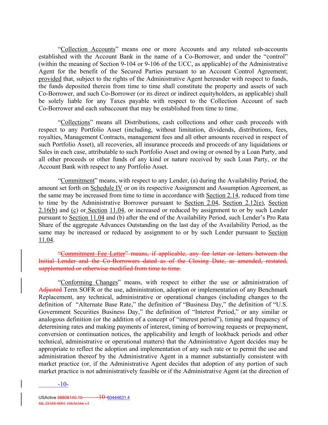“Collection Accounts” means one or more Accounts and any related sub‐accounts established with the Account Bank in the name of a Co‐Borrower, and under the “control” (within the meaning of Section 9‐104 or 9‐106 of the UCC, as applicable) of the Administrative Agent for the benefit of the Secured Parties pursuant to an Account Control Agreement; provided that, subject to the rights of the Administrative Agent hereunder with respect to funds, the funds deposited therein from time to time shall constitute the property and assets of such Co‐Borrower, and such Co‐Borrower (or its direct or indirect equityholders, as applicable) shall be solely liable for any Taxes payable with respect to the Collection Account of such Co‐Borrower and each subaccount that may be established from time to time. “Collections” means all Distributions, cash collections and other cash proceeds with respect to any Portfolio Asset (including, without limitation, dividends, distributions, fees, royalties, Management Contracts, management fees and all other amounts received in respect of such Portfolio Asset), all recoveries, all insurance proceeds and proceeds of any liquidations or Sales in each case, attributable to such Portfolio Asset and owing or owned by a Loan Party, and all other proceeds or other funds of any kind or nature received by such Loan Party, or the Account Bank with respect to any Portfolio Asset. “Commitment” means, with respect to any Lender, (a) during the Availability Period, the amount set forth on Schedule IV or on its respective Assignment and Assumption Agreement, as the same may be increased from time to time in accordance with Section 2.14, reduced from time to time by the Administrative Borrower pursuant to Section 2.04, Section 2.12(e), Section 2.16(b) and (c) or Section 11.04, or increased or reduced by assignment to or by such Lender pursuant to Section 11.04 and (b) after the end of the Availability Period, such Lender’s Pro Rata Share of the aggregate Advances Outstanding on the last day of the Availability Period, as the same may be increased or reduced by assignment to or by such Lender pursuant to Section 11.04. “Commitment Fee Letter” means, if applicable, any fee letter or letters between the Initial Lender and the Co‐Borrowers dated as of the Closing Date, as amended, restated, supplemented or otherwise modified from time to time. “Conforming Changes” means, with respect to either the use or administration of Adjusted Term SOFR or the use, administration, adoption or implementation of any Benchmark Replacement, any technical, administrative or operational changes (including changes to the definition of “Alternate Base Rate,” the definition of “Business Day,” the definition of “U.S. Government Securities Business Day,” the definition of “Interest Period,” or any similar or analogous definition (or the addition of a concept of “interest period”), timing and frequency of determining rates and making payments of interest, timing of borrowing requests or prepayment, conversion or continuation notices, the applicability and length of lookback periods and other technical, administrative or operational matters) that the Administrative Agent decides may be appropriate to reflect the adoption and implementation of any such rate or to permit the use and administration thereof by the Administrative Agent in a manner substantially consistent with market practice (or, if the Administrative Agent decides that adoption of any portion of such market practice is not administratively feasible or if the Administrative Agent (at the direction of -10- USActive 58806140.10 -10-60444631.4 SK 28388 0001 10656366 v3
