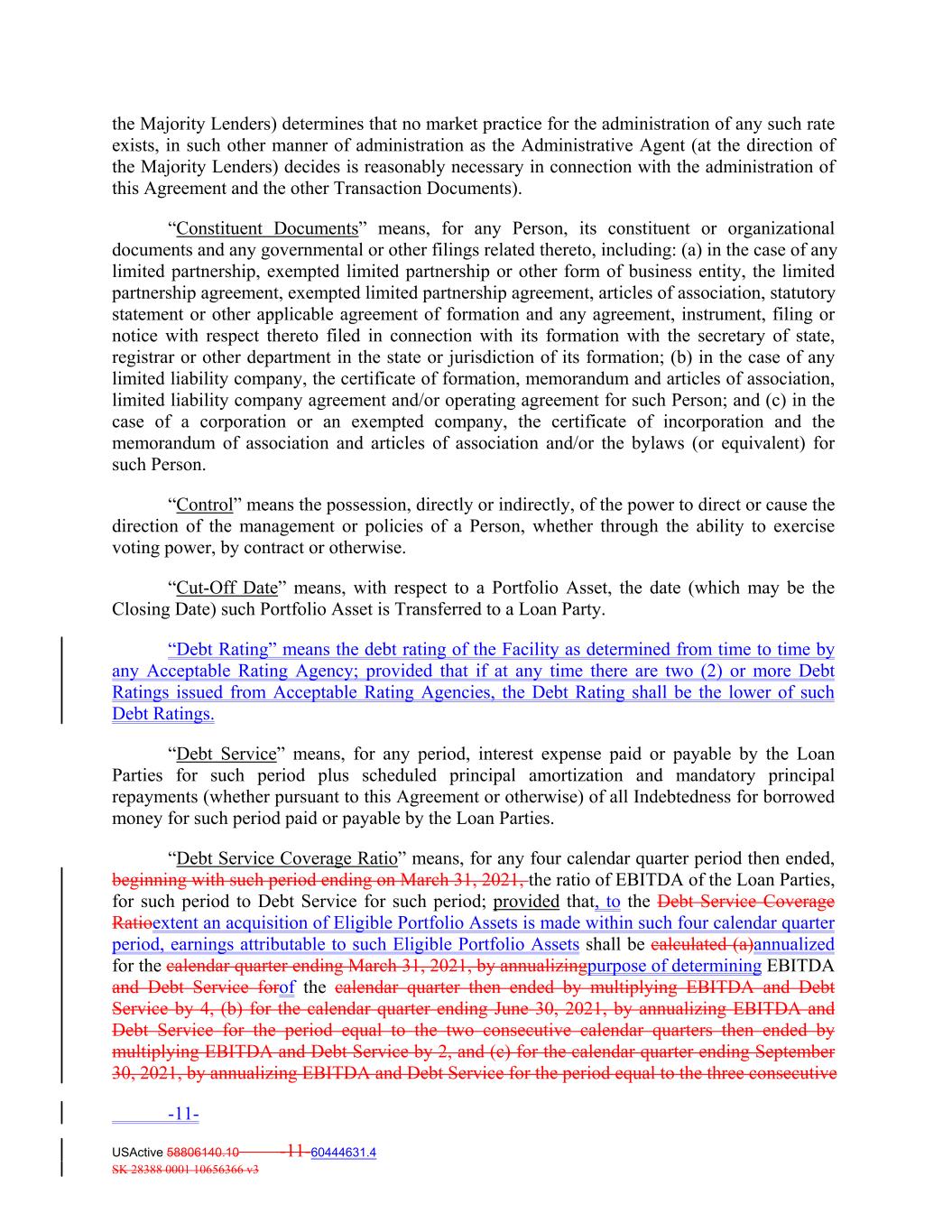 the Majority Lenders) determines that no market practice for the administration of any such rate exists, in such other manner of administration as the Administrative Agent (at the direction of the Majority Lenders) decides is reasonably necessary in connection with the administration of this Agreement and the other Transaction Documents). “Constituent Documents” means, for any Person, its constituent or organizational documents and any governmental or other filings related thereto, including: (a) in the case of any limited partnership, exempted limited partnership or other form of business entity, the limited partnership agreement, exempted limited partnership agreement, articles of association, statutory statement or other applicable agreement of formation and any agreement, instrument, filing or notice with respect thereto filed in connection with its formation with the secretary of state, registrar or other department in the state or jurisdiction of its formation; (b) in the case of any limited liability company, the certificate of formation, memorandum and articles of association, limited liability company agreement and/or operating agreement for such Person; and (c) in the case of a corporation or an exempted company, the certificate of incorporation and the memorandum of association and articles of association and/or the bylaws (or equivalent) for such Person. “Control” means the possession, directly or indirectly, of the power to direct or cause the direction of the management or policies of a Person, whether through the ability to exercise voting power, by contract or otherwise. “Cut‐Off Date” means, with respect to a Portfolio Asset, the date (which may be the Closing Date) such Portfolio Asset is Transferred to a Loan Party. “Debt Rating” means the debt rating of the Facility as determined from time to time by any Acceptable Rating Agency; provided that if at any time there are two (2) or more Debt Ratings issued from Acceptable Rating Agencies, the Debt Rating shall be the lower of such Debt Ratings. “Debt Service” means, for any period, interest expense paid or payable by the Loan Parties for such period plus scheduled principal amortization and mandatory principal repayments (whether pursuant to this Agreement or otherwise) of all Indebtedness for borrowed money for such period paid or payable by the Loan Parties. “Debt Service Coverage Ratio” means, for any four calendar quarter period then ended, beginning with such period ending on March 31, 2021, the ratio of EBITDA of the Loan Parties, for such period to Debt Service for such period; provided that, to the Debt Service Coverage Ratioextent an acquisition of Eligible Portfolio Assets is made within such four calendar quarter period, earnings attributable to such Eligible Portfolio Assets shall be calculated (a)annualized for the calendar quarter ending March 31, 2021, by annualizingpurpose of determining EBITDA and Debt Service forof the calendar quarter then ended by multiplying EBITDA and Debt Service by 4, (b) for the calendar quarter ending June 30, 2021, by annualizing EBITDA and Debt Service for the period equal to the two consecutive calendar quarters then ended by multiplying EBITDA and Debt Service by 2, and (c) for the calendar quarter ending September 30, 2021, by annualizing EBITDA and Debt Service for the period equal to the three consecutive -11- USActive 58806140.10 -11-60444631.4 SK 28388 0001 10656366 v3