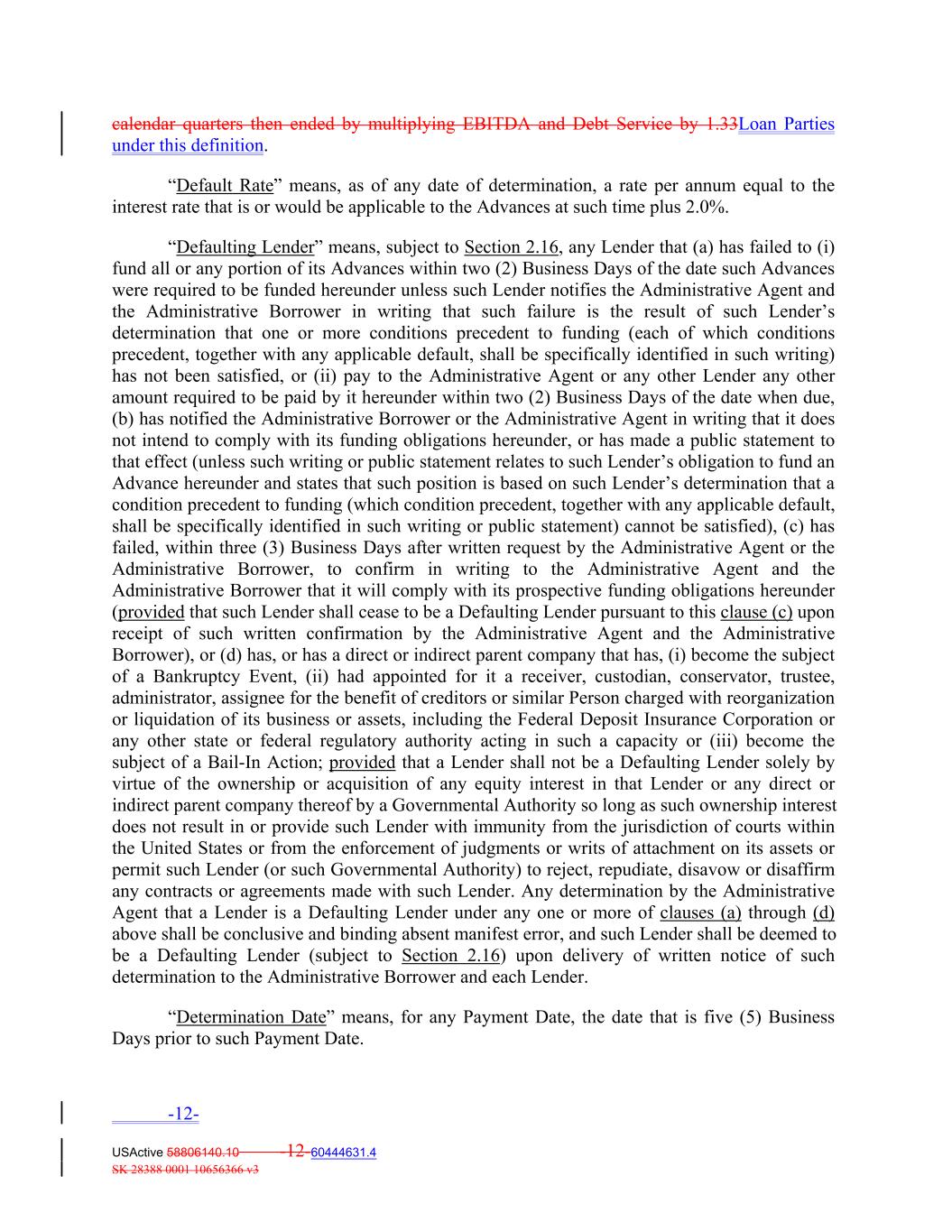 calendar quarters then ended by multiplying EBITDA and Debt Service by 1.33Loan Parties under this definition. “Default Rate” means, as of any date of determination, a rate per annum equal to the interest rate that is or would be applicable to the Advances at such time plus 2.0%. “Defaulting Lender” means, subject to Section 2.16, any Lender that (a) has failed to (i) fund all or any portion of its Advances within two (2) Business Days of the date such Advances were required to be funded hereunder unless such Lender notifies the Administrative Agent and the Administrative Borrower in writing that such failure is the result of such Lender’s determination that one or more conditions precedent to funding (each of which conditions precedent, together with any applicable default, shall be specifically identified in such writing) has not been satisfied, or (ii) pay to the Administrative Agent or any other Lender any other amount required to be paid by it hereunder within two (2) Business Days of the date when due, (b) has notified the Administrative Borrower or the Administrative Agent in writing that it does not intend to comply with its funding obligations hereunder, or has made a public statement to that effect (unless such writing or public statement relates to such Lender’s obligation to fund an Advance hereunder and states that such position is based on such Lender’s determination that a condition precedent to funding (which condition precedent, together with any applicable default, shall be specifically identified in such writing or public statement) cannot be satisfied), (c) has failed, within three (3) Business Days after written request by the Administrative Agent or the Administrative Borrower, to confirm in writing to the Administrative Agent and the Administrative Borrower that it will comply with its prospective funding obligations hereunder (provided that such Lender shall cease to be a Defaulting Lender pursuant to this clause (c) upon receipt of such written confirmation by the Administrative Agent and the Administrative Borrower), or (d) has, or has a direct or indirect parent company that has, (i) become the subject of a Bankruptcy Event, (ii) had appointed for it a receiver, custodian, conservator, trustee, administrator, assignee for the benefit of creditors or similar Person charged with reorganization or liquidation of its business or assets, including the Federal Deposit Insurance Corporation or any other state or federal regulatory authority acting in such a capacity or (iii) become the subject of a Bail‐In Action; provided that a Lender shall not be a Defaulting Lender solely by virtue of the ownership or acquisition of any equity interest in that Lender or any direct or indirect parent company thereof by a Governmental Authority so long as such ownership interest does not result in or provide such Lender with immunity from the jurisdiction of courts within the United States or from the enforcement of judgments or writs of attachment on its assets or permit such Lender (or such Governmental Authority) to reject, repudiate, disavow or disaffirm any contracts or agreements made with such Lender. Any determination by the Administrative Agent that a Lender is a Defaulting Lender under any one or more of clauses (a) through (d) above shall be conclusive and binding absent manifest error, and such Lender shall be deemed to be a Defaulting Lender (subject to Section 2.16) upon delivery of written notice of such determination to the Administrative Borrower and each Lender. “Determination Date” means, for any Payment Date, the date that is five (5) Business Days prior to such Payment Date. -12- USActive 58806140.10 -12-60444631.4 SK 28388 0001 10656366 v3