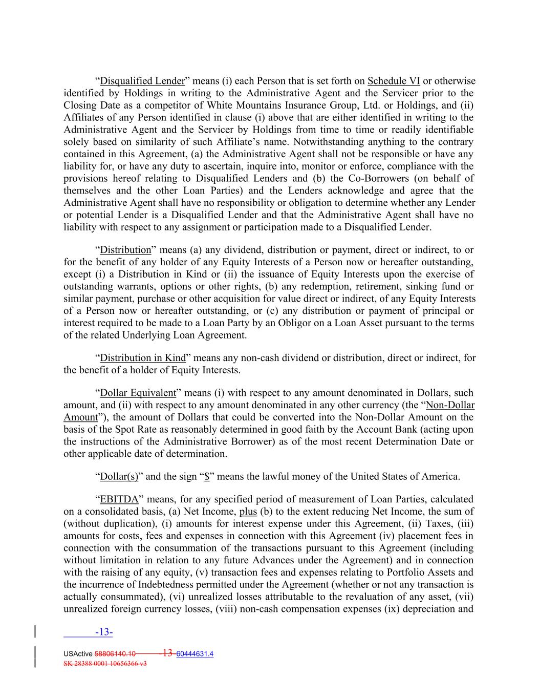 “Disqualified Lender” means (i) each Person that is set forth on Schedule VI or otherwise identified by Holdings in writing to the Administrative Agent and the Servicer prior to the Closing Date as a competitor of White Mountains Insurance Group, Ltd. or Holdings, and (ii) Affiliates of any Person identified in clause (i) above that are either identified in writing to the Administrative Agent and the Servicer by Holdings from time to time or readily identifiable solely based on similarity of such Affiliate’s name. Notwithstanding anything to the contrary contained in this Agreement, (a) the Administrative Agent shall not be responsible or have any liability for, or have any duty to ascertain, inquire into, monitor or enforce, compliance with the provisions hereof relating to Disqualified Lenders and (b) the Co‐Borrowers (on behalf of themselves and the other Loan Parties) and the Lenders acknowledge and agree that the Administrative Agent shall have no responsibility or obligation to determine whether any Lender or potential Lender is a Disqualified Lender and that the Administrative Agent shall have no liability with respect to any assignment or participation made to a Disqualified Lender. “Distribution” means (a) any dividend, distribution or payment, direct or indirect, to or for the benefit of any holder of any Equity Interests of a Person now or hereafter outstanding, except (i) a Distribution in Kind or (ii) the issuance of Equity Interests upon the exercise of outstanding warrants, options or other rights, (b) any redemption, retirement, sinking fund or similar payment, purchase or other acquisition for value direct or indirect, of any Equity Interests of a Person now or hereafter outstanding, or (c) any distribution or payment of principal or interest required to be made to a Loan Party by an Obligor on a Loan Asset pursuant to the terms of the related Underlying Loan Agreement. “Distribution in Kind” means any non‐cash dividend or distribution, direct or indirect, for the benefit of a holder of Equity Interests. “Dollar Equivalent” means (i) with respect to any amount denominated in Dollars, such amount, and (ii) with respect to any amount denominated in any other currency (the “Non‐Dollar Amount”), the amount of Dollars that could be converted into the Non‐Dollar Amount on the basis of the Spot Rate as reasonably determined in good faith by the Account Bank (acting upon the instructions of the Administrative Borrower) as of the most recent Determination Date or other applicable date of determination. “Dollar(s)” and the sign “$” means the lawful money of the United States of America. “EBITDA” means, for any specified period of measurement of Loan Parties, calculated on a consolidated basis, (a) Net Income, plus (b) to the extent reducing Net Income, the sum of (without duplication), (i) amounts for interest expense under this Agreement, (ii) Taxes, (iii) amounts for costs, fees and expenses in connection with this Agreement (iv) placement fees in connection with the consummation of the transactions pursuant to this Agreement (including without limitation in relation to any future Advances under the Agreement) and in connection with the raising of any equity, (v) transaction fees and expenses relating to Portfolio Assets and the incurrence of Indebtedness permitted under the Agreement (whether or not any transaction is actually consummated), (vi) unrealized losses attributable to the revaluation of any asset, (vii) unrealized foreign currency losses, (viii) non‐cash compensation expenses (ix) depreciation and -13- USActive 58806140.10 -13-60444631.4 SK 28388 0001 10656366 v3