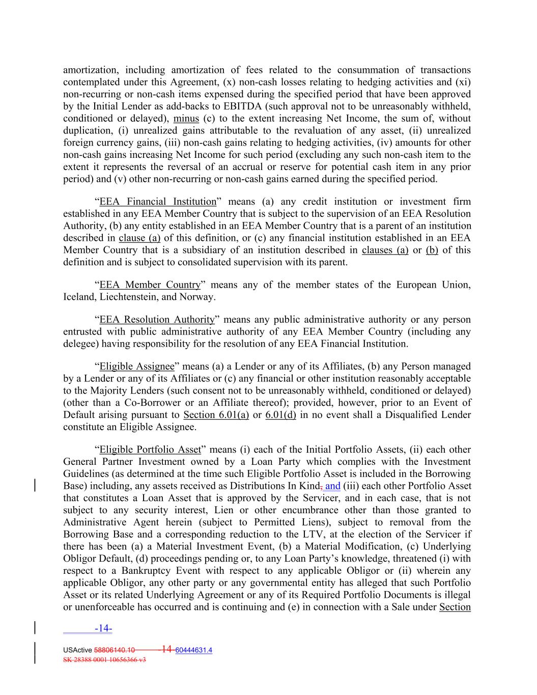 amortization, including amortization of fees related to the consummation of transactions contemplated under this Agreement, (x) non‐cash losses relating to hedging activities and (xi) non‐recurring or non‐cash items expensed during the specified period that have been approved by the Initial Lender as add‐backs to EBITDA (such approval not to be unreasonably withheld, conditioned or delayed), minus (c) to the extent increasing Net Income, the sum of, without duplication, (i) unrealized gains attributable to the revaluation of any asset, (ii) unrealized foreign currency gains, (iii) non‐cash gains relating to hedging activities, (iv) amounts for other non‐cash gains increasing Net Income for such period (excluding any such non‐cash item to the extent it represents the reversal of an accrual or reserve for potential cash item in any prior period) and (v) other non‐recurring or non‐cash gains earned during the specified period. “EEA Financial Institution” means (a) any credit institution or investment firm established in any EEA Member Country that is subject to the supervision of an EEA Resolution Authority, (b) any entity established in an EEA Member Country that is a parent of an institution described in clause (a) of this definition, or (c) any financial institution established in an EEA Member Country that is a subsidiary of an institution described in clauses (a) or (b) of this definition and is subject to consolidated supervision with its parent. “EEA Member Country” means any of the member states of the European Union, Iceland, Liechtenstein, and Norway. “EEA Resolution Authority” means any public administrative authority or any person entrusted with public administrative authority of any EEA Member Country (including any delegee) having responsibility for the resolution of any EEA Financial Institution. “Eligible Assignee” means (a) a Lender or any of its Affiliates, (b) any Person managed by a Lender or any of its Affiliates or (c) any financial or other institution reasonably acceptable to the Majority Lenders (such consent not to be unreasonably withheld, conditioned or delayed) (other than a Co‐Borrower or an Affiliate thereof); provided, however, prior to an Event of Default arising pursuant to Section 6.01(a) or 6.01(d) in no event shall a Disqualified Lender constitute an Eligible Assignee. “Eligible Portfolio Asset” means (i) each of the Initial Portfolio Assets, (ii) each other General Partner Investment owned by a Loan Party which complies with the Investment Guidelines (as determined at the time such Eligible Portfolio Asset is included in the Borrowing Base) including, any assets received as Distributions In Kind, and (iii) each other Portfolio Asset that constitutes a Loan Asset that is approved by the Servicer, and in each case, that is not subject to any security interest, Lien or other encumbrance other than those granted to Administrative Agent herein (subject to Permitted Liens), subject to removal from the Borrowing Base and a corresponding reduction to the LTV, at the election of the Servicer if there has been (a) a Material Investment Event, (b) a Material Modification, (c) Underlying Obligor Default, (d) proceedings pending or, to any Loan Party’s knowledge, threatened (i) with respect to a Bankruptcy Event with respect to any applicable Obligor or (ii) wherein any applicable Obligor, any other party or any governmental entity has alleged that such Portfolio Asset or its related Underlying Agreement or any of its Required Portfolio Documents is illegal or unenforceable has occurred and is continuing and (e) in connection with a Sale under Section -14- USActive 58806140.10 -14-60444631.4 SK 28388 0001 10656366 v3