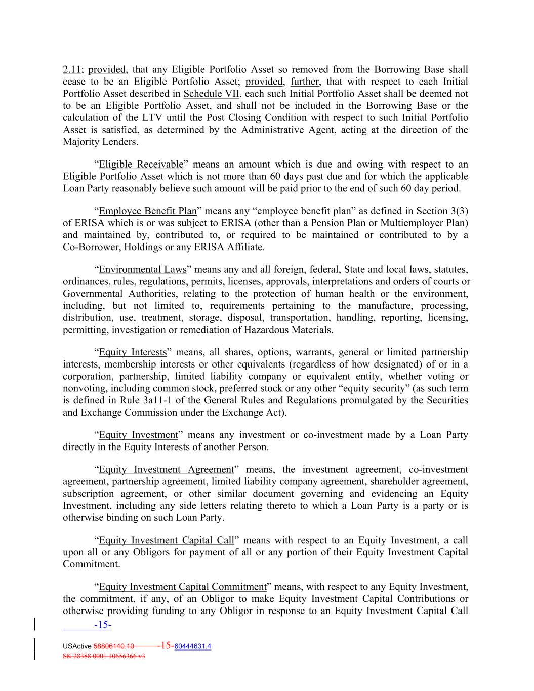 2.11; provided, that any Eligible Portfolio Asset so removed from the Borrowing Base shall cease to be an Eligible Portfolio Asset; provided, further, that with respect to each Initial Portfolio Asset described in Schedule VII, each such Initial Portfolio Asset shall be deemed not to be an Eligible Portfolio Asset, and shall not be included in the Borrowing Base or the calculation of the LTV until the Post Closing Condition with respect to such Initial Portfolio Asset is satisfied, as determined by the Administrative Agent, acting at the direction of the Majority Lenders. “Eligible Receivable” means an amount which is due and owing with respect to an Eligible Portfolio Asset which is not more than 60 days past due and for which the applicable Loan Party reasonably believe such amount will be paid prior to the end of such 60 day period. “Employee Benefit Plan” means any “employee benefit plan” as defined in Section 3(3) of ERISA which is or was subject to ERISA (other than a Pension Plan or Multiemployer Plan) and maintained by, contributed to, or required to be maintained or contributed to by a Co‐Borrower, Holdings or any ERISA Affiliate. “Environmental Laws” means any and all foreign, federal, State and local laws, statutes, ordinances, rules, regulations, permits, licenses, approvals, interpretations and orders of courts or Governmental Authorities, relating to the protection of human health or the environment, including, but not limited to, requirements pertaining to the manufacture, processing, distribution, use, treatment, storage, disposal, transportation, handling, reporting, licensing, permitting, investigation or remediation of Hazardous Materials. “Equity Interests” means, all shares, options, warrants, general or limited partnership interests, membership interests or other equivalents (regardless of how designated) of or in a corporation, partnership, limited liability company or equivalent entity, whether voting or nonvoting, including common stock, preferred stock or any other “equity security” (as such term is defined in Rule 3a11‐1 of the General Rules and Regulations promulgated by the Securities and Exchange Commission under the Exchange Act). “Equity Investment” means any investment or co‐investment made by a Loan Party directly in the Equity Interests of another Person. “Equity Investment Agreement” means, the investment agreement, co‐investment agreement, partnership agreement, limited liability company agreement, shareholder agreement, subscription agreement, or other similar document governing and evidencing an Equity Investment, including any side letters relating thereto to which a Loan Party is a party or is otherwise binding on such Loan Party. “Equity Investment Capital Call” means with respect to an Equity Investment, a call upon all or any Obligors for payment of all or any portion of their Equity Investment Capital Commitment. “Equity Investment Capital Commitment” means, with respect to any Equity Investment, the commitment, if any, of an Obligor to make Equity Investment Capital Contributions or otherwise providing funding to any Obligor in response to an Equity Investment Capital Call -15- USActive 58806140.10 -15-60444631.4 SK 28388 0001 10656366 v3