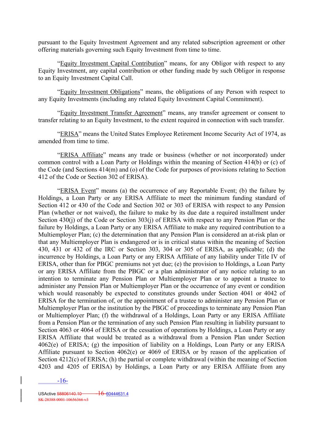 pursuant to the Equity Investment Agreement and any related subscription agreement or other offering materials governing such Equity Investment from time to time. “Equity Investment Capital Contribution” means, for any Obligor with respect to any Equity Investment, any capital contribution or other funding made by such Obligor in response to an Equity Investment Capital Call. “Equity Investment Obligations” means, the obligations of any Person with respect to any Equity Investments (including any related Equity Investment Capital Commitment). “Equity Investment Transfer Agreement” means, any transfer agreement or consent to transfer relating to an Equity Investment, to the extent required in connection with such transfer. “ERISA” means the United States Employee Retirement Income Security Act of 1974, as amended from time to time. “ERISA Affiliate” means any trade or business (whether or not incorporated) under common control with a Loan Party or Holdings within the meaning of Section 414(b) or (c) of the Code (and Sections 414(m) and (o) of the Code for purposes of provisions relating to Section 412 of the Code or Section 302 of ERISA). “ERISA Event” means (a) the occurrence of any Reportable Event; (b) the failure by Holdings, a Loan Party or any ERISA Affiliate to meet the minimum funding standard of Section 412 or 430 of the Code and Section 302 or 303 of ERISA with respect to any Pension Plan (whether or not waived), the failure to make by its due date a required installment under Section 430(j) of the Code or Section 303(j) of ERISA with respect to any Pension Plan or the failure by Holdings, a Loan Party or any ERISA Affiliate to make any required contribution to a Multiemployer Plan; (c) the determination that any Pension Plan is considered an at‐risk plan or that any Multiemployer Plan is endangered or is in critical status within the meaning of Section 430, 431 or 432 of the IRC or Section 303, 304 or 305 of ERISA, as applicable; (d) the incurrence by Holdings, a Loan Party or any ERISA Affiliate of any liability under Title IV of ERISA, other than for PBGC premiums not yet due; (e) the provision to Holdings, a Loan Party or any ERISA Affiliate from the PBGC or a plan administrator of any notice relating to an intention to terminate any Pension Plan or Multiemployer Plan or to appoint a trustee to administer any Pension Plan or Multiemployer Plan or the occurrence of any event or condition which would reasonably be expected to constitutes grounds under Section 4041 or 4042 of ERISA for the termination of, or the appointment of a trustee to administer any Pension Plan or Multiemployer Plan or the institution by the PBGC of proceedings to terminate any Pension Plan or Multiemployer Plan; (f) the withdrawal of a Holdings, Loan Party or any ERISA Affiliate from a Pension Plan or the termination of any such Pension Plan resulting in liability pursuant to Section 4063 or 4064 of ERISA or the cessation of operations by Holdings, a Loan Party or any ERISA Affiliate that would be treated as a withdrawal from a Pension Plan under Section 4062(e) of ERISA; (g) the imposition of liability on a Holdings, Loan Party or any ERISA Affiliate pursuant to Section 4062(e) or 4069 of ERISA or by reason of the application of Section 4212(c) of ERISA; (h) the partial or complete withdrawal (within the meaning of Section 4203 and 4205 of ERISA) by Holdings, a Loan Party or any ERISA Affiliate from any -16- USActive 58806140.10 -16-60444631.4 SK 28388 0001 10656366 v3