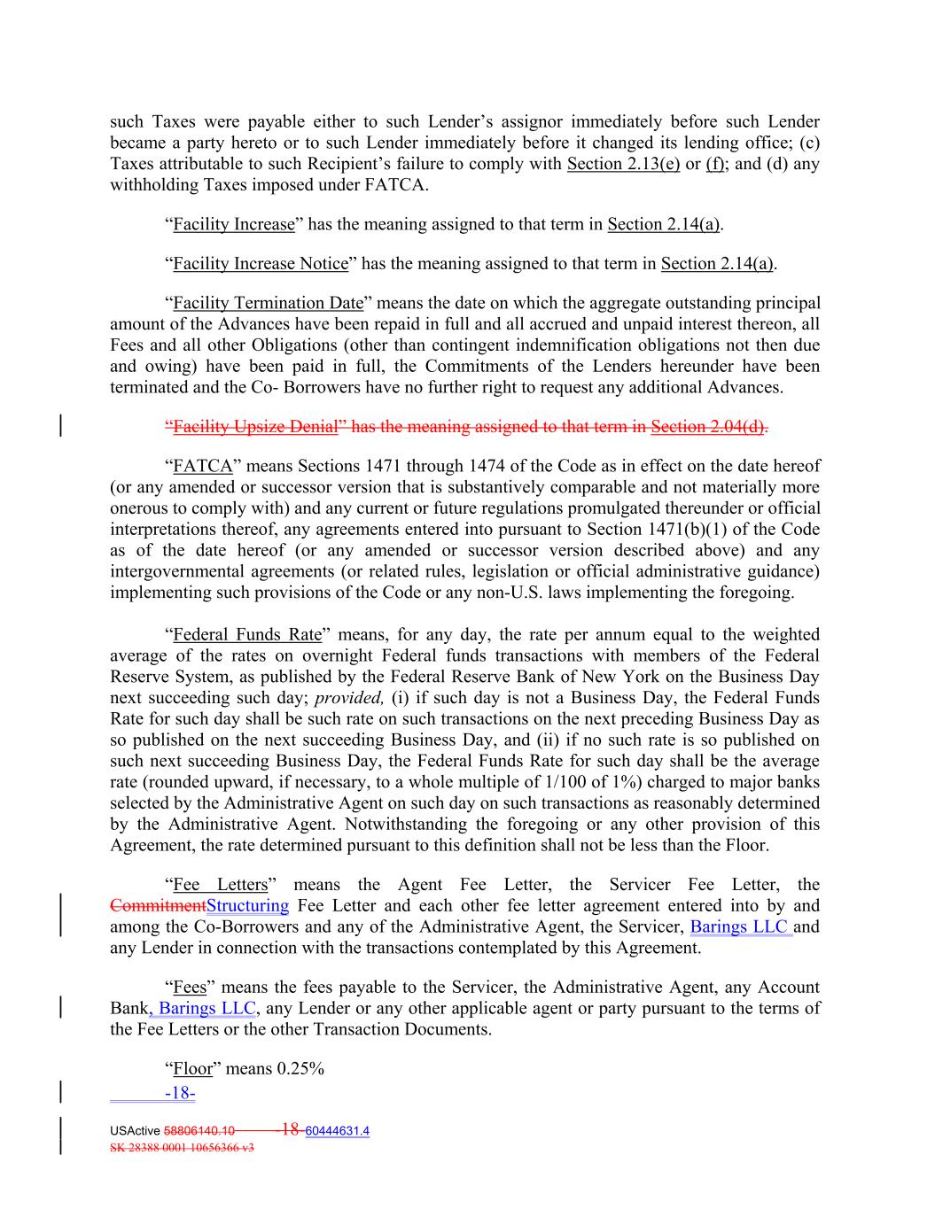 such Taxes were payable either to such Lender’s assignor immediately before such Lender became a party hereto or to such Lender immediately before it changed its lending office; (c) Taxes attributable to such Recipient’s failure to comply with Section 2.13(e) or (f); and (d) any withholding Taxes imposed under FATCA. “Facility Increase” has the meaning assigned to that term in Section 2.14(a). “Facility Increase Notice” has the meaning assigned to that term in Section 2.14(a). “Facility Termination Date” means the date on which the aggregate outstanding principal amount of the Advances have been repaid in full and all accrued and unpaid interest thereon, all Fees and all other Obligations (other than contingent indemnification obligations not then due and owing) have been paid in full, the Commitments of the Lenders hereunder have been terminated and the Co‐ Borrowers have no further right to request any additional Advances. “Facility Upsize Denial” has the meaning assigned to that term in Section 2.04(d). “FATCA” means Sections 1471 through 1474 of the Code as in effect on the date hereof (or any amended or successor version that is substantively comparable and not materially more onerous to comply with) and any current or future regulations promulgated thereunder or official interpretations thereof, any agreements entered into pursuant to Section 1471(b)(1) of the Code as of the date hereof (or any amended or successor version described above) and any intergovernmental agreements (or related rules, legislation or official administrative guidance) implementing such provisions of the Code or any non‐U.S. laws implementing the foregoing. “Federal Funds Rate” means, for any day, the rate per annum equal to the weighted average of the rates on overnight Federal funds transactions with members of the Federal Reserve System, as published by the Federal Reserve Bank of New York on the Business Day next succeeding such day; provided, (i) if such day is not a Business Day, the Federal Funds Rate for such day shall be such rate on such transactions on the next preceding Business Day as so published on the next succeeding Business Day, and (ii) if no such rate is so published on such next succeeding Business Day, the Federal Funds Rate for such day shall be the average rate (rounded upward, if necessary, to a whole multiple of 1/100 of 1%) charged to major banks selected by the Administrative Agent on such day on such transactions as reasonably determined by the Administrative Agent. Notwithstanding the foregoing or any other provision of this Agreement, the rate determined pursuant to this definition shall not be less than the Floor. “Fee Letters” means the Agent Fee Letter, the Servicer Fee Letter, the CommitmentStructuring Fee Letter and each other fee letter agreement entered into by and among the Co‐Borrowers and any of the Administrative Agent, the Servicer, Barings LLC and any Lender in connection with the transactions contemplated by this Agreement. “Fees” means the fees payable to the Servicer, the Administrative Agent, any Account Bank, Barings LLC, any Lender or any other applicable agent or party pursuant to the terms of the Fee Letters or the other Transaction Documents. “Floor” means 0.25% -18- USActive 58806140.10 -18-60444631.4 SK 28388 0001 10656366 v3