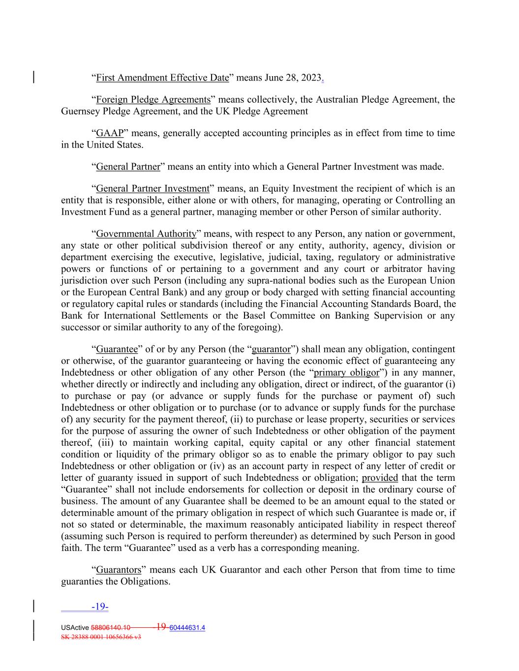 “First Amendment Effective Date” means June 28, 2023. “Foreign Pledge Agreements” means collectively, the Australian Pledge Agreement, the Guernsey Pledge Agreement, and the UK Pledge Agreement “GAAP” means, generally accepted accounting principles as in effect from time to time in the United States. “General Partner” means an entity into which a General Partner Investment was made. “General Partner Investment” means, an Equity Investment the recipient of which is an entity that is responsible, either alone or with others, for managing, operating or Controlling an Investment Fund as a general partner, managing member or other Person of similar authority. “Governmental Authority” means, with respect to any Person, any nation or government, any state or other political subdivision thereof or any entity, authority, agency, division or department exercising the executive, legislative, judicial, taxing, regulatory or administrative powers or functions of or pertaining to a government and any court or arbitrator having jurisdiction over such Person (including any supra‐national bodies such as the European Union or the European Central Bank) and any group or body charged with setting financial accounting or regulatory capital rules or standards (including the Financial Accounting Standards Board, the Bank for International Settlements or the Basel Committee on Banking Supervision or any successor or similar authority to any of the foregoing). “Guarantee” of or by any Person (the “guarantor”) shall mean any obligation, contingent or otherwise, of the guarantor guaranteeing or having the economic effect of guaranteeing any Indebtedness or other obligation of any other Person (the “primary obligor”) in any manner, whether directly or indirectly and including any obligation, direct or indirect, of the guarantor (i) to purchase or pay (or advance or supply funds for the purchase or payment of) such Indebtedness or other obligation or to purchase (or to advance or supply funds for the purchase of) any security for the payment thereof, (ii) to purchase or lease property, securities or services for the purpose of assuring the owner of such Indebtedness or other obligation of the payment thereof, (iii) to maintain working capital, equity capital or any other financial statement condition or liquidity of the primary obligor so as to enable the primary obligor to pay such Indebtedness or other obligation or (iv) as an account party in respect of any letter of credit or letter of guaranty issued in support of such Indebtedness or obligation; provided that the term “Guarantee” shall not include endorsements for collection or deposit in the ordinary course of business. The amount of any Guarantee shall be deemed to be an amount equal to the stated or determinable amount of the primary obligation in respect of which such Guarantee is made or, if not so stated or determinable, the maximum reasonably anticipated liability in respect thereof (assuming such Person is required to perform thereunder) as determined by such Person in good faith. The term “Guarantee” used as a verb has a corresponding meaning. “Guarantors” means each UK Guarantor and each other Person that from time to time guaranties the Obligations. -19- USActive 58806140.10 -19-60444631.4 SK 28388 0001 10656366 v3