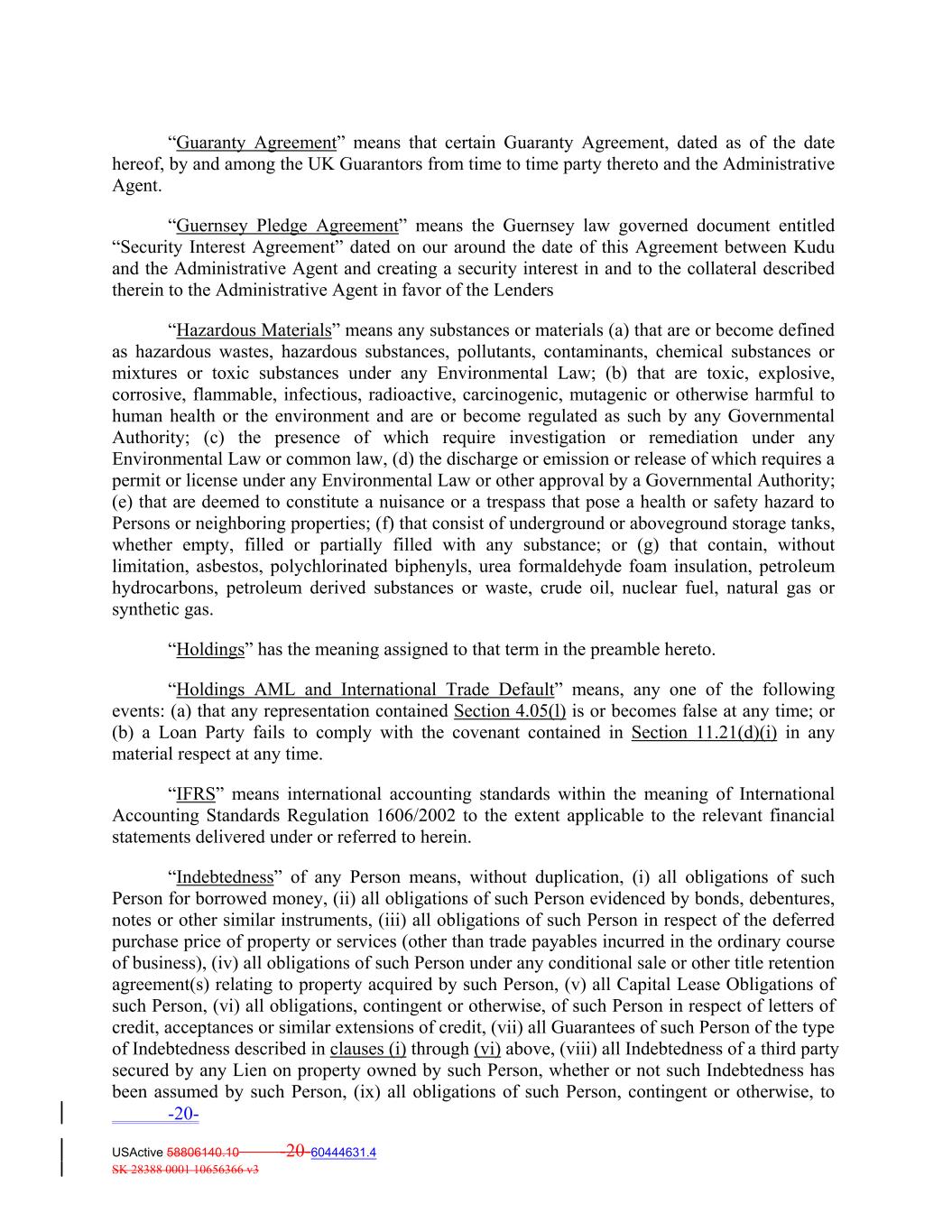 “Guaranty Agreement” means that certain Guaranty Agreement, dated as of the date hereof, by and among the UK Guarantors from time to time party thereto and the Administrative Agent. “Guernsey Pledge Agreement” means the Guernsey law governed document entitled “Security Interest Agreement” dated on our around the date of this Agreement between Kudu and the Administrative Agent and creating a security interest in and to the collateral described therein to the Administrative Agent in favor of the Lenders “Hazardous Materials” means any substances or materials (a) that are or become defined as hazardous wastes, hazardous substances, pollutants, contaminants, chemical substances or mixtures or toxic substances under any Environmental Law; (b) that are toxic, explosive, corrosive, flammable, infectious, radioactive, carcinogenic, mutagenic or otherwise harmful to human health or the environment and are or become regulated as such by any Governmental Authority; (c) the presence of which require investigation or remediation under any Environmental Law or common law, (d) the discharge or emission or release of which requires a permit or license under any Environmental Law or other approval by a Governmental Authority; (e) that are deemed to constitute a nuisance or a trespass that pose a health or safety hazard to Persons or neighboring properties; (f) that consist of underground or aboveground storage tanks, whether empty, filled or partially filled with any substance; or (g) that contain, without limitation, asbestos, polychlorinated biphenyls, urea formaldehyde foam insulation, petroleum hydrocarbons, petroleum derived substances or waste, crude oil, nuclear fuel, natural gas or synthetic gas. “Holdings” has the meaning assigned to that term in the preamble hereto. “Holdings AML and International Trade Default” means, any one of the following events: (a) that any representation contained Section 4.05(l) is or becomes false at any time; or (b) a Loan Party fails to comply with the covenant contained in Section 11.21(d)(i) in any material respect at any time. “IFRS” means international accounting standards within the meaning of International Accounting Standards Regulation 1606/2002 to the extent applicable to the relevant financial statements delivered under or referred to herein. “Indebtedness” of any Person means, without duplication, (i) all obligations of such Person for borrowed money, (ii) all obligations of such Person evidenced by bonds, debentures, notes or other similar instruments, (iii) all obligations of such Person in respect of the deferred purchase price of property or services (other than trade payables incurred in the ordinary course of business), (iv) all obligations of such Person under any conditional sale or other title retention agreement(s) relating to property acquired by such Person, (v) all Capital Lease Obligations of such Person, (vi) all obligations, contingent or otherwise, of such Person in respect of letters of credit, acceptances or similar extensions of credit, (vii) all Guarantees of such Person of the type of Indebtedness described in clauses (i) through (vi) above, (viii) all Indebtedness of a third party secured by any Lien on property owned by such Person, whether or not such Indebtedness has been assumed by such Person, (ix) all obligations of such Person, contingent or otherwise, to -20- USActive 58806140.10 -20-60444631.4 SK 28388 0001 10656366 v3