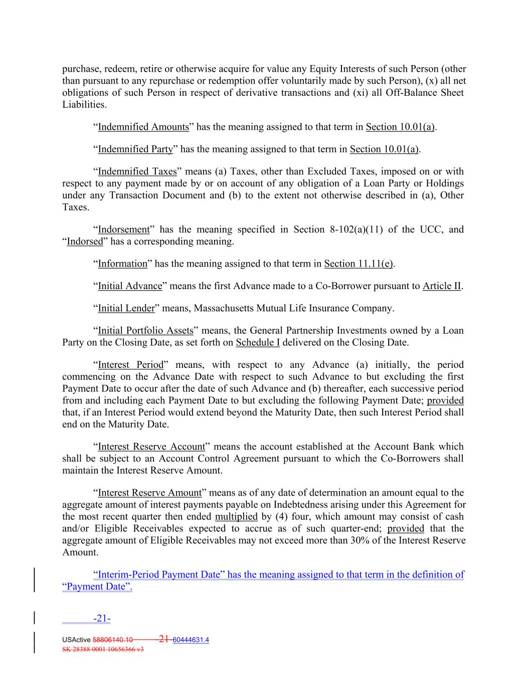 purchase, redeem, retire or otherwise acquire for value any Equity Interests of such Person (other than pursuant to any repurchase or redemption offer voluntarily made by such Person), (x) all net obligations of such Person in respect of derivative transactions and (xi) all Off‐Balance Sheet Liabilities. “Indemnified Amounts” has the meaning assigned to that term in Section 10.01(a). “Indemnified Party” has the meaning assigned to that term in Section 10.01(a). “Indemnified Taxes” means (a) Taxes, other than Excluded Taxes, imposed on or with respect to any payment made by or on account of any obligation of a Loan Party or Holdings under any Transaction Document and (b) to the extent not otherwise described in (a), Other Taxes. “Indorsement” has the meaning specified in Section 8‐102(a)(11) of the UCC, and “Indorsed” has a corresponding meaning. “Information” has the meaning assigned to that term in Section 11.11(e). “Initial Advance” means the first Advance made to a Co‐Borrower pursuant to Article II. “Initial Lender” means, Massachusetts Mutual Life Insurance Company. “Initial Portfolio Assets” means, the General Partnership Investments owned by a Loan Party on the Closing Date, as set forth on Schedule I delivered on the Closing Date. “Interest Period” means, with respect to any Advance (a) initially, the period commencing on the Advance Date with respect to such Advance to but excluding the first Payment Date to occur after the date of such Advance and (b) thereafter, each successive period from and including each Payment Date to but excluding the following Payment Date; provided that, if an Interest Period would extend beyond the Maturity Date, then such Interest Period shall end on the Maturity Date. “Interest Reserve Account” means the account established at the Account Bank which shall be subject to an Account Control Agreement pursuant to which the Co‐Borrowers shall maintain the Interest Reserve Amount. “Interest Reserve Amount” means as of any date of determination an amount equal to the aggregate amount of interest payments payable on Indebtedness arising under this Agreement for the most recent quarter then ended multiplied by (4) four, which amount may consist of cash and/or Eligible Receivables expected to accrue as of such quarter‐end; provided that the aggregate amount of Eligible Receivables may not exceed more than 30% of the Interest Reserve Amount. “Interim-Period Payment Date” has the meaning assigned to that term in the definition of “Payment Date”. -21- USActive 58806140.10 -21-60444631.4 SK 28388 0001 10656366 v3
