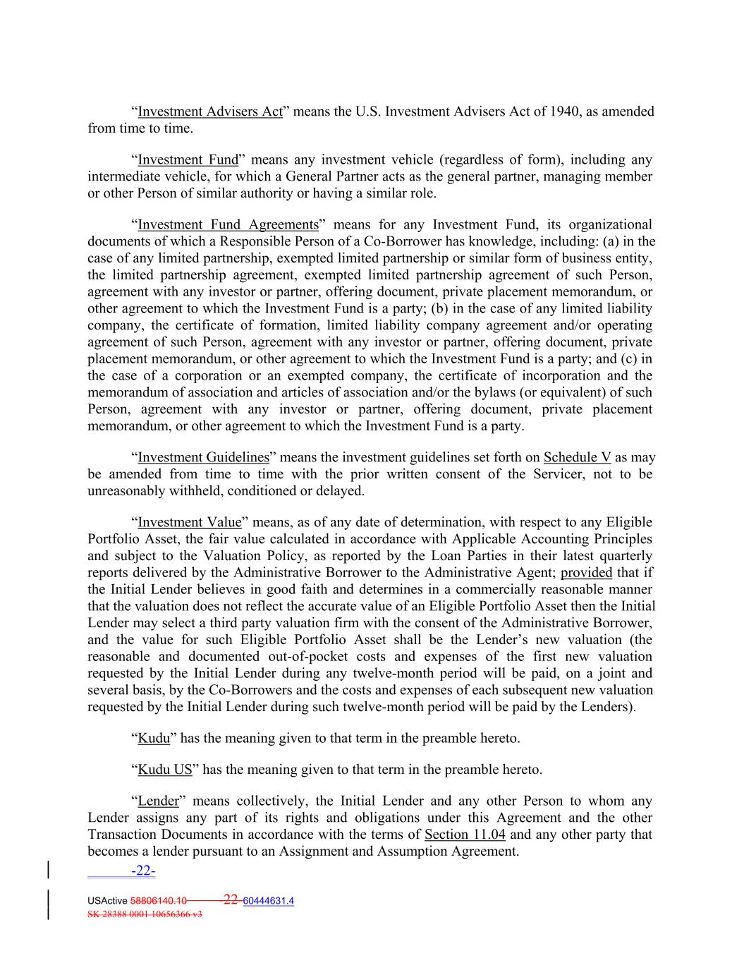 “Investment Advisers Act” means the U.S. Investment Advisers Act of 1940, as amended from time to time. “Investment Fund” means any investment vehicle (regardless of form), including any intermediate vehicle, for which a General Partner acts as the general partner, managing member or other Person of similar authority or having a similar role. “Investment Fund Agreements” means for any Investment Fund, its organizational documents of which a Responsible Person of a Co‐Borrower has knowledge, including: (a) in the case of any limited partnership, exempted limited partnership or similar form of business entity, the limited partnership agreement, exempted limited partnership agreement of such Person, agreement with any investor or partner, offering document, private placement memorandum, or other agreement to which the Investment Fund is a party; (b) in the case of any limited liability company, the certificate of formation, limited liability company agreement and/or operating agreement of such Person, agreement with any investor or partner, offering document, private placement memorandum, or other agreement to which the Investment Fund is a party; and (c) in the case of a corporation or an exempted company, the certificate of incorporation and the memorandum of association and articles of association and/or the bylaws (or equivalent) of such Person, agreement with any investor or partner, offering document, private placement memorandum, or other agreement to which the Investment Fund is a party. “Investment Guidelines” means the investment guidelines set forth on Schedule V as may be amended from time to time with the prior written consent of the Servicer, not to be unreasonably withheld, conditioned or delayed. “Investment Value” means, as of any date of determination, with respect to any Eligible Portfolio Asset, the fair value calculated in accordance with Applicable Accounting Principles and subject to the Valuation Policy, as reported by the Loan Parties in their latest quarterly reports delivered by the Administrative Borrower to the Administrative Agent; provided that if the Initial Lender believes in good faith and determines in a commercially reasonable manner that the valuation does not reflect the accurate value of an Eligible Portfolio Asset then the Initial Lender may select a third party valuation firm with the consent of the Administrative Borrower, and the value for such Eligible Portfolio Asset shall be the Lender’s new valuation (the reasonable and documented out‐of‐pocket costs and expenses of the first new valuation requested by the Initial Lender during any twelve‐month period will be paid, on a joint and several basis, by the Co‐Borrowers and the costs and expenses of each subsequent new valuation requested by the Initial Lender during such twelve‐month period will be paid by the Lenders). “Kudu” has the meaning given to that term in the preamble hereto. “Kudu US” has the meaning given to that term in the preamble hereto. “Lender” means collectively, the Initial Lender and any other Person to whom any Lender assigns any part of its rights and obligations under this Agreement and the other Transaction Documents in accordance with the terms of Section 11.04 and any other party that becomes a lender pursuant to an Assignment and Assumption Agreement. -22- USActive 58806140.10 -22-60444631.4 SK 28388 0001 10656366 v3