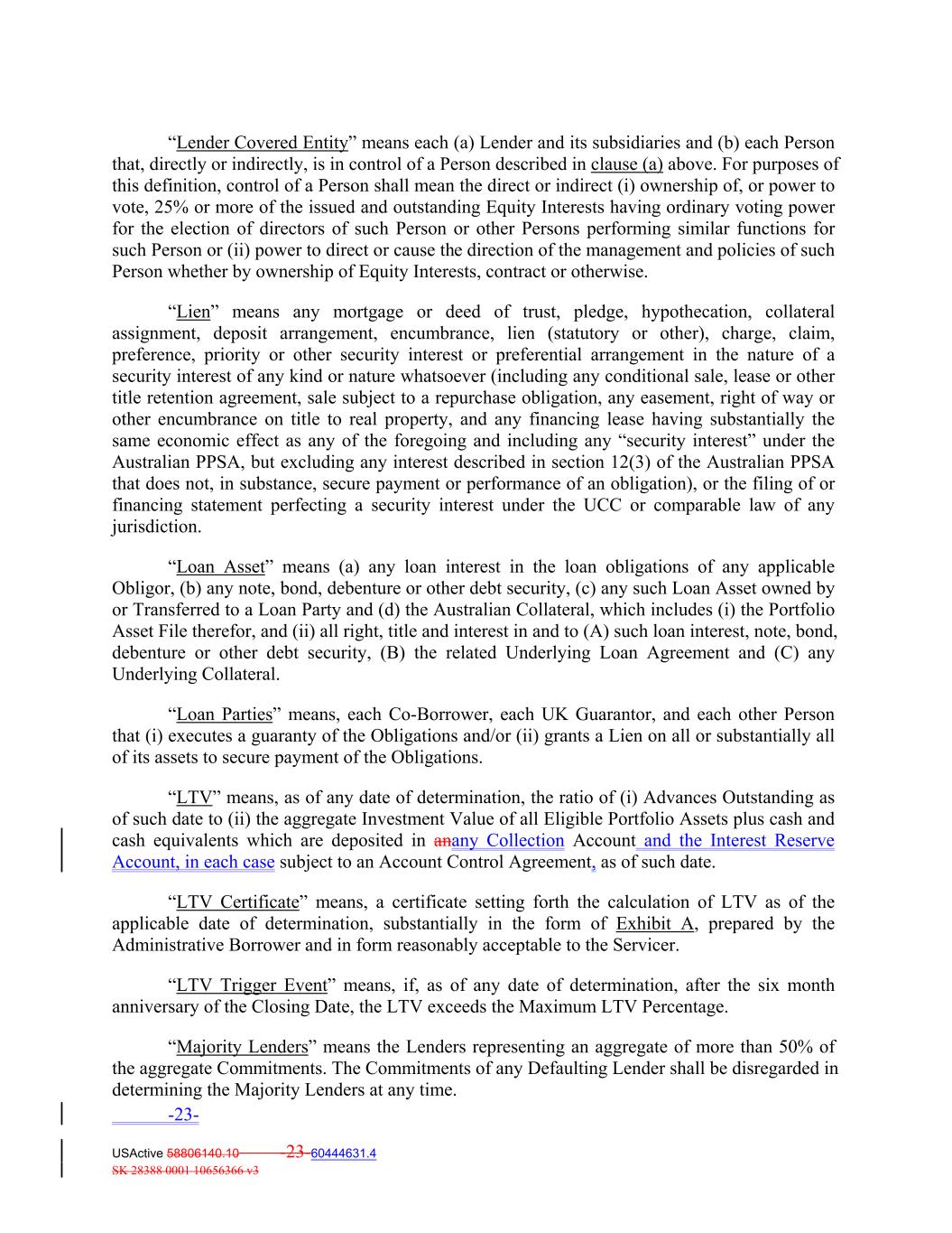 “Lender Covered Entity” means each (a) Lender and its subsidiaries and (b) each Person that, directly or indirectly, is in control of a Person described in clause (a) above. For purposes of this definition, control of a Person shall mean the direct or indirect (i) ownership of, or power to vote, 25% or more of the issued and outstanding Equity Interests having ordinary voting power for the election of directors of such Person or other Persons performing similar functions for such Person or (ii) power to direct or cause the direction of the management and policies of such Person whether by ownership of Equity Interests, contract or otherwise. “Lien” means any mortgage or deed of trust, pledge, hypothecation, collateral assignment, deposit arrangement, encumbrance, lien (statutory or other), charge, claim, preference, priority or other security interest or preferential arrangement in the nature of a security interest of any kind or nature whatsoever (including any conditional sale, lease or other title retention agreement, sale subject to a repurchase obligation, any easement, right of way or other encumbrance on title to real property, and any financing lease having substantially the same economic effect as any of the foregoing and including any “security interest” under the Australian PPSA, but excluding any interest described in section 12(3) of the Australian PPSA that does not, in substance, secure payment or performance of an obligation), or the filing of or financing statement perfecting a security interest under the UCC or comparable law of any jurisdiction. “Loan Asset” means (a) any loan interest in the loan obligations of any applicable Obligor, (b) any note, bond, debenture or other debt security, (c) any such Loan Asset owned by or Transferred to a Loan Party and (d) the Australian Collateral, which includes (i) the Portfolio Asset File therefor, and (ii) all right, title and interest in and to (A) such loan interest, note, bond, debenture or other debt security, (B) the related Underlying Loan Agreement and (C) any Underlying Collateral. “Loan Parties” means, each Co‐Borrower, each UK Guarantor, and each other Person that (i) executes a guaranty of the Obligations and/or (ii) grants a Lien on all or substantially all of its assets to secure payment of the Obligations. “LTV” means, as of any date of determination, the ratio of (i) Advances Outstanding as of such date to (ii) the aggregate Investment Value of all Eligible Portfolio Assets plus cash and cash equivalents which are deposited in anany Collection Account and the Interest Reserve Account, in each case subject to an Account Control Agreement, as of such date. “LTV Certificate” means, a certificate setting forth the calculation of LTV as of the applicable date of determination, substantially in the form of Exhibit A, prepared by the Administrative Borrower and in form reasonably acceptable to the Servicer. “LTV Trigger Event” means, if, as of any date of determination, after the six month anniversary of the Closing Date, the LTV exceeds the Maximum LTV Percentage. “Majority Lenders” means the Lenders representing an aggregate of more than 50% of the aggregate Commitments. The Commitments of any Defaulting Lender shall be disregarded in determining the Majority Lenders at any time. -23- USActive 58806140.10 -23-60444631.4 SK 28388 0001 10656366 v3