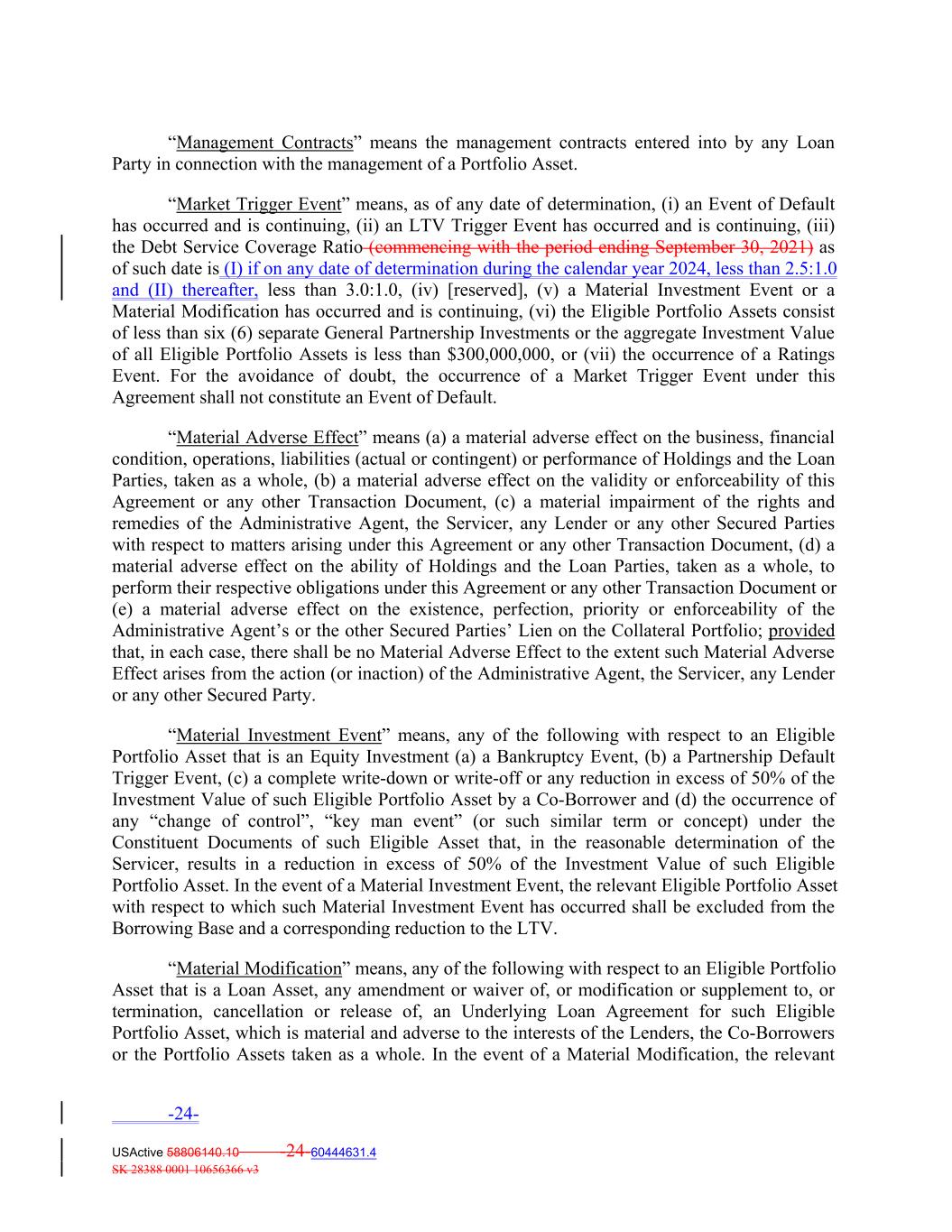 “Management Contracts” means the management contracts entered into by any Loan Party in connection with the management of a Portfolio Asset. “Market Trigger Event” means, as of any date of determination, (i) an Event of Default has occurred and is continuing, (ii) an LTV Trigger Event has occurred and is continuing, (iii) the Debt Service Coverage Ratio (commencing with the period ending September 30, 2021) as of such date is (I) if on any date of determination during the calendar year 2024, less than 2.5:1.0 and (II) thereafter, less than 3.0:1.0, (iv) [reserved], (v) a Material Investment Event or a Material Modification has occurred and is continuing, (vi) the Eligible Portfolio Assets consist of less than six (6) separate General Partnership Investments or the aggregate Investment Value of all Eligible Portfolio Assets is less than $300,000,000, or (vii) the occurrence of a Ratings Event. For the avoidance of doubt, the occurrence of a Market Trigger Event under this Agreement shall not constitute an Event of Default. “Material Adverse Effect” means (a) a material adverse effect on the business, financial condition, operations, liabilities (actual or contingent) or performance of Holdings and the Loan Parties, taken as a whole, (b) a material adverse effect on the validity or enforceability of this Agreement or any other Transaction Document, (c) a material impairment of the rights and remedies of the Administrative Agent, the Servicer, any Lender or any other Secured Parties with respect to matters arising under this Agreement or any other Transaction Document, (d) a material adverse effect on the ability of Holdings and the Loan Parties, taken as a whole, to perform their respective obligations under this Agreement or any other Transaction Document or (e) a material adverse effect on the existence, perfection, priority or enforceability of the Administrative Agent’s or the other Secured Parties’ Lien on the Collateral Portfolio; provided that, in each case, there shall be no Material Adverse Effect to the extent such Material Adverse Effect arises from the action (or inaction) of the Administrative Agent, the Servicer, any Lender or any other Secured Party. “Material Investment Event” means, any of the following with respect to an Eligible Portfolio Asset that is an Equity Investment (a) a Bankruptcy Event, (b) a Partnership Default Trigger Event, (c) a complete write‐down or write‐off or any reduction in excess of 50% of the Investment Value of such Eligible Portfolio Asset by a Co‐Borrower and (d) the occurrence of any “change of control”, “key man event” (or such similar term or concept) under the Constituent Documents of such Eligible Asset that, in the reasonable determination of the Servicer, results in a reduction in excess of 50% of the Investment Value of such Eligible Portfolio Asset. In the event of a Material Investment Event, the relevant Eligible Portfolio Asset with respect to which such Material Investment Event has occurred shall be excluded from the Borrowing Base and a corresponding reduction to the LTV. “Material Modification” means, any of the following with respect to an Eligible Portfolio Asset that is a Loan Asset, any amendment or waiver of, or modification or supplement to, or termination, cancellation or release of, an Underlying Loan Agreement for such Eligible Portfolio Asset, which is material and adverse to the interests of the Lenders, the Co‐Borrowers or the Portfolio Assets taken as a whole. In the event of a Material Modification, the relevant -24- USActive 58806140.10 -24-60444631.4 SK 28388 0001 10656366 v3
