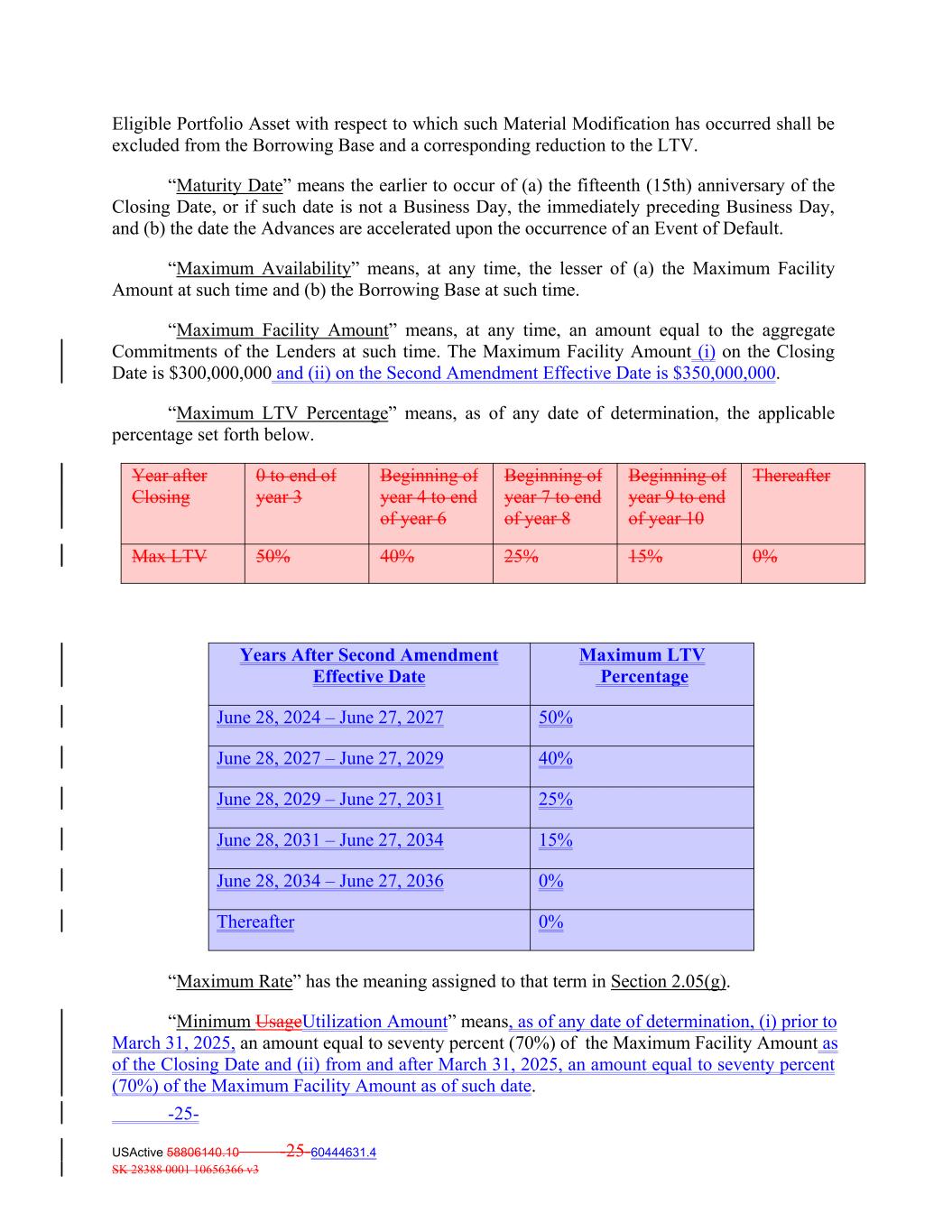 -25- USActive 58806140.10 -25-60444631.4 SK 28388 0001 10656366 v3 Maximum LTV Percentage June 28, 2024 – June 27, 2027 0 to end of year 3 50% Max LTV Eligible Portfolio Asset with respect to which such Material Modification has occurred shall be excluded from the Borrowing Base and a corresponding reduction to the LTV. “Maturity Date” means the earlier to occur of (a) the fifteenth (15th) anniversary of the Closing Date, or if such date is not a Business Day, the immediately preceding Business Day, and (b) the date the Advances are accelerated upon the occurrence of an Event of Default. “Maximum Availability” means, at any time, the lesser of (a) the Maximum Facility Amount at such time and (b) the Borrowing Base at such time. “Maximum Facility Amount” means, at any time, an amount equal to the aggregate Commitments of the Lenders at such time. The Maximum Facility Amount (i) on the Closing Date is $300,000,000 and (ii) on the Second Amendment Effective Date is $350,000,000. “Maximum LTV Percentage” means, as of any date of determination, the applicable percentage set forth below. June 28, 2027 – June 27, 2029 50% 40% Beginning of year 4 to end of year 6 40% June 28, 2029 – June 27, 2031 25% 25% Beginning of year 7 to end of year 8 June 28, 2031 – June 27, 2034 15% 15% 0% June 28, 2034 – June 27, 2036 Beginning of year 9 to end of year 10 0% Thereafter Year after Closing 0% Years After Second Amendment Effective Date “Maximum Rate” has the meaning assigned to that term in Section 2.05(g). “Minimum UsageUtilization Amount” means, as of any date of determination, (i) prior to March 31, 2025, an amount equal to seventy percent (70%) of the Maximum Facility Amount as of the Closing Date and (ii) from and after March 31, 2025, an amount equal to seventy percent (70%) of the Maximum Facility Amount as of such date. Thereafter