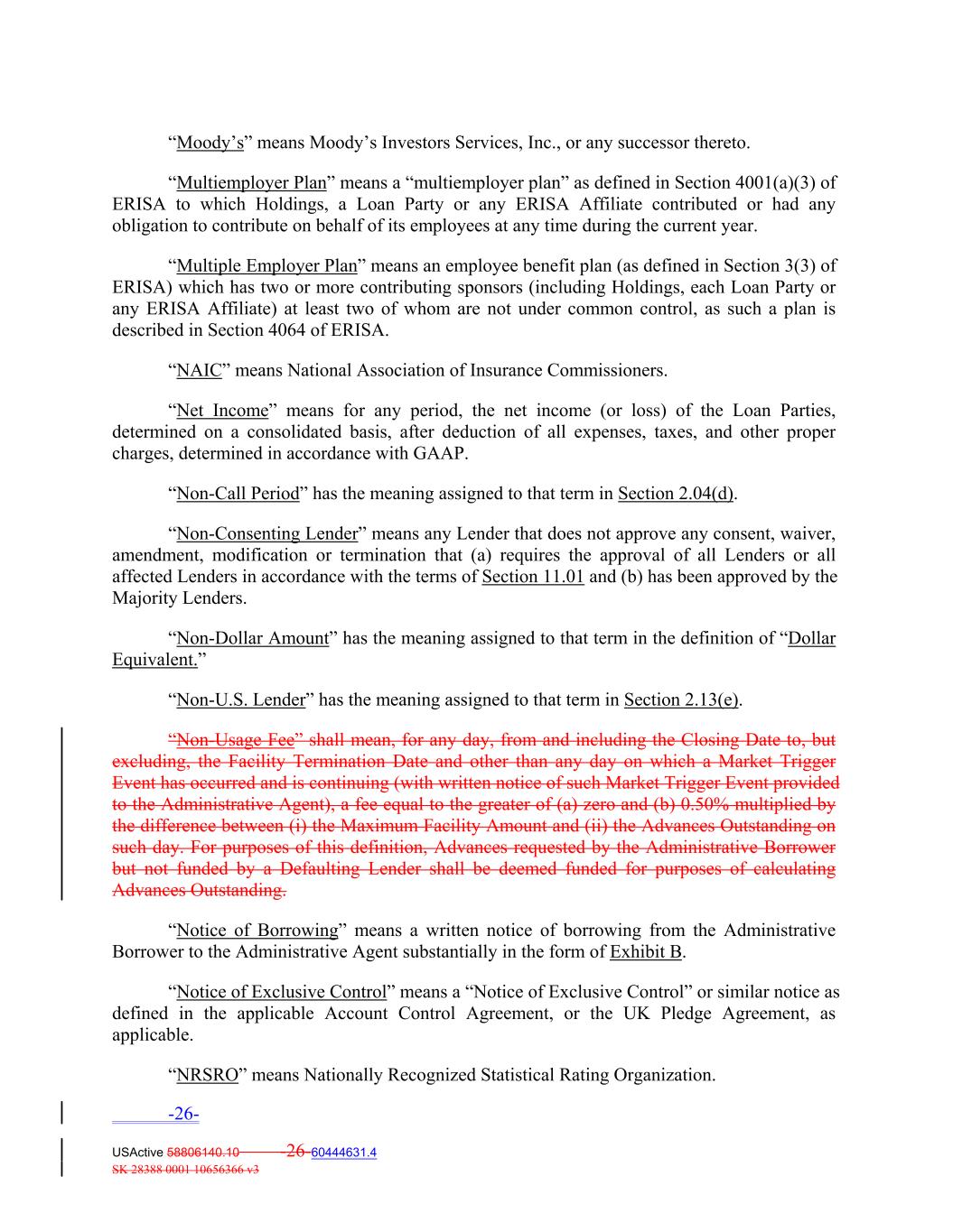 “Moody’s” means Moody’s Investors Services, Inc., or any successor thereto. “Multiemployer Plan” means a “multiemployer plan” as defined in Section 4001(a)(3) of ERISA to which Holdings, a Loan Party or any ERISA Affiliate contributed or had any obligation to contribute on behalf of its employees at any time during the current year. “Multiple Employer Plan” means an employee benefit plan (as defined in Section 3(3) of ERISA) which has two or more contributing sponsors (including Holdings, each Loan Party or any ERISA Affiliate) at least two of whom are not under common control, as such a plan is described in Section 4064 of ERISA. “NAIC” means National Association of Insurance Commissioners. “Net Income” means for any period, the net income (or loss) of the Loan Parties, determined on a consolidated basis, after deduction of all expenses, taxes, and other proper charges, determined in accordance with GAAP. “Non‐Call Period” has the meaning assigned to that term in Section 2.04(d). “Non‐Consenting Lender” means any Lender that does not approve any consent, waiver, amendment, modification or termination that (a) requires the approval of all Lenders or all affected Lenders in accordance with the terms of Section 11.01 and (b) has been approved by the Majority Lenders. “Non‐Dollar Amount” has the meaning assigned to that term in the definition of “Dollar Equivalent.” “Non‐U.S. Lender” has the meaning assigned to that term in Section 2.13(e). “Non‐Usage Fee” shall mean, for any day, from and including the Closing Date to, but excluding, the Facility Termination Date and other than any day on which a Market Trigger Event has occurred and is continuing (with written notice of such Market Trigger Event provided to the Administrative Agent), a fee equal to the greater of (a) zero and (b) 0.50% multiplied by the difference between (i) the Maximum Facility Amount and (ii) the Advances Outstanding on such day. For purposes of this definition, Advances requested by the Administrative Borrower but not funded by a Defaulting Lender shall be deemed funded for purposes of calculating Advances Outstanding. “Notice of Borrowing” means a written notice of borrowing from the Administrative Borrower to the Administrative Agent substantially in the form of Exhibit B. “Notice of Exclusive Control” means a “Notice of Exclusive Control” or similar notice as defined in the applicable Account Control Agreement, or the UK Pledge Agreement, as applicable. “NRSRO” means Nationally Recognized Statistical Rating Organization. -26- USActive 58806140.10 -26-60444631.4 SK 28388 0001 10656366 v3