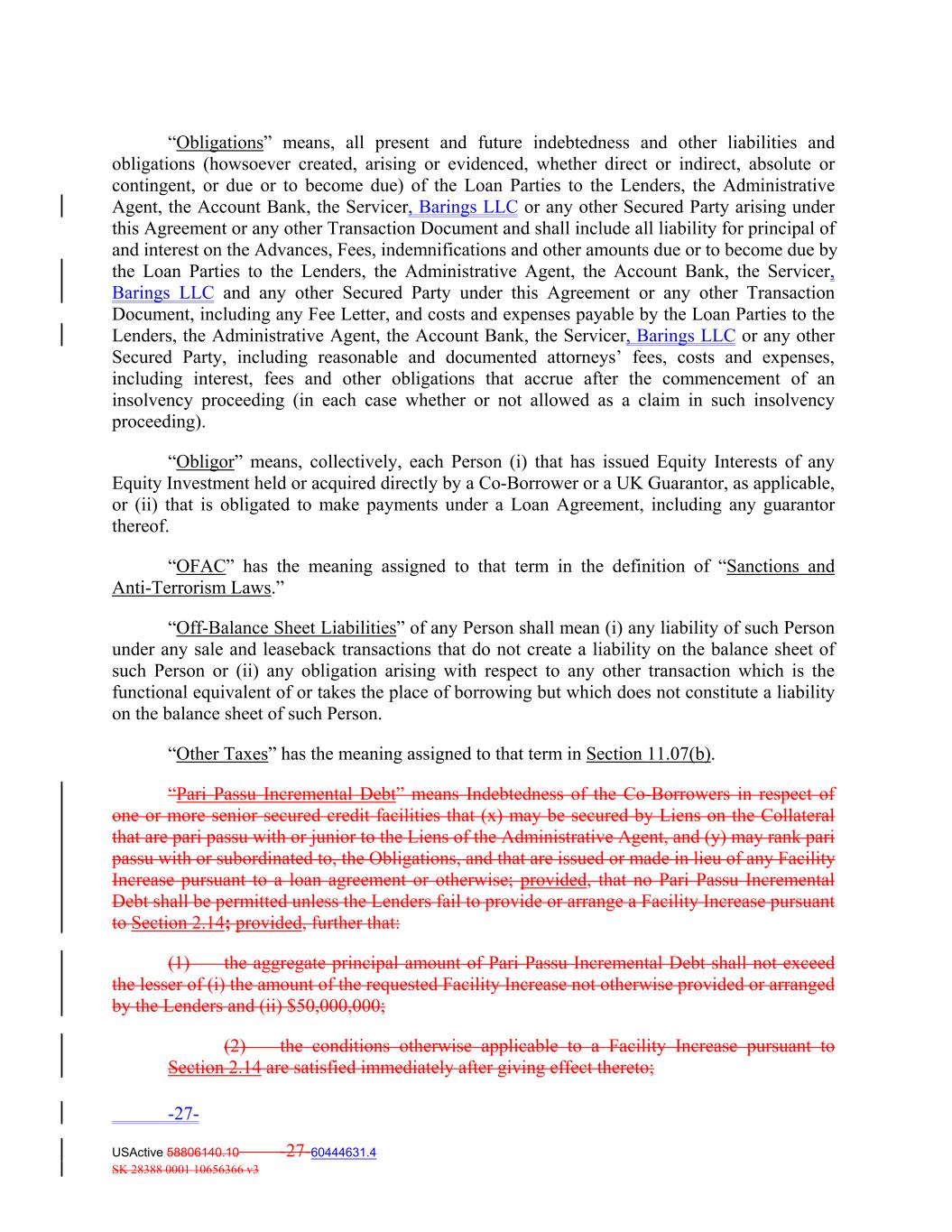“Obligations” means, all present and future indebtedness and other liabilities and obligations (howsoever created, arising or evidenced, whether direct or indirect, absolute or contingent, or due or to become due) of the Loan Parties to the Lenders, the Administrative Agent, the Account Bank, the Servicer, Barings LLC or any other Secured Party arising under this Agreement or any other Transaction Document and shall include all liability for principal of and interest on the Advances, Fees, indemnifications and other amounts due or to become due by the Loan Parties to the Lenders, the Administrative Agent, the Account Bank, the Servicer, Barings LLC and any other Secured Party under this Agreement or any other Transaction Document, including any Fee Letter, and costs and expenses payable by the Loan Parties to the Lenders, the Administrative Agent, the Account Bank, the Servicer, Barings LLC or any other Secured Party, including reasonable and documented attorneys’ fees, costs and expenses, including interest, fees and other obligations that accrue after the commencement of an insolvency proceeding (in each case whether or not allowed as a claim in such insolvency proceeding). “Obligor” means, collectively, each Person (i) that has issued Equity Interests of any Equity Investment held or acquired directly by a Co‐Borrower or a UK Guarantor, as applicable, or (ii) that is obligated to make payments under a Loan Agreement, including any guarantor thereof. “OFAC” has the meaning assigned to that term in the definition of “Sanctions and Anti‐Terrorism Laws.” “Off‐Balance Sheet Liabilities” of any Person shall mean (i) any liability of such Person under any sale and leaseback transactions that do not create a liability on the balance sheet of such Person or (ii) any obligation arising with respect to any other transaction which is the functional equivalent of or takes the place of borrowing but which does not constitute a liability on the balance sheet of such Person. “Other Taxes” has the meaning assigned to that term in Section 11.07(b). “Pari Passu Incremental Debt” means Indebtedness of the Co‐Borrowers in respect of one or more senior secured credit facilities that (x) may be secured by Liens on the Collateral that are pari passu with or junior to the Liens of the Administrative Agent, and (y) may rank pari passu with or subordinated to, the Obligations, and that are issued or made in lieu of any Facility Increase pursuant to a loan agreement or otherwise; provided, that no Pari Passu Incremental Debt shall be permitted unless the Lenders fail to provide or arrange a Facility Increase pursuant to Section 2.14; provided, further that: (1) the aggregate principal amount of Pari Passu Incremental Debt shall not exceed the lesser of (i) the amount of the requested Facility Increase not otherwise provided or arranged by the Lenders and (ii) $50,000,000; (2) the conditions otherwise applicable to a Facility Increase pursuant to Section 2.14 are satisfied immediately after giving effect thereto; -27- USActive 58806140.10 -27-60444631.4 SK 28388 0001 10656366 v3