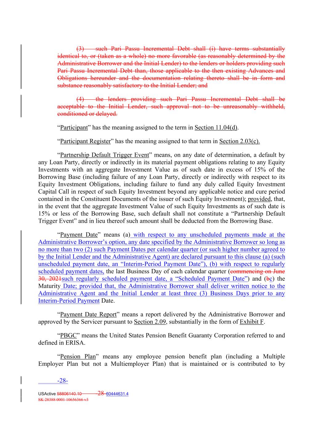 (3) such Pari Passu Incremental Debt shall (i) have terms substantially identical to, or (taken as a whole) no more favorable (as reasonably determined by the Administrative Borrower and the Initial Lender) to the lenders or holders providing such Pari Passu Incremental Debt than, those applicable to the then existing Advances and Obligations hereunder and the documentation relating thereto shall be in form and substance reasonably satisfactory to the Initial Lender; and (4) the lenders providing such Pari Passu Incremental Debt shall be acceptable to the Initial Lender, such approval not to be unreasonably withheld, conditioned or delayed. “Participant” has the meaning assigned to the term in Section 11.04(d). “Participant Register” has the meaning assigned to that term in Section 2.03(c). “Partnership Default Trigger Event” means, on any date of determination, a default by any Loan Party, directly or indirectly in its material payment obligations relating to any Equity Investments with an aggregate Investment Value as of such date in excess of 15% of the Borrowing Base (including failure of any Loan Party, directly or indirectly with respect to its Equity Investment Obligations, including failure to fund any duly called Equity Investment Capital Call in respect of such Equity Investment beyond any applicable notice and cure period contained in the Constituent Documents of the issuer of such Equity Investment); provided, that, in the event that the aggregate Investment Value of such Equity Investments as of such date is 15% or less of the Borrowing Base, such default shall not constitute a “Partnership Default Trigger Event” and in lieu thereof such amount shall be deducted from the Borrowing Base. “Payment Date” means (a) with respect to any unscheduled payments made at the Administrative Borrower’s option, any date specified by the Administrative Borrower so long as no more than two (2) such Payment Dates per calendar quarter (or such higher number agreed to by the Initial Lender and the Administrative Agent) are declared pursuant to this clause (a) (such unscheduled payment date, an “Interim-Period Payment Date”), (b) with respect to regularly scheduled payment dates, the last Business Day of each calendar quarter (commencing on June 30, 2021such regularly scheduled payment date, a “Scheduled Payment Date”) and (bc) the Maturity Date; provided that, the Administrative Borrower shall deliver written notice to the Administrative Agent and the Initial Lender at least three (3) Business Days prior to any Interim-Period Payment Date. “Payment Date Report” means a report delivered by the Administrative Borrower and approved by the Servicer pursuant to Section 2.09, substantially in the form of Exhibit F. “PBGC” means the United States Pension Benefit Guaranty Corporation referred to and defined in ERISA. “Pension Plan” means any employee pension benefit plan (including a Multiple Employer Plan but not a Multiemployer Plan) that is maintained or is contributed to by -28- USActive 58806140.10 -28-60444631.4 SK 28388 0001 10656366 v3