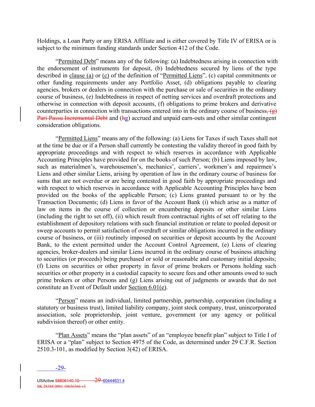 Holdings, a Loan Party or any ERISA Affiliate and is either covered by Title IV of ERISA or is subject to the minimum funding standards under Section 412 of the Code. “Permitted Debt” means any of the following: (a) Indebtedness arising in connection with the endorsement of instruments for deposit, (b) Indebtedness secured by liens of the type described in clause (a) or (c) of the definition of “Permitted Liens”, (c) capital commitments or other funding requirements under any Portfolio Asset, (d) obligations payable to clearing agencies, brokers or dealers in connection with the purchase or sale of securities in the ordinary course of business, (e) Indebtedness in respect of netting services and overdraft protections and otherwise in connection with deposit accounts, (f) obligations to prime brokers and derivative counterparties in connection with transactions entered into in the ordinary course of business, (g) Pari Passu Incremental Debt and (hg) accrued and unpaid earn‐outs and other similar contingent consideration obligations. “Permitted Liens” means any of the following: (a) Liens for Taxes if such Taxes shall not at the time be due or if a Person shall currently be contesting the validity thereof in good faith by appropriate proceedings and with respect to which reserves in accordance with Applicable Accounting Principles have provided for on the books of such Person; (b) Liens imposed by law, such as materialmen’s, warehousemen’s, mechanics’, carriers’, workmen’s and repairmen’s Liens and other similar Liens, arising by operation of law in the ordinary course of business for sums that are not overdue or are being contested in good faith by appropriate proceedings and with respect to which reserves in accordance with Applicable Accounting Principles have been provided on the books of the applicable Person; (c) Liens granted pursuant to or by the Transaction Documents; (d) Liens in favor of the Account Bank (i) which arise as a matter of law on items in the course of collection or encumbering deposits or other similar Liens (including the right to set off), (ii) which result from contractual rights of set off relating to the establishment of depository relations with such financial institution or relate to pooled deposit or sweep accounts to permit satisfaction of overdraft or similar obligations incurred in the ordinary course of business, or (iii) routinely imposed on securities or deposit accounts by the Account Bank, to the extent permitted under the Account Control Agreement, (e) Liens of clearing agencies, broker‐dealers and similar Liens incurred in the ordinary course of business attaching to securities (or proceeds) being purchased or sold or reasonable and customary initial deposits; (f) Liens on securities or other property in favor of prime brokers or Persons holding such securities or other property in a custodial capacity to secure fees and other amounts owed to such prime brokers or other Persons and (g) Liens arising out of judgments or awards that do not constitute an Event of Default under Section 6.01(e). “Person” means an individual, limited partnership, partnership, corporation (including a statutory or business trust), limited liability company, joint stock company, trust, unincorporated association, sole proprietorship, joint venture, government (or any agency or political subdivision thereof) or other entity. “Plan Assets” means the “plan assets” of an “employee benefit plan” subject to Title I of ERISA or a “plan” subject to Section 4975 of the Code, as determined under 29 C.F.R. Section 2510.3‐101, as modified by Section 3(42) of ERISA. -29- USActive 58806140.10 -29-60444631.4 SK 28388 0001 10656366 v3